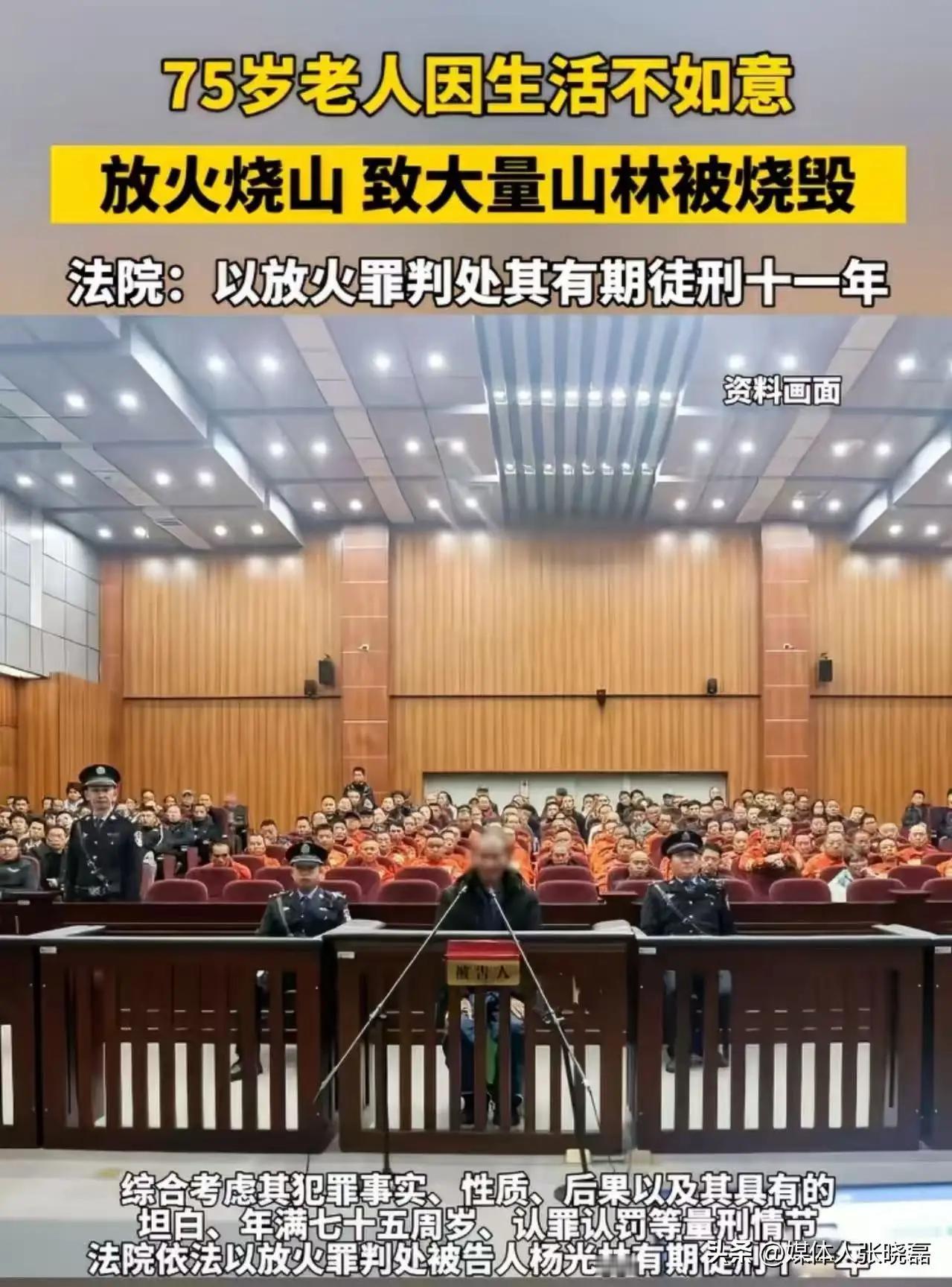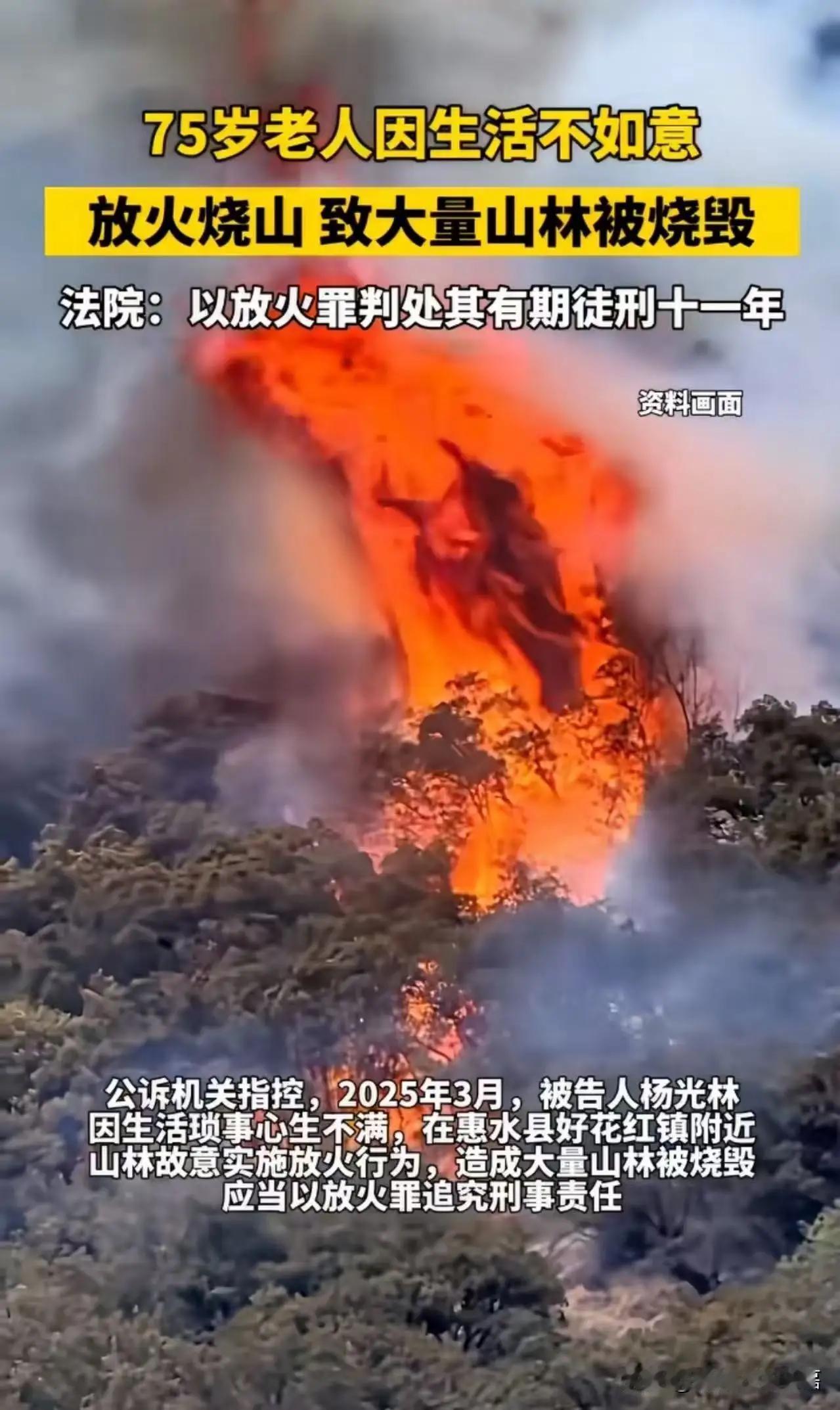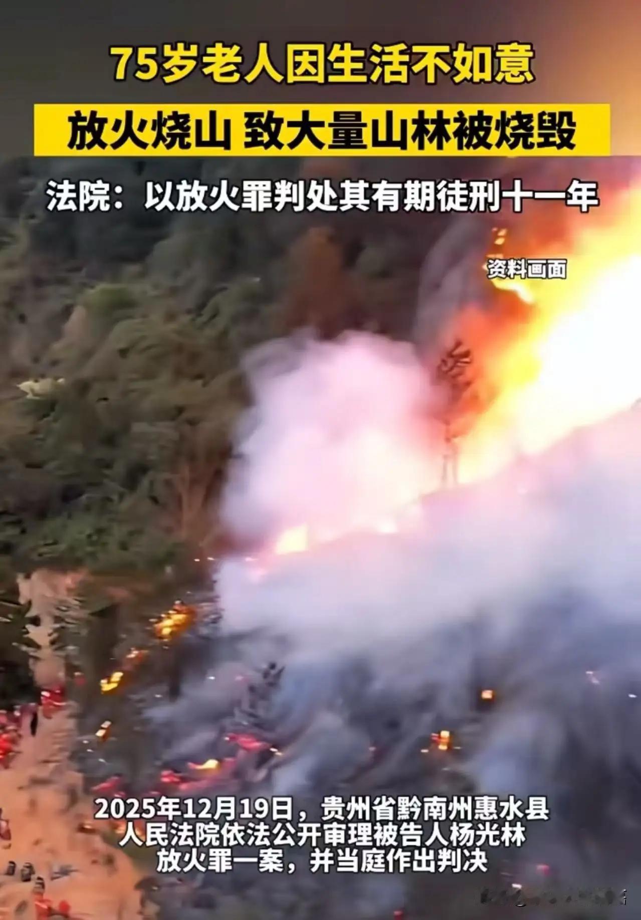 75岁老人因为生活不如意,放火烧身,导致大量山林被烧毁!法院:以放火罪判处有其徒刑十一年!网友炸锅,有网友说,叛的好,自己活的失败,干嘛拿青山绿水出气!也有网友说,如果他有万元退休金,打死也不会有干这事! 公诉机关指控,在2025年3月,被告人杨光林因为生活里的一些琐碎小事,心里憋了一肚子气,在惠水县icon好花红镇附近的山林里,故意实施了放火行为。 这场大火熊熊燃烧,大量山林被无情地烧毁,原本郁郁葱葱的山林变得满目疮痍,生态环境遭受了巨大的破坏。公诉机关认为,杨光林的行为应当以放火罪追究其刑事责任icon。 在法庭上,杨光林当庭表示认罪悔罪。法院在审理过程中,综合考虑了他犯罪的事实、性质以及造成的严重后果,同时也考虑到他具有坦白情节,而且已经年满七十五周岁等特殊情况,最终以放火罪判处杨光林有期徒刑十一年。 这起看似普通的火灾,却牵扯出一场关于人生、关于社会、关于环境的深刻反思。75岁的老人杨光林,因为生活的挫折与不满,选择用一场大火来宣泄心中的苦涩。或许有人会觉得他的行为“叛的好”,甚至有人嘲笑“自己活得失败,干嘛拿青山绿水出气”。但当我们站在这个事件的背后,是否也该静下心来思考:一个年迈的老人,为何会走到这一步?他心中那点点滴滴的委屈,又有多少人能真正理解? 有人说,他的行为是极端的反抗,是对现实的绝望;有人则认为,他的火焰点燃的不仅是山林,更是我们这个社会的隐痛。我们是不是也在无形中制造了太多的“杨光林”?当生活压力、家庭琐事、社会不公逐渐堆积,难道就没有一个出口?还是说,我们都习惯了用指责和法律的铁律来掩盖那些被忽视的角落? 更令人扼腕的是,网友们的评论也反映出社会的两极:有人认为“叛的好”,有人则愤怒地谴责“毁灭生态环境的罪行”。这背后,是对公平的期待,对人性的关怀。难道我们就不能在惩罚的同时,给予更多的理解和关怀?毕竟,一个75岁的老人,背负了多少岁月的苦难?他的火焰,是不是也在呼唤我们对弱势群体的关注? 法院最终判处他十一年的刑期,或许是法律的公正,但也难免让人感到惋惜。惋惜一个曾经可以被温暖包裹的生命,最终走向了这样一条孤独而悲凉的道路。这场火灾,或许只是一个极端的个案,但它折射出的是我们社会的某种裂痕。我们需要的,不仅是惩罚,更是理解和预防。 这件事告诉我们:每一个“杨光林”的背后,都藏着一段未被倾听的故事。我们是否也该反思,如何在这个快节奏的社会中,给予老人们更多的关怀?如何让他们在暮年还能找到归属感和尊严?只有这样,或许我们才能避免下一场“火焰”的蔓延。因为,真正的正能量,不是简单的惩罚,而是用心去理解,用爱去弥补那些被忽略的裂缝。头号周刊 放火罪