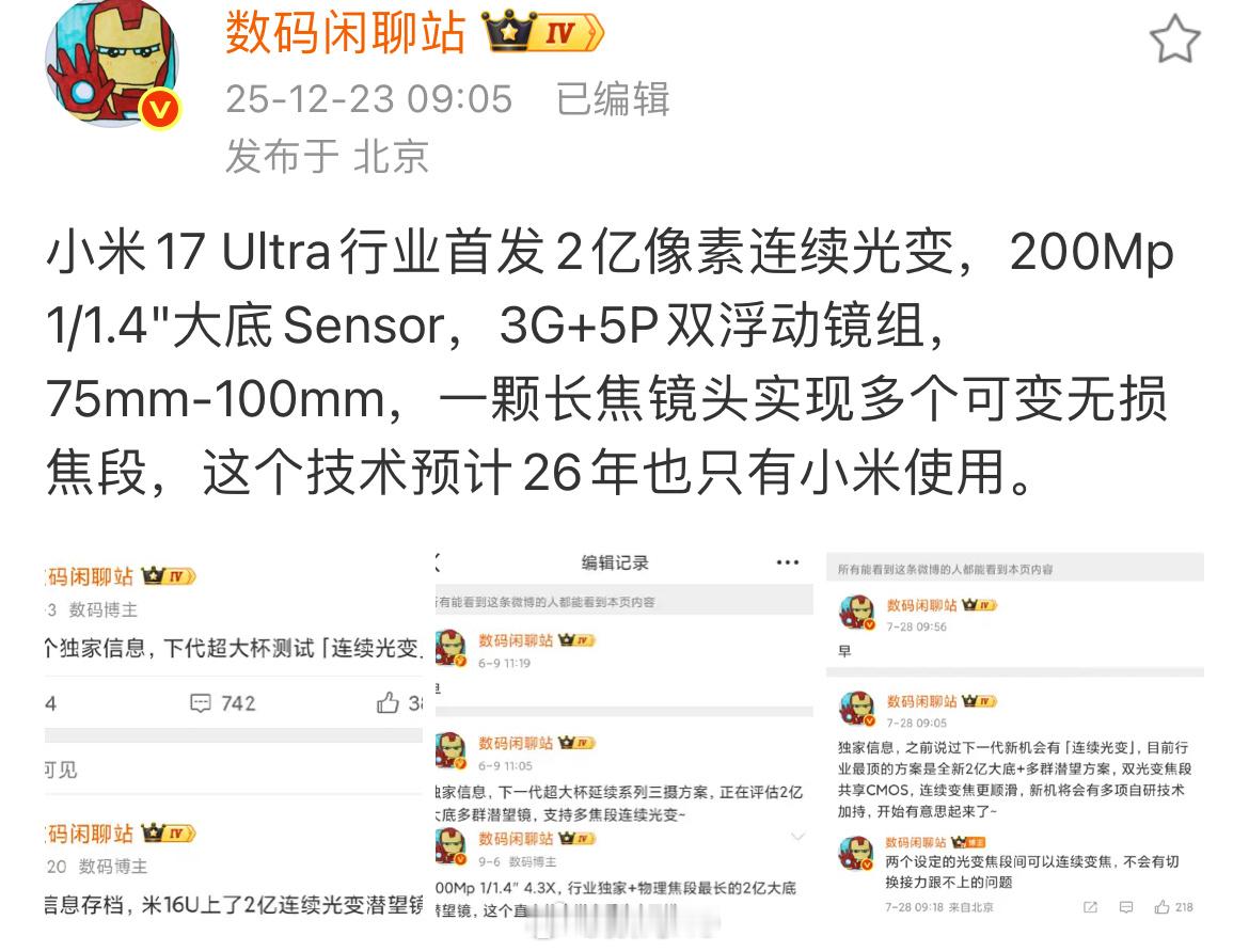 数码闲聊站:这个技术预计26年也只有小米使用。小米17Ultra:徕卡2亿像素光学变焦行业首款徕卡APO光学认证手机镜头3G+5P光学变焦镜组,1/1.4"大底75mm-100mm光学变焦