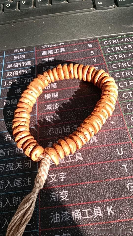 你盘手串多久了? 这个桃核串盘了两年,出门愿意带上。 颜色有点变化,等变红就不知