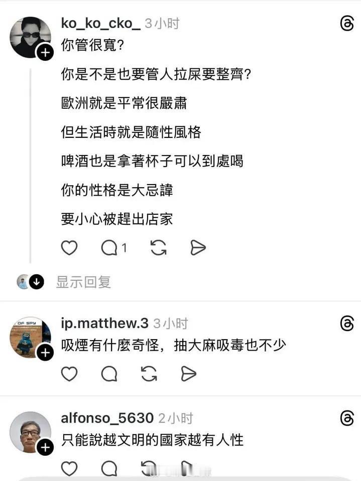 欧洲人在路边或边走边抽烟就行,但大陆就不行,看到4v们这个德性都不知道该怎么吐槽