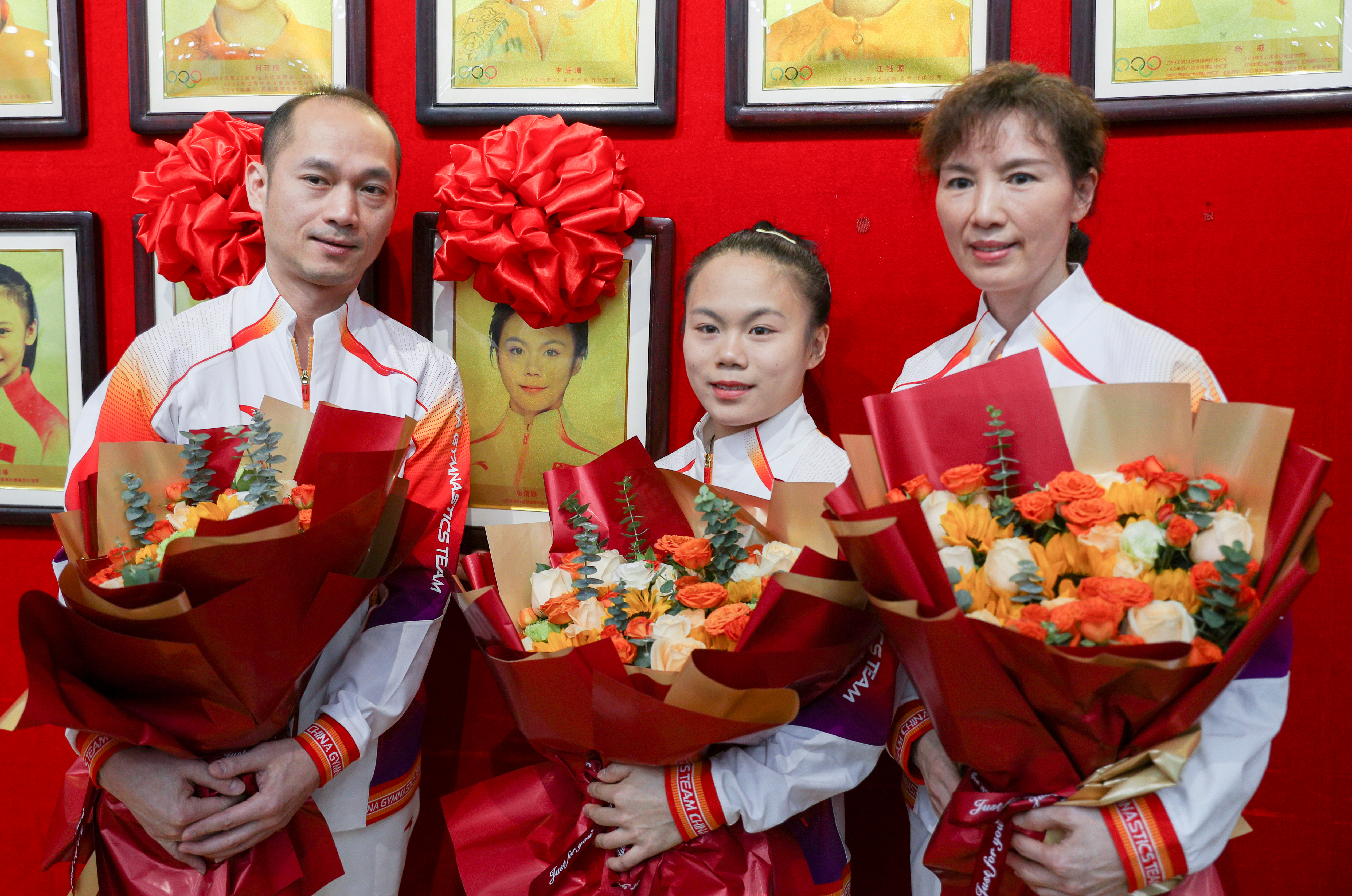 中国体操队在北京国家体育总局训练局体操馆举行世界冠军登榜仪式,洪延明和张清颖成为两位新科冠军,四夺世锦赛男子双杠金牌的老将邹敬园再次登榜。