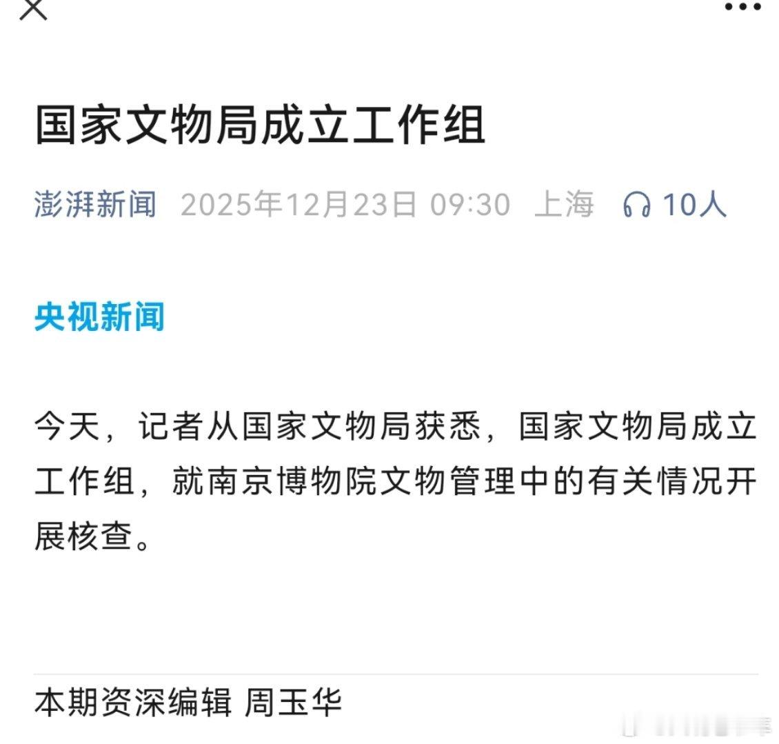 字越少,事越大:国家文物局成立工作组今天,记者从国家文物局获悉,国家文物局成立工作组,就南京博物院文物管理中的有关情况开展核查。官方通报南京博物院事件