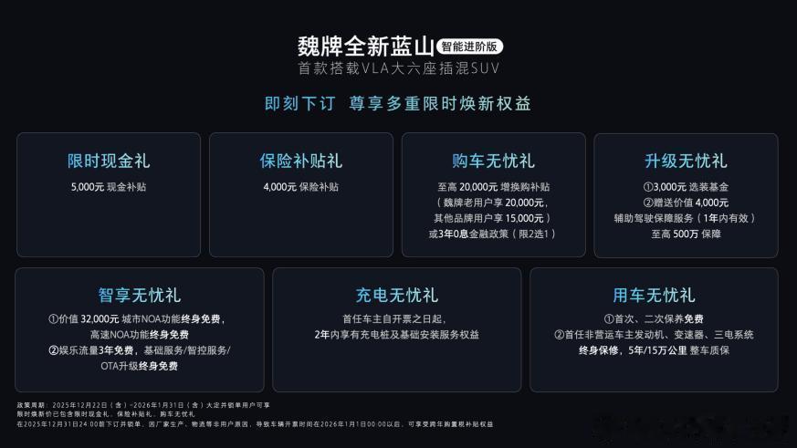 首款搭载VLA大六座插混SUV,魏牌全新蓝山智能进阶版上市 限时焕新27.58万元起12月22日,以“初心不改,为爱进阶”为主题的魏牌全新蓝山智能进阶版上市发布会在保定圆满举行,发布全新蓝山智能进阶版限时焕新价27.58万元起。魏牌全新蓝山智能进阶版定位“首款搭载VLA大六座插混SUV”,不仅融合“听得懂、会思考、能交心”的VLA大模型与“省、远、快、稳”兼备的Hi4性能版智能四驱电混技术,实现了VLA+Hi4的高效协同,更在座舱体验与安全防护等维度实现全面进阶,为用户带来了全方位、可感知的升级体验。车型价格车型版本 统一零售价 限时焕新价 四驱Max 29.98万元 27.58万元 四驱Max+ 31.18万元 28.78万元 四驱Ultra黑武士 32.68万元 30.28万元 限时购车权益(政策周期:2025年12月22日-2026年1月31日,大定并锁单用户可享)• 限时现金礼:5,000元现金补贴• 保险补贴礼:4,000元保险补贴• 购车无忧礼(限2选1):①至高20,000元增换购补贴(魏牌老用户享20,000元,其他品牌用户享15,000元)②3年0息金融政策• 充电无忧礼:首任车主自开票之日起,2年内享有充电桩及基础安装服务权益• 升级无忧礼:①3,000元选装基金;②赠送价值4,000元辅助驾驶保障服务(1年内有效),至高500万保障• 智享无忧礼:①价值32,000元城市NOA功能终身免费、高速NOA功能终身免费;②娱乐流量3年免费,基础服务/智控服务/OTA升级终身免费• 用车无忧礼:①首次、二次保养免费;②首任非营运车主发动机、变速器、三电系统终身保修,5年/15万公里整车质保注:限时焕新价已包含限时现金礼、保险补贴礼、购车无忧礼;2025年12月31日24:00前下订并锁单,若车辆开票时间在2026年1月1日00:00以前,可享受当年购置税补贴权益核心产品亮点1. VLA大模型:有“人味”的智能交互全新蓝山智能进阶版搭载VLA大模型,通过语音控车、CoT推理卡片、防御性驾驶、特殊场景理解四大功能,实现从感知到执行的智能闭环,让辅助驾驶从“机械执行”转向“人性理解”。• 语音控车:支持自然对话交互,如“小魏同学,远离大车”即可主动规划路径拉开安全距离• 防御性驾驶:提前预判风险,主动规避潜在危险• 特殊场景理解:轻松应对施工区、窄路、坑洼路面等复杂场景• CoT推理卡片:实时展示辅助驾驶决策过程,让驾驶动作透明可感• 辅助驾驶小蓝灯:开启辅助驾驶时,通过智能双亮度调节向外界示意车辆状态硬件支撑:搭载算力达700 TOPS的Thor-U芯片,配合27颗智慧传感器,复杂环境下可快速识别潜在风险。2. Hi4性能版智能四驱电混:全场景高效稳定全球首创四挡全速域直驱技术,以“都江堰智慧”实现“因势利导,智能调度”,兼具“省、远、快、稳”四大优势:• 更省:可加92号汽油,馈电油耗低至6.5L/100km• 更远:WLTC至高综合续航里程1343km• 更快:至高总功率422kW、总扭矩822N·m,百公里加速仅需4.9s• 更稳:前后50:50轴荷分配+iTVC智能扭矩矢量控制系统,新增阻尼预瞄+电控减振器黄金组合,提前适配复杂路面3. VLA+Hi4黄金搭档:1+1>2的安全协同VLA作为“领航员”负责理解、预判与规划,Hi4作为“赛车手”负责精准、稳定与高效执行,二者深度融合构建“主动规避”+“主动稳定”双重安全防线,实现从“感知-决策-控制”的全链路协同,覆盖城市通勤、恶劣天气、非铺装路面等全场景出行安全。4. “五好座舱”:平等关怀每位家人坚持“车内没有主次之分”,打造全场景舒适体验:• 空间布局:大六座设计,近1.26m高吊顶,二排双电动腿托(10向电动调节),三排851mm头部空间(4向座椅调节+2向腿托+4向腰托),成人可坐可躺• 舒适配置:主驾8点按摩、副驾零重力座椅(12向电动调节、通风&加热),全系标配电动侧踏(最大承重175kg)• 实用配置:-6℃~50℃ 7L豪华大冰箱,支持冷冻功能• 智能娱乐:Coffee OS 3.4系统,前排双15.6英寸屏幕+二排17.3英寸娱乐屏,23扬声器+2440W功率+7.1.4杜比全景声,支持AI多屏扩画、晕动舒缓显示功能• 材质安全:CIAA认证抗菌皮革、生态肤感NAPPA真皮,VOC婴儿级空气质量控制5. 全维安全守护体系• 被动安全:高强钢与热成型钢应用占比高达81%,热成型钢最高强度达2000Mpa,配备2.7m侧气帘(6s保压时长)• 电池安全:多项测试远超新国标,模拟碰撞强度是国标的2.1~4倍,盐雾腐蚀时长近国标的4.6倍,浸水试验时长为96倍,机械冲击强度达12倍,热扩散观察时长3.57倍,温度冲击范围覆盖-40℃~85℃• 主动安全:搭载30+智能辅助功能,AEB自动紧急制动功能已上车,AES自动紧急避让系统和RAEB将于明年第二季度推送品牌理念与用户认可• 核心使命:用科技、豪华,守护安全(品牌九年未变的底色)• 发展成果:累计赢得60多万个家庭信任,蓝山车型拥有11万+用户• 用户证言:一对夫妇驾驶车辆完成超1.5万公里蜜月之旅(穿越新疆沙漠与西藏无人区),称赞其“可靠感是像风一样的自由”;医疗救援直升机飞行员车主表示,蓝山给予其“航空级的安全感”发布会上,深耕长城汽车20余年的技术老兵赵永坡代表魏牌揭幕新车,魏建军先生诠释“安全是一切豪华的前提”的长期主义理念。未来,全新蓝山智能进阶版将持续以安全与真诚,守护千万家庭出行。