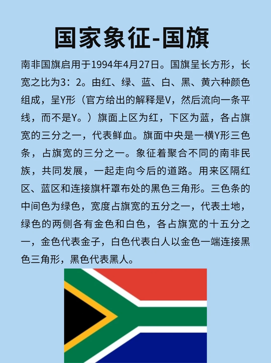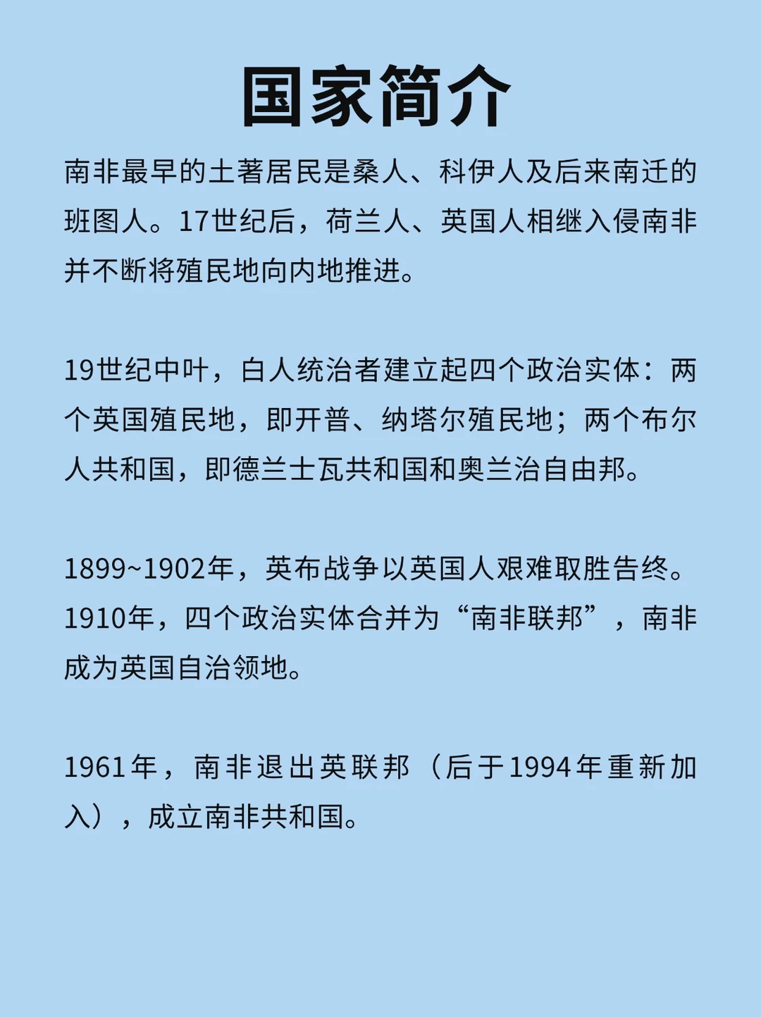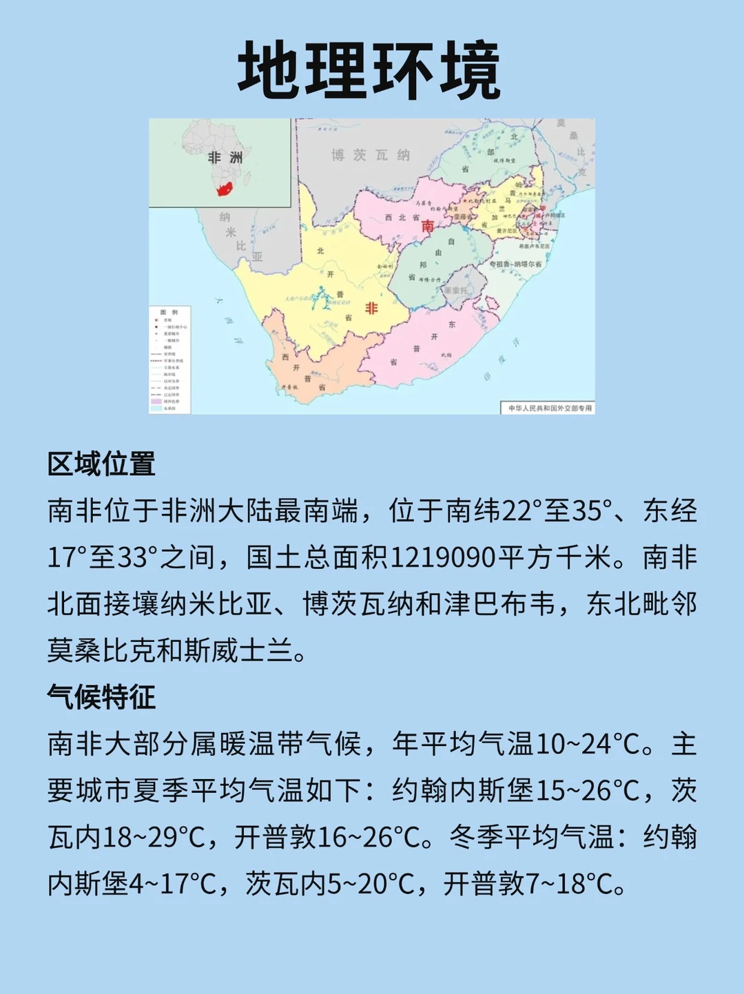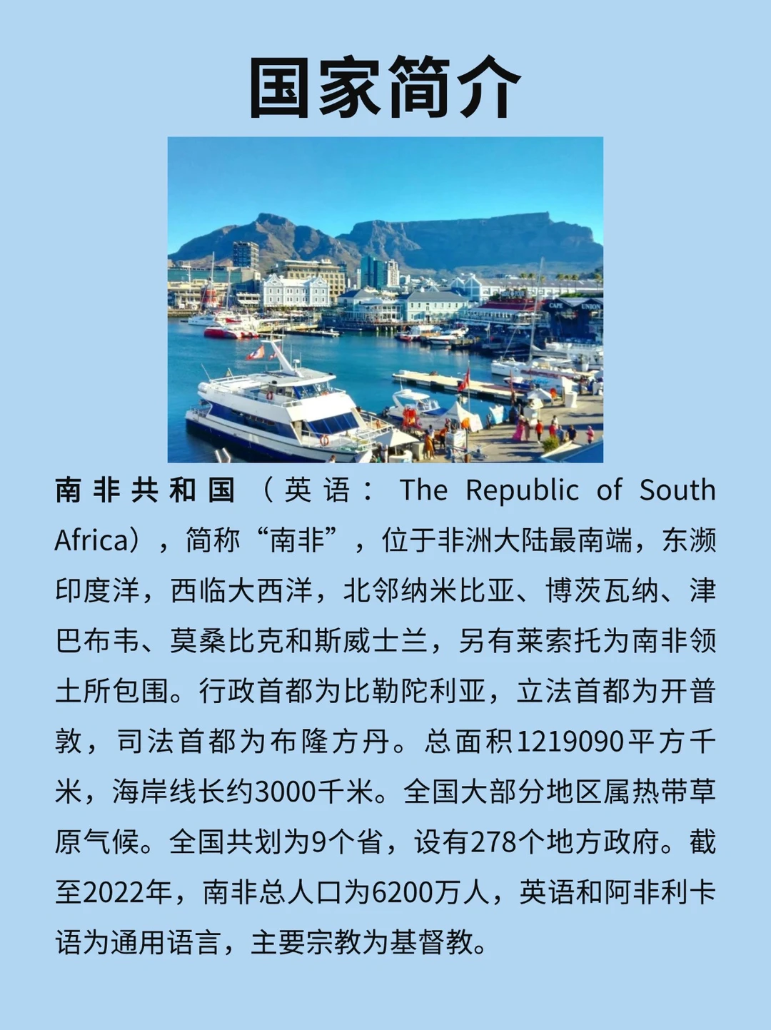 南非共和国(英语:The Republic of South Africa),简称“南非”,位于非洲大陆最南端,东濒印度洋,西临大西洋,北邻纳米比亚、博茨瓦纳、津巴布韦、莫桑比克和斯威士兰,另有莱索托为南非领土所包围。