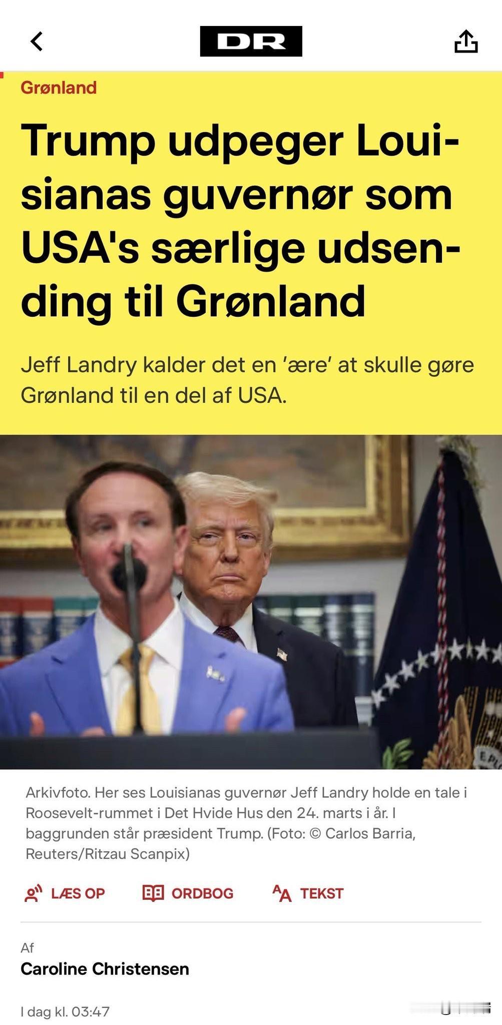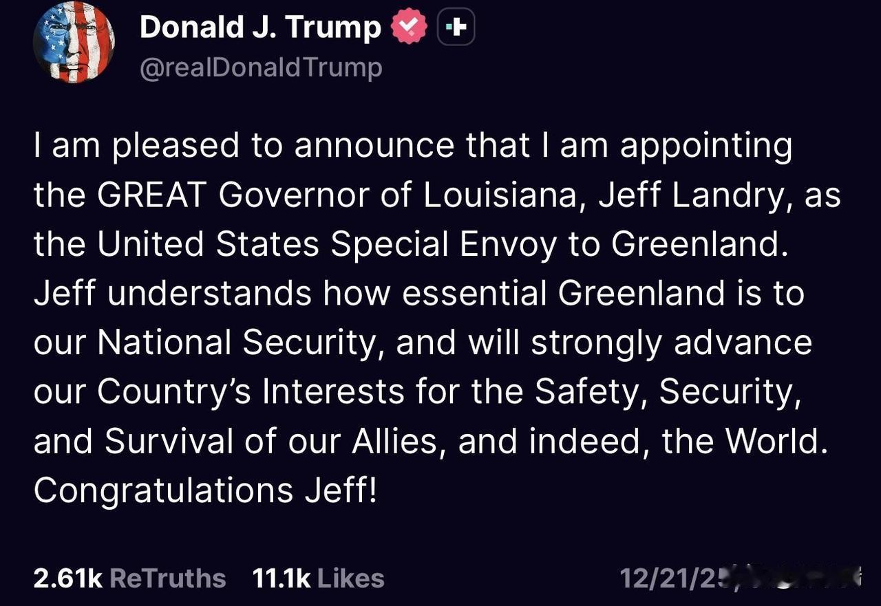 2025年12月21日至22日,美国总统特朗普正式任命路易斯安那州州长杰夫·兰德里 (Jeff Landry) 为美国驻格陵兰特使,这一举动不仅重新点燃了关于美国收购该岛的争议,更引发了丹麦和格陵兰当局的强烈愤怒与外交抗议。 以下是此次事件的核心动态: 1. 美方举措与言论 特使任命: 特朗普称格陵兰岛对美国国家安全“至关重要”,任命兰德里以促进美国的利益。 吞并意图: 兰德里在社交媒体上公开表示,能够以志愿者身份服务并致力于“让格陵兰岛成为美国的一部分”是一种荣幸。 国家安全理由: 特朗普在12月22日的讲话中重申,为了应对中俄在北极地区的活动,美国“必须拥有”格陵兰岛。 2. 丹麦与格陵兰的强烈回应 丹麦外交抗议: 丹麦外交大臣拉斯穆森(Lars Løkke Rasmussen)对此表示“深感不满”和“完全不可接受”,并宣布将召见美国驻丹麦大使要求其作出解释。 主权声明: 丹麦首相弗雷德里克森与格陵兰总理尼尔森发表联合声明,强调格陵兰主权受国际法保护,明确表示“格陵兰不卖”,其未来由格陵兰人自行决定。 防御升级: 为应对美国压力,丹麦已显著增加北极防务预算,包括斥资约91亿美元购买防空系统及增购F-35战斗机。 3. 战略背景 格陵兰岛作为丹麦的自治领土,拥有约5.7万人口,是连接欧洲与北美的战略要地,也是美国导弹防御系统的重要组成部分。自2025年初以来,特朗普政府通过推出相关法案、副总统访格等一系列动作,持续向格陵兰岛施压,试图控制这一资源丰富的北极领土。 欧盟委员会也已发声,表达对丹麦领土完整和主权的高度关注与声援。