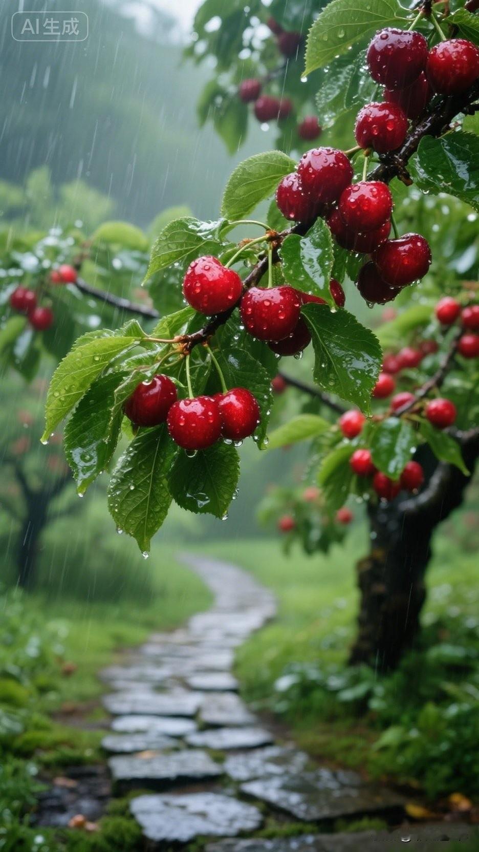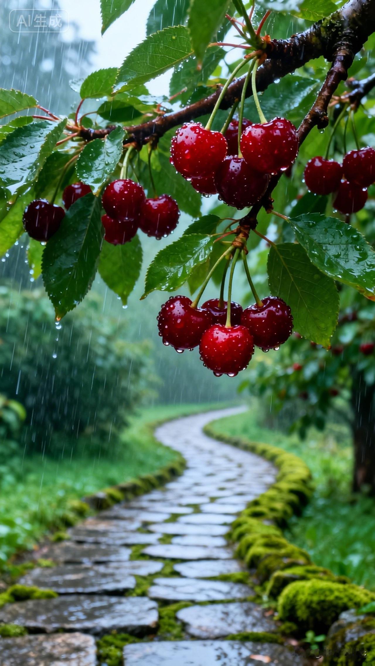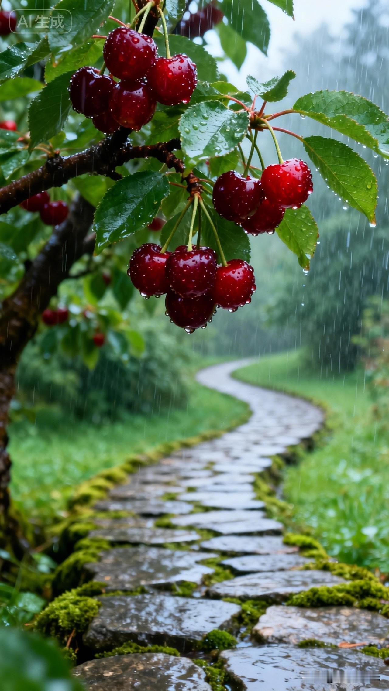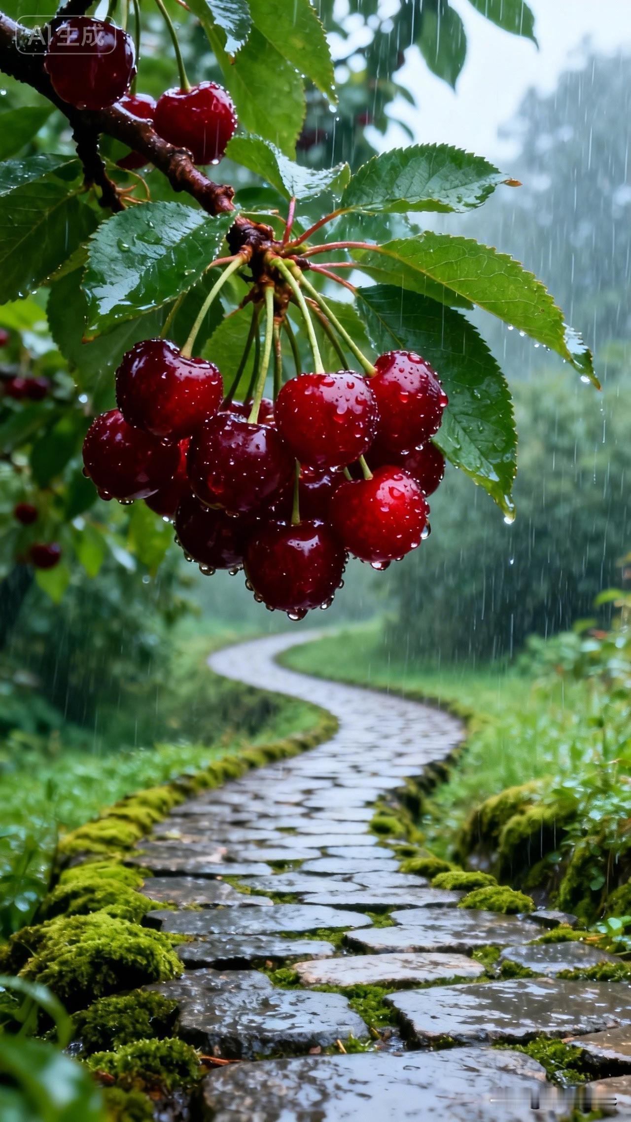 雨巷樱红 雨织青帘覆野丘,石蹊宛转入樱林。 丹珠樱枝凝晓露,翠叶摇风浥细流。 颗颗玲珑承玉液,枝枝绰约惹清愁。 行来不觉沾衣湿,一径果香绕指柔。诗歌雨巷 雨巷飘香 花季雨巷 雨巷氛围感