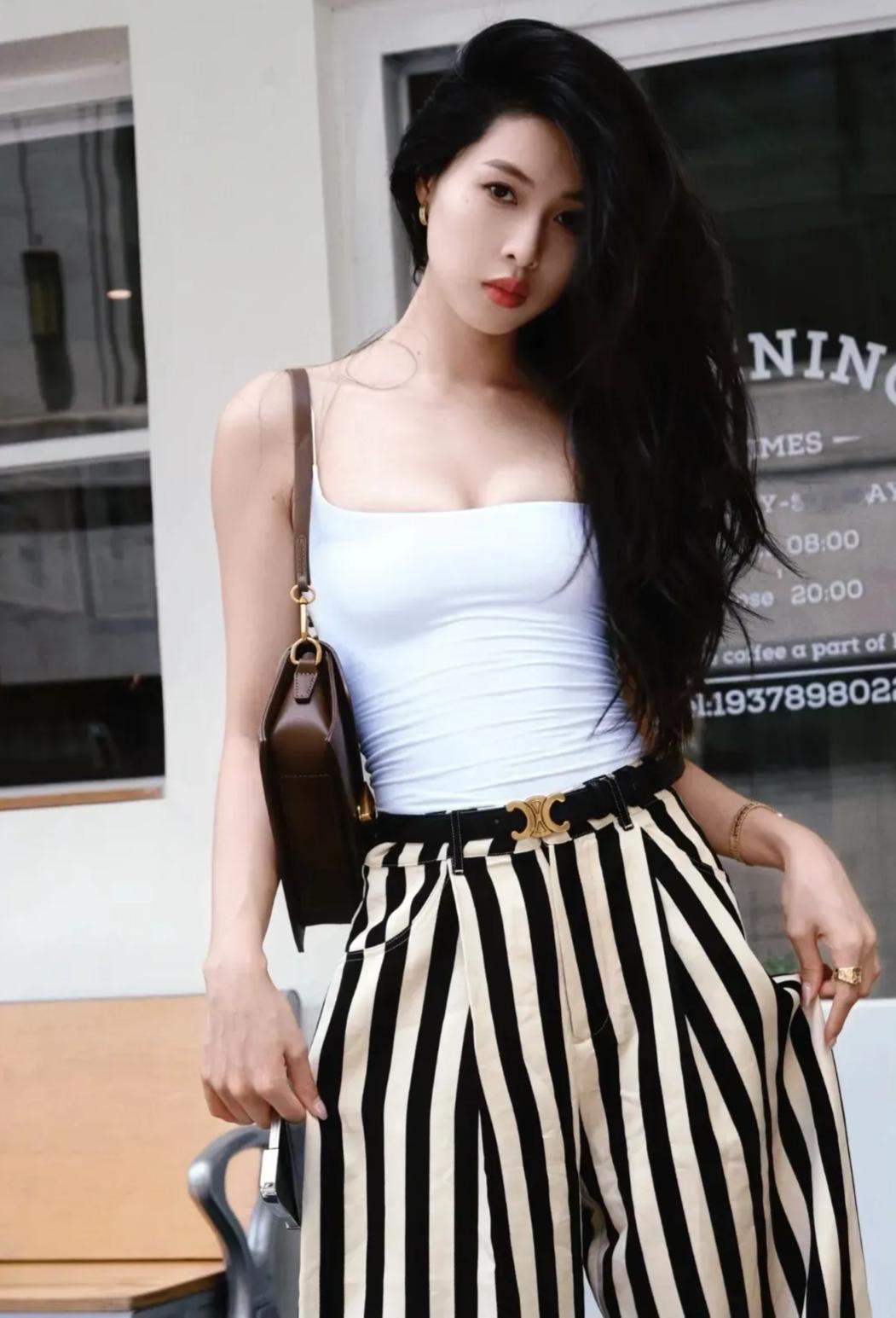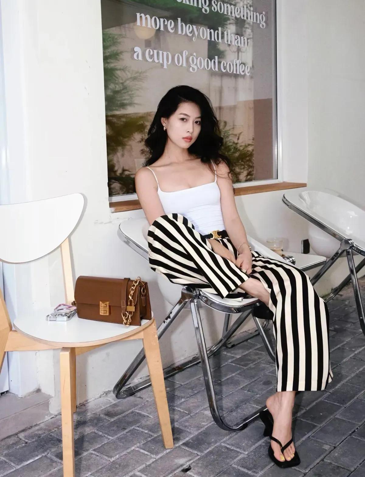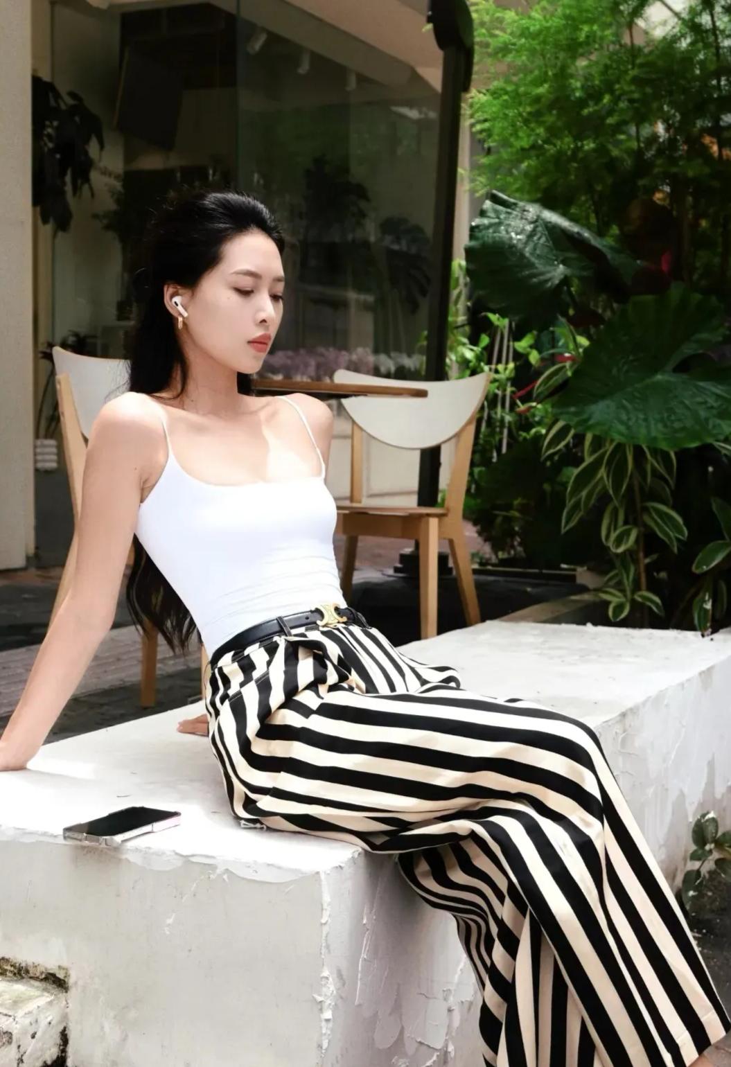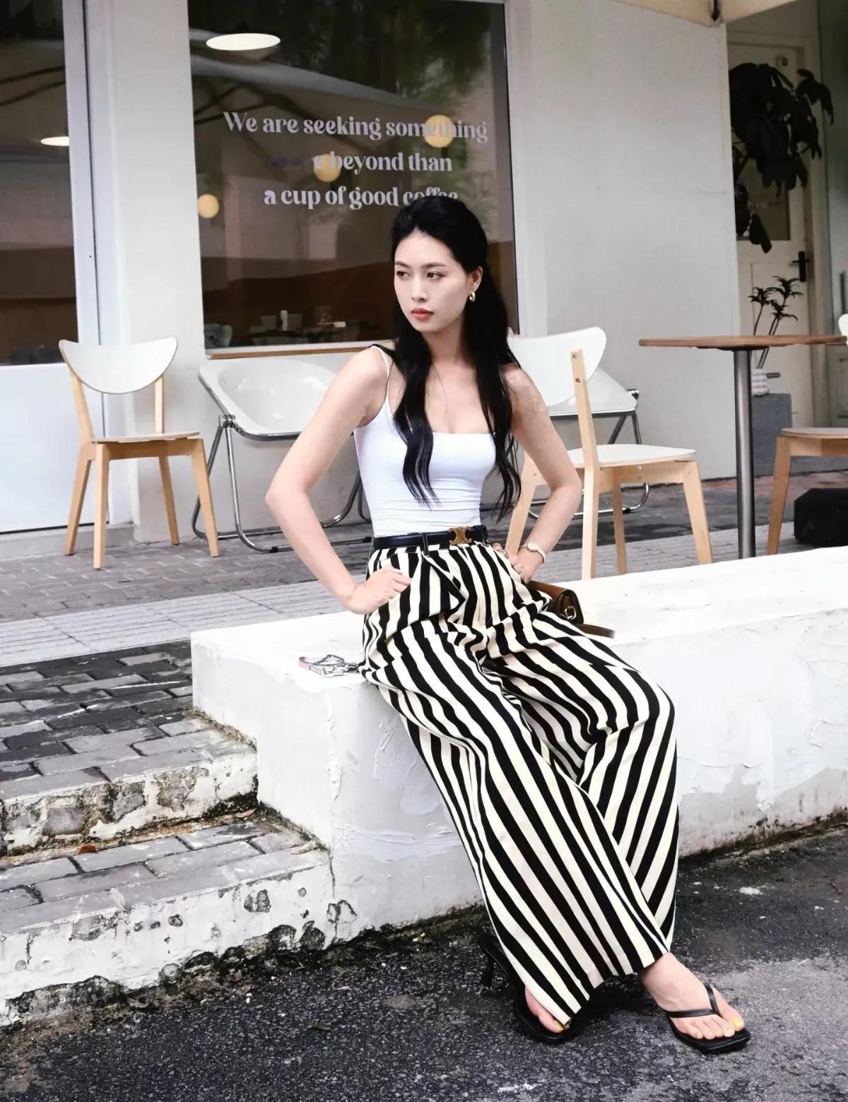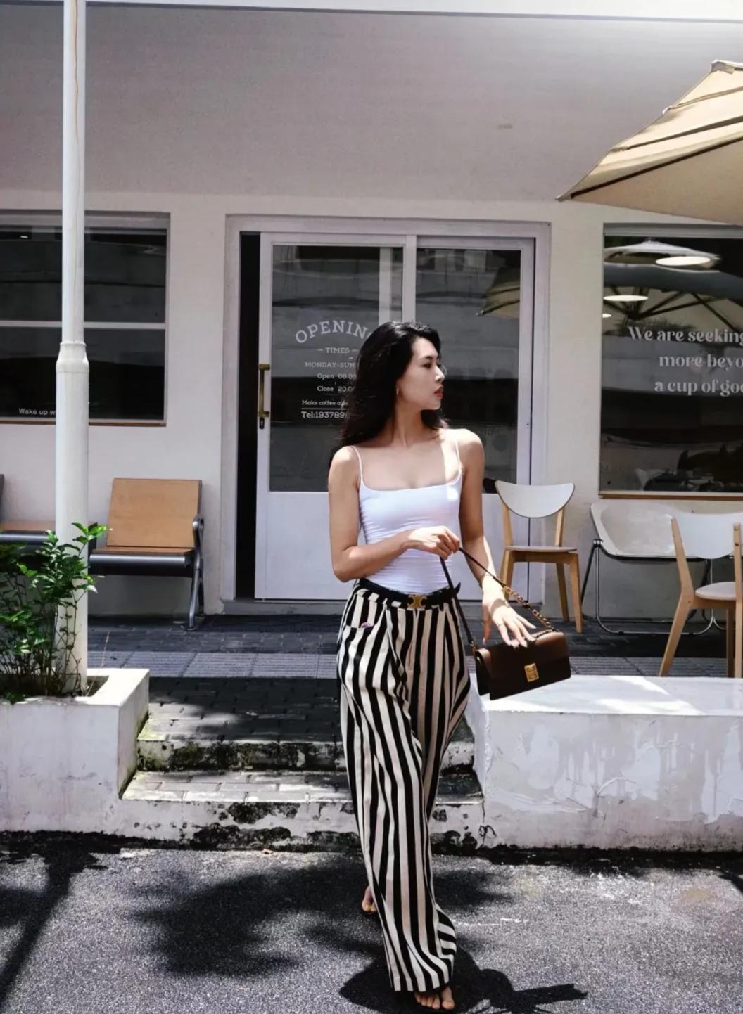 这套穿搭是简约高级的黑白条纹松弛风,用基础款穿出了随性又不失气场的质感。白色吊带+黑白竖条纹阔腿裤的组合,简约又显比例,竖条纹自带显瘦拉长效果,阔腿版型营造出慵懒松弛感;宽腰带强调腰线,避免了宽松裤装的拖沓感。 搭配黑色夹脚高跟鞋注入轻熟气场,平衡了吊带的休闲感;简约配饰点缀,让基础款造型更显精致,适配日常轻社交场合。能充分展现穿着者简约高级的松弛魅力。高级感条纹穿搭