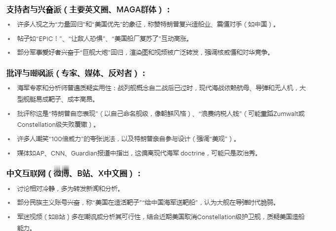 让grok收集整理了一下网络上对于特朗普宣布美国海军将建造新型“Trump-class”(特朗普级)战列舰的反应。 特朗普于12月22日在海湖庄园宣布,美国海军将建造新型“Trump-class”(特朗普级)战列舰,作为其“Golden Fleet”(黄金舰队)计划的核心部分。首舰名为USS Defiant(无畏号),计划先建2艘,最终目标20-25艘。这些战舰被描述为比二战Iowa级更大、更快、威力“100倍”,配备高超音速导弹、核武装海基巡航导弹、电磁轨道炮、激光武器等先进系统。 网上反响非常热烈,迅速成为热点,观点两极分化。