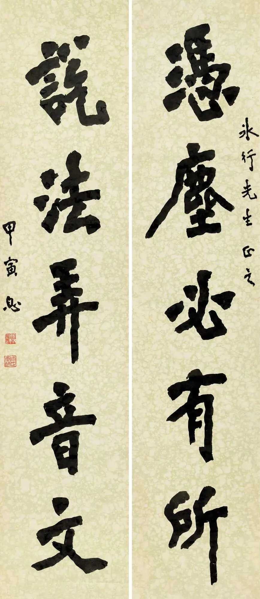 弘一 楷书《凭尘说法五言联》,虎皮宣纸本 160.5×34.5cm×2。释文:凭尘必有所,说法弄音文。弘一,俗名李叔同,三十九岁出家,释名演音,字弘一,浙江平湖人,迁天津。光绪年留学日本东京美术学校,善西画及音乐。归国后,历任上海太平洋日报文艺主编,浙江两江师范艺术教师。工篆刻、填词及歌曲,最善书法。书学六朝写经,淳朴自然。这就是中国风遇见艺术