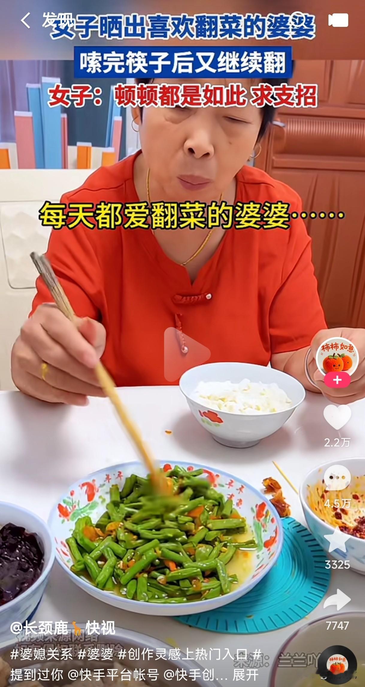 女子晒出吃饭时喜欢翻菜的婆婆,嗦完筷子后又继续翻,并且顿顿都是如此,求网友有什么高招吗? 面对这种吃饭时喜欢在菜里翻来翻去的人是不是都很生气,瞬间有种想把菜扣她头上的冲动,这种人不知是从小就是这样?还是故意翻来翻去为了恶心旁边的人,翻一两下还可以理解,总是不停的在翻,嗦完筷子还继续不停的翻,这旁边的人还有心情吃饭吗? 这女子对于婆婆顿顿都翻菜的做法也无语极了,她可能是实在没有办法了才把这一幕发到网上求助网友,遇到这样的婆婆到底该怎么办?到底用什么办法才能制止她每次都翻菜的毛病?