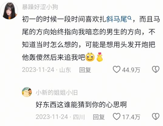 初一的时候一段时间喜欢扎斜马尾,而且马尾的方向始终指向我暗恋的男生的方向,不知道当时怎么想的