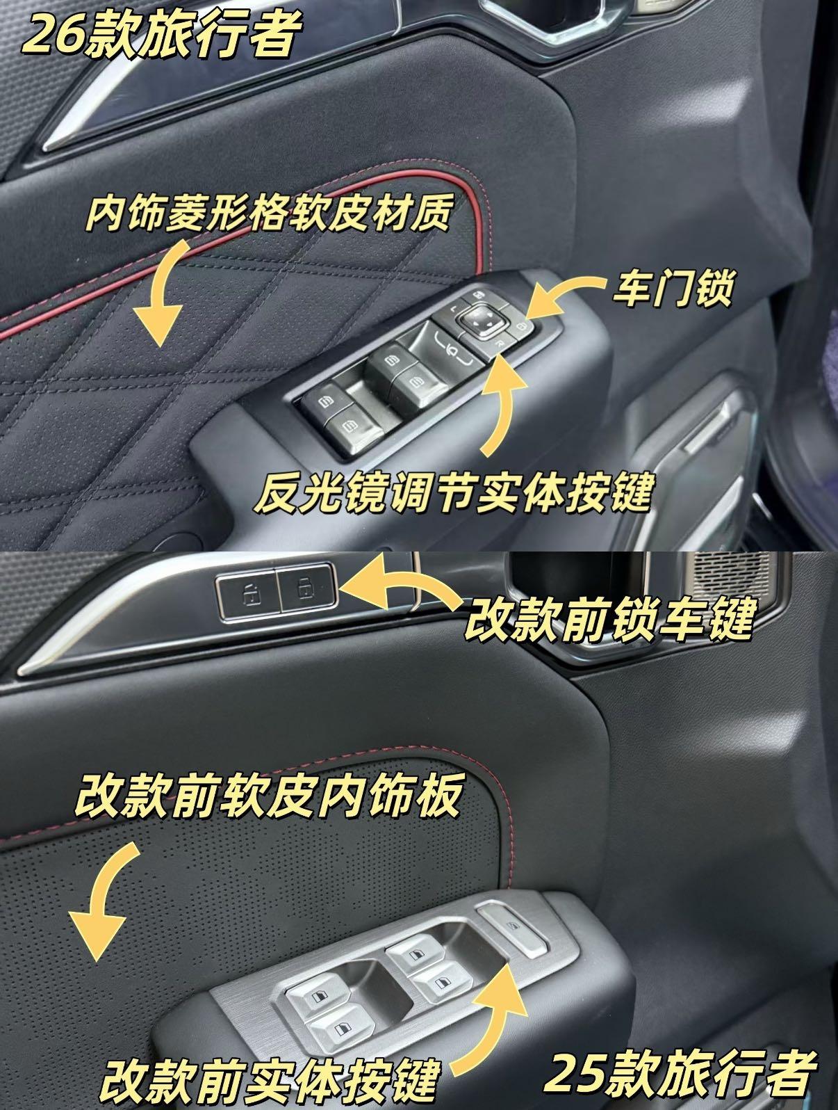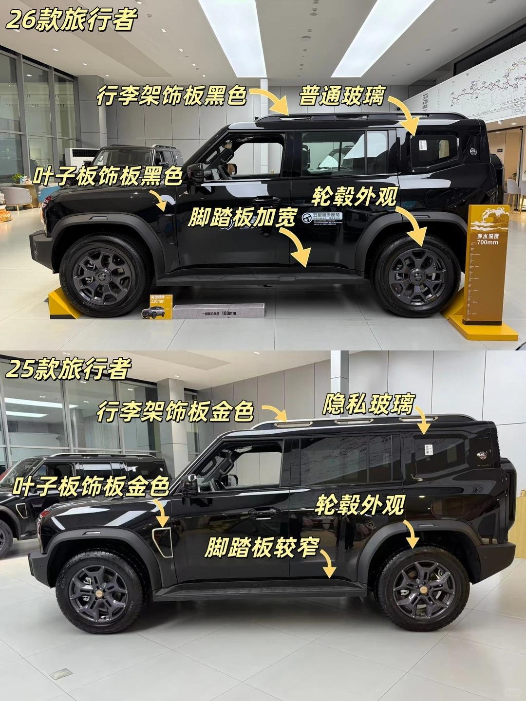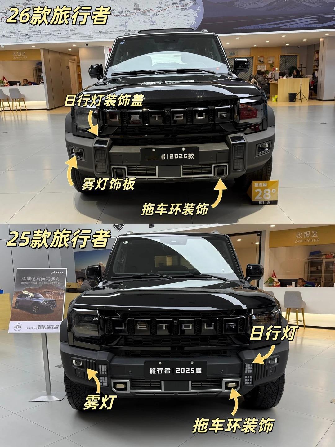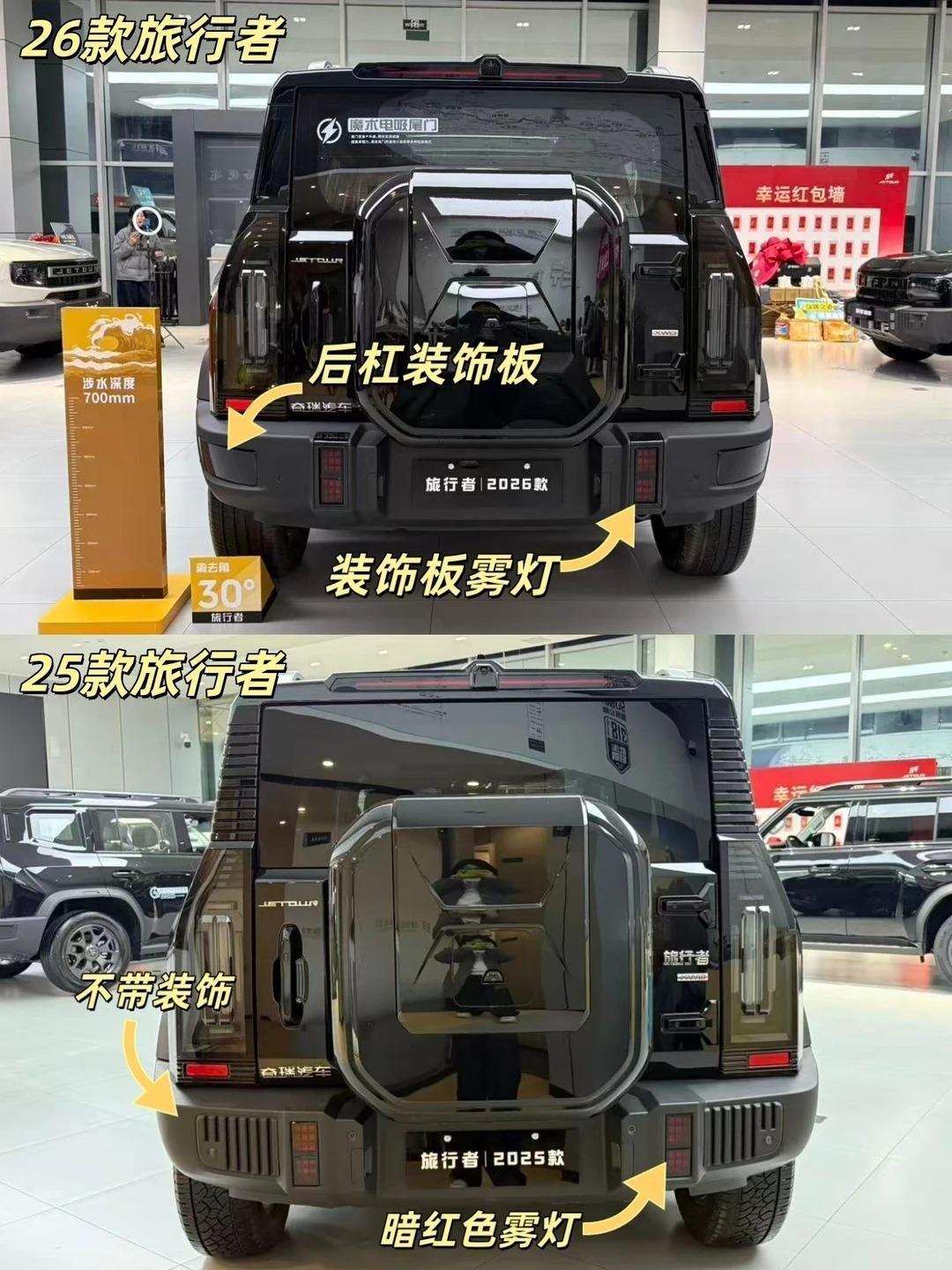 跟大家分享下26款与25款捷途旅行者的外观、内饰差异对比,从车身细节、前脸、车内按键到车尾设计都做了区分。 1. 车身侧面:装饰与实用性调整 26款旅行者: 行李架、叶子板饰板均为黑色; 车窗是普通玻璃; 脚踏板做了加宽处理(上下车更方便); 轮毂外观为纯黑样式。 25款旅行者: 行李架、叶子板饰板为金色; 车窗是隐私玻璃(自带隐私保护); 脚踏板较窄; 轮毂带金色装饰细节。 2. 前脸设计:细节装饰变化 26款旅行者: 增加了日行灯装饰盖、雾灯饰板; 保留拖车环装饰。 25款旅行者: 无装饰盖,日行灯、雾灯为裸露设计; 拖车环装饰样式与26款一致。 3. 内饰按键与材质升级 26款旅行者: 内饰门板采用菱形格软皮材质(质感更精致); 车门按键区新增车门锁实体键,反光镜调节按键布局更清晰。 25款旅行者: 内饰门板是普通软皮饰板; 车门按键区无独立车门锁键,按键布局相对简洁。 4. 车尾细节:装饰与雾灯调整 26款旅行者: 后杠增加装饰板; 雾灯为装饰板集成样式。 25款旅行者: 后杠无额外装饰; 雾灯是暗红色独立样式。 整体来看,26款旅行者在外观装饰、内饰质感、实用配置上做了升级,风格更统一; 25款则保留了更简洁的设计+隐私玻璃的配置。【来自懂车帝车友圈】