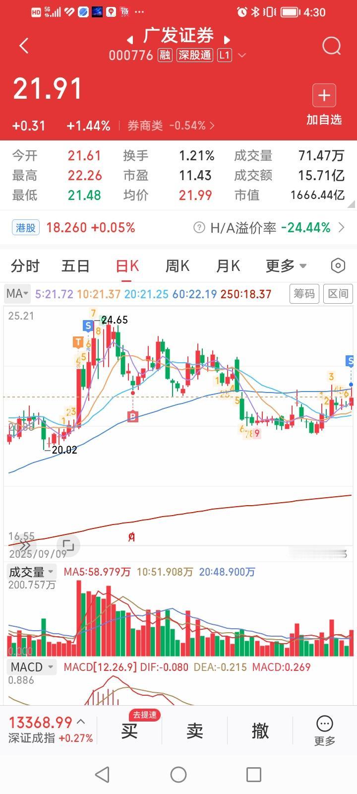 广发证券,今天冲劲十足,股价最高冲到22.26元后一路回落,收盘上涨1.44%,收盘价21.91元。 广发证券股价尽管回落不少,但今天的涨幅仍然居券商股涨幅排行榜第二名,在头部券商股中涨幅居首。有点像券商股中的敢于冲锋陷阵的孤胆英雄。 广发证券在2025年10月10日创出了24.55元的高点后,股价连下台阶,最近一个月围绕21元整理平台强势整理,似有向上突破之势。但连续三次都没冲过60日均线压制,突破的真假似乎值得存疑。 有鉴于此,今天把持仓的最后一点广发证券也卖了,退出来观察一下再说,毕竟券商股这个渣男是很难齁得住的。