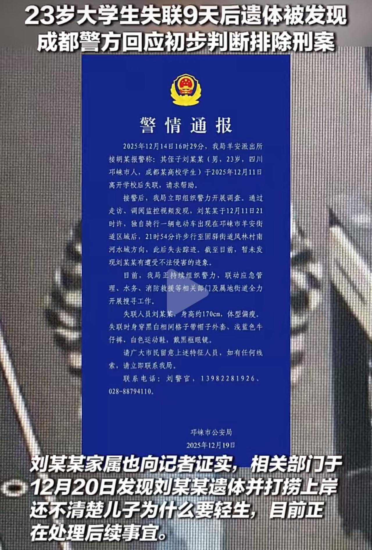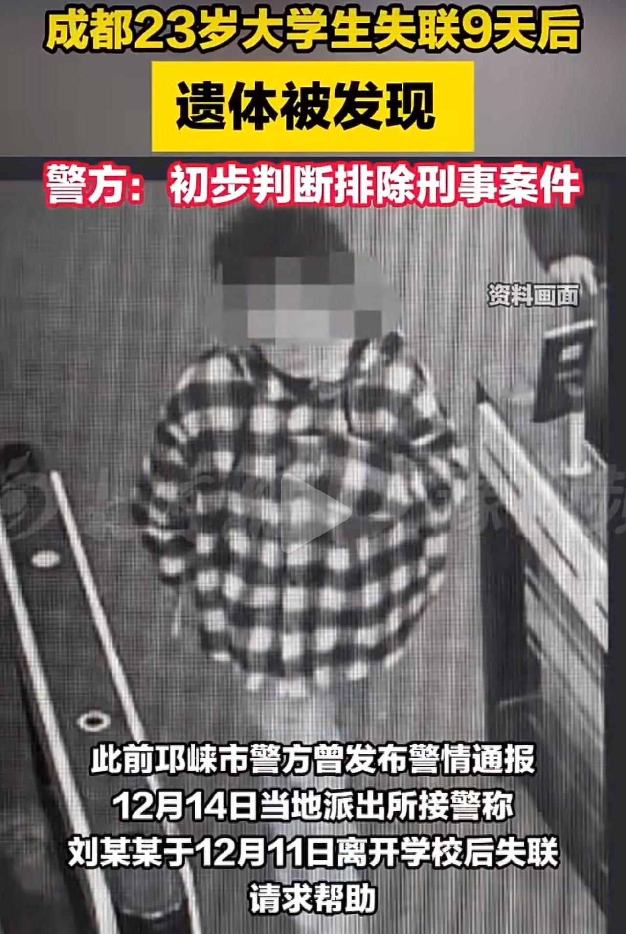 12月11号晚上,监控最后拍到他骑着电动车到邛崃羊安街道,之后就步行往南河水域那边走了,从此再也没了踪影。家人联系不上他,直到14号才报警,多部门地毯式找了整整一周,终于在20号捞起他的遗体,初步判定是生前溺水。他才23岁啊,正是人生最有朝气的时候,说没就没了,好好的家一下子就垮了,家人怎么受得了这个打击。 网友们都忍不住追问:南河水域的监控盲区、该装没装的防护设施,是不是本来能拦住这场悲剧?更让人揪心的是,他离校3天,学校才后知后觉发现不对劲,室友和辅导员都没及时上报——高校的心理干预机制,是不是又一次失灵了? 这些年,年轻生命突然没了的新闻,每次看到都让人心里揪得慌。我们嘴上总说要关注孩子的心理健康,要把公共区域的安全防护做扎实,可真到了事儿上,还是有太多漏洞没人管、没人补。 一条好好的生命就这么没了,留给家人的是一辈子的痛。只希望这场悲剧能敲醒所有人,那些该有的保护,真的要护得住每一个普通人啊。成都溺水事故 成都23岁男生失联9天后遗体被发现 溺水