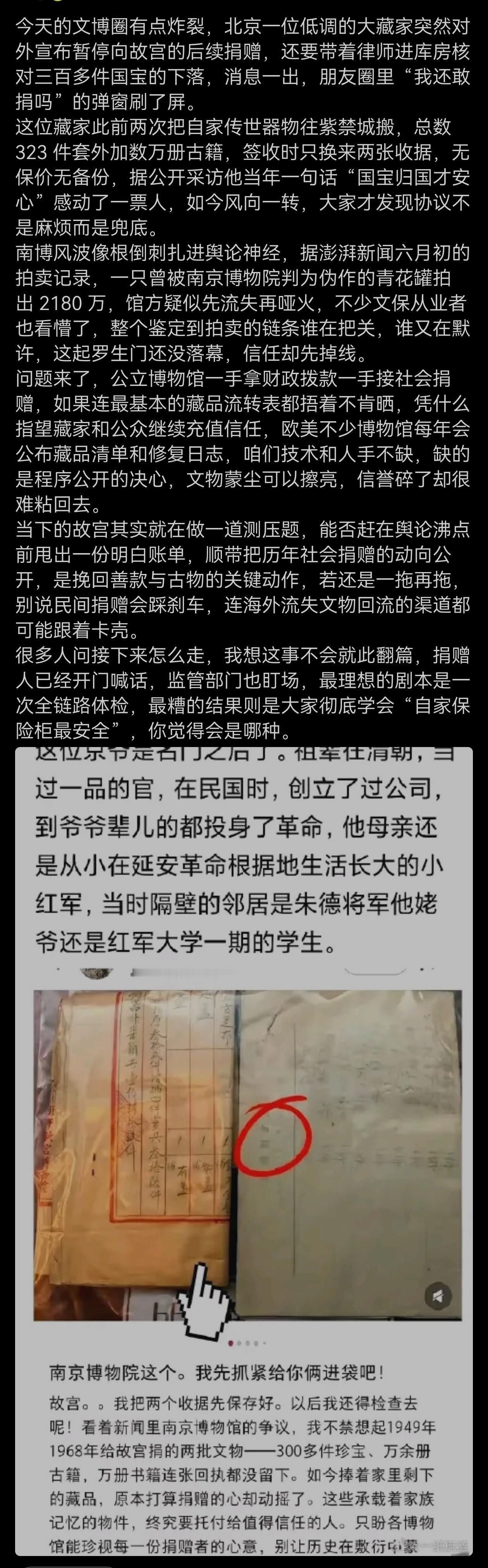 文物圈,捐赠者、接受者都有点惶恐不安了。网友建议,应该先强制核查一遍所有博物馆的监控,不能有坏的。