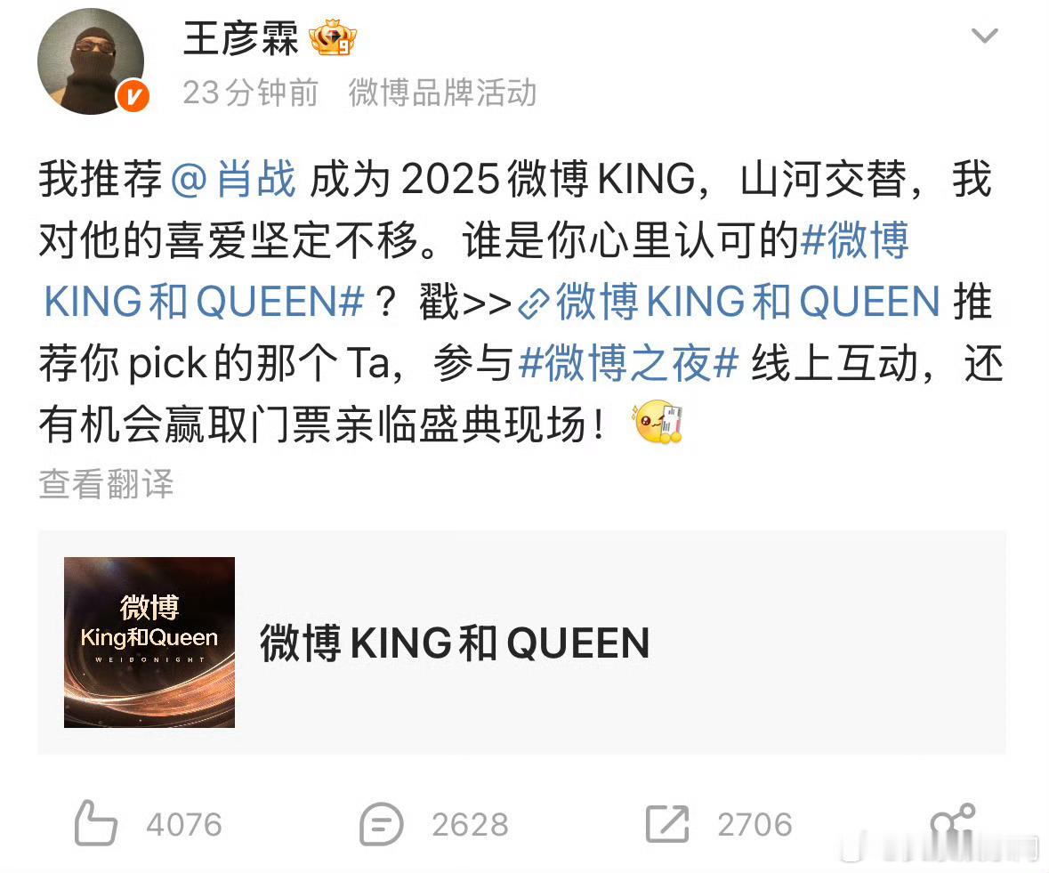 王彦霖实名给肖战投票王彦霖实名支持肖战成为king