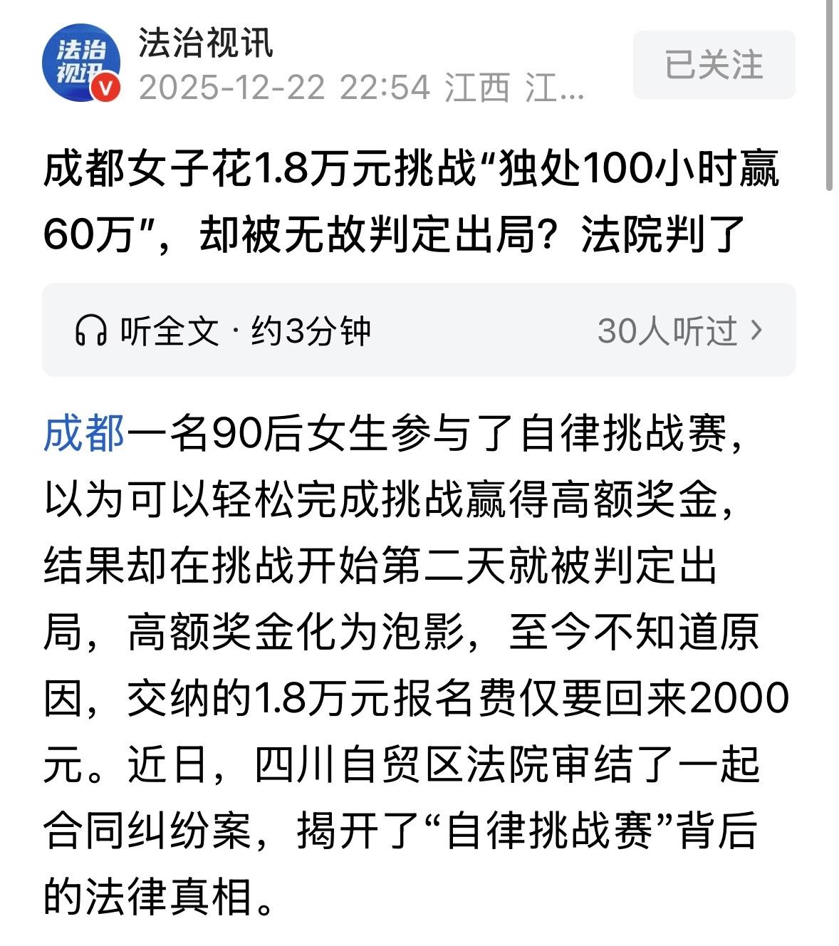 “空手套白狼?”四川成都,一女子为了60万的奖金,交1.8万报名费,参加了一场“自律挑战赛”。比赛要求参赛者在100小时内,不能用手机,不能交谈,不能随意走动等…如果挑战成功,就能拿到丰厚的奖金,并退还报名费。女子信心满满参了赛,谁料第二天就无故被判出局了,奖金和报名费全部化为泡影,至今不知何原因。女子将举办活动的公司告上法院,要求全额退还她的报名费,法院判了! 2024年9月,90后姑娘小米(化名)看到一个很有意思的广告。 一家公司要举办一场“自律挑战赛”,美其名曰挑战自我,培养极致自律。 参与者需要在一个封闭的环境里坚持100个小时,期间遵守一系列严格的规则。 如果成功熬过这100小时,就能拿走高达60万元的丰厚奖金。 不过,参与者需要交1万8的报名费,如果最终挑战成功,那么报名费会全额退还。 小米心想,100小时,不过4天多,咬咬牙就过去了。不就是管住自己吗?60万!这诱惑实在太大了。 她觉得自己平时也算有毅力,这挑战看起来像是个白捡钱的机会。 在60万奖金的巨大诱惑下,小米没有犹豫,签下了那份《自律挑战协议》,掏出了1万8的报名费。 小米信心满满,有十足的把握。不过,这份协议也不简单,里面列了十几条规定,条条框框的限制特别多。 首先,手机成了违禁品,不能想用就用,被严格限制。 第二,完全禁止和现场的工作人员有任何交流。 第三,活动期间一步都不能离开指定的、被监控覆盖的区域。 协议的核心要求,其实就是在监控眼皮底下,老老实实待着,几乎什么都不能干,纯粹消耗时间。 规则很苛刻,但想到巨奖,小米觉得这些都可以忍受。 2024年9月13号晚上9点40分,挑战正式开始。小米打起精神,准备迎接这100小时的考验。 然而,才刚刚过去2天,挑战才进行了不到一半的时间,那家公司突然就通知小米,说她失败了,挑战结束。 小米傻眼,自己明明严格遵守规则,没有做任何违规的事,为什么就被判出局了? 她想弄明白原因,但公司没有任何解释,就把她踢出了局。 无论小米怎么追问,公司就是不肯告诉她到底哪里出了问题。 那60万的美梦,连同她交出去的1万8报名费,瞬间化为了泡影,只剩下一肚子的憋屈。 拿不到奖金就算了,自己交的钱总得退回来吧?小米不甘心,多次找公司交涉,要求退还她的报名费。 可公司却百般推脱,后来干脆直接说没钱。 小米磨破了嘴皮子,最后公司象征性地退给了她2000块钱,剩下的1万6千元,说什么也不肯给了。 1万8进去,只拿回2000块,辛苦坚持的两天换来的是不明不白的淘汰和一肚子窝囊气。 小米越想越觉得这事不对劲,自己很可能被坑了。被逼无奈后,她只好一纸诉状,把这家公司告上了法院。 她的诉求很明确:把剩下的1万6千元报名费要回来! 这起官司的核心问题主要在那份《自律挑战协议》上:它到底是不是一份有效的合同? 《民法典》第497条规定:有下列情形之一的,该格式条款无效:提供格式条款一方不合理地免除或者减轻其责任、加重对方责任、限制对方主要权利;提供格式条款一方排除对方主要权利。 法院审理认为,协议表面上说得冠冕堂皇,听起来挺正能量。但仔细研究一下协议的具体内容和操作模式后,不难发现其中的猫腻。 协议要求参赛者在封闭且被监控的环境下,几乎不做任何有价值的事情,纯粹是用物理限制来熬时间。 这跟真正的“自律”,根本是两码事。 而那天价奖金其实就是诱饵。60万,这个数字远远超出了正常激励的范畴。 它的作用就是利用人性的贪婪,吸引像小米这样抱着侥幸心理的人参与。可实际就是空手套白狼罢了。 这与勤劳致富、诚信经营的社会主义核心价值观完全背道而驰。 法官还发现,这份协议从头到尾都是由公司单方面制定的霸王条款。里面密密麻麻全是约束参赛者的义务和限制,却没有赋予参赛者任何实质性的权利。 同时,协议巧妙地回避了主办方的责任,比如“有权单方面判定失败且无需解释”。 这种只约束别人、放纵自己,严重倾斜的权利义务关系,明显违背了《民法典》第497条规定,属于无效的格式条款。 综合以上分析,法院给出了判决。 法院认为,这份《自律挑战协议》表面上打着“自律”的幌子,实质上是以高额奖金为诱饵,诱导参与者进行一场结果高度不确定的冒险,其目的和内容均违背了公序良俗和社会良好风尚。 同时,协议本身是无效的格式条款。因此,认定该协议自始无效。 既然合同无效,那么依据这份无效合同收取的钱款,自然失去了合法的依据。根据法律规定,因无效合同取得的财产,应当予以返还。 法院最终判决,那剩下的1万6,一分都不能少,必须退还给小米。 对此,你怎么看? 关注@运良说法 学法律知识不迷路