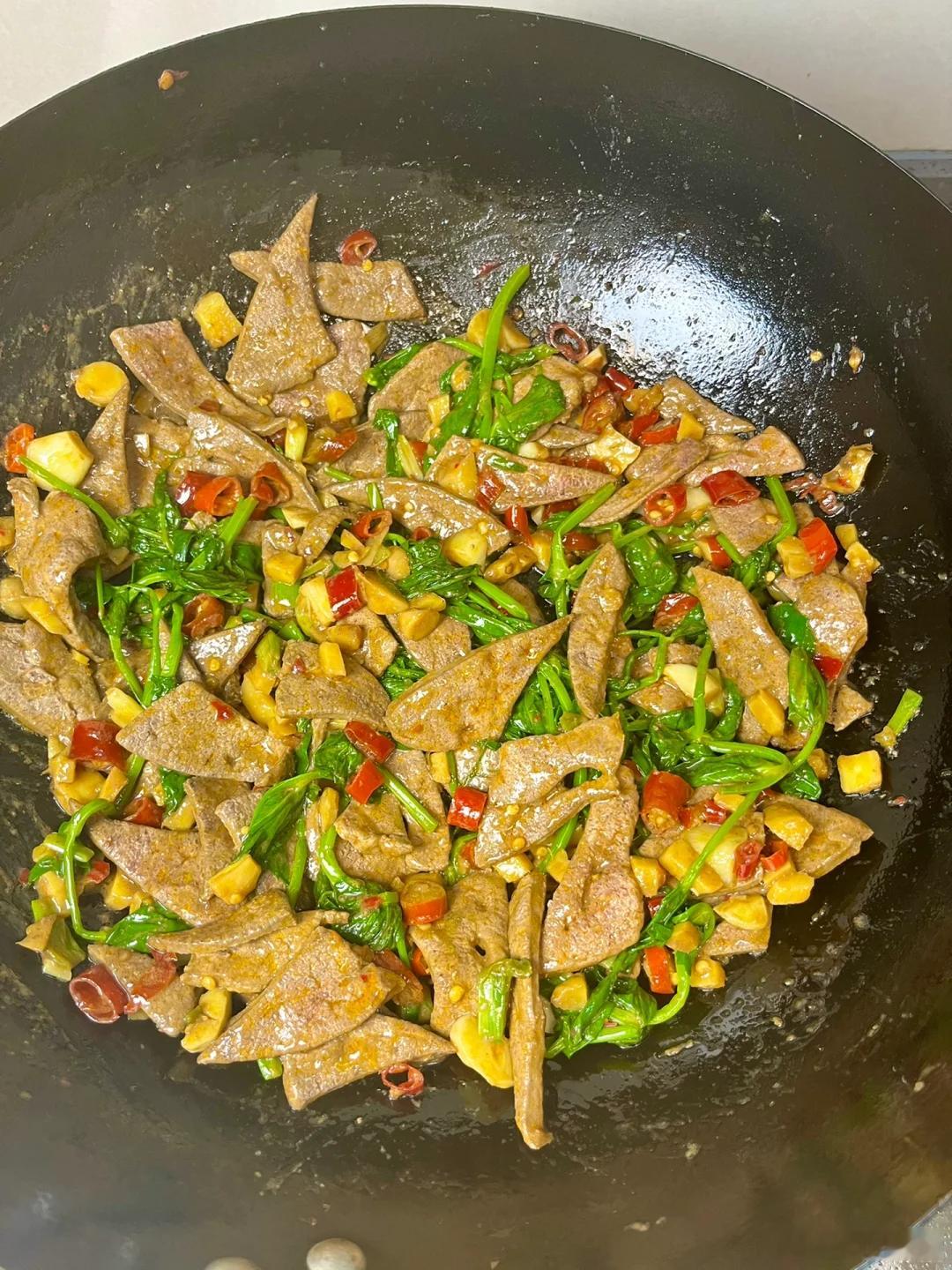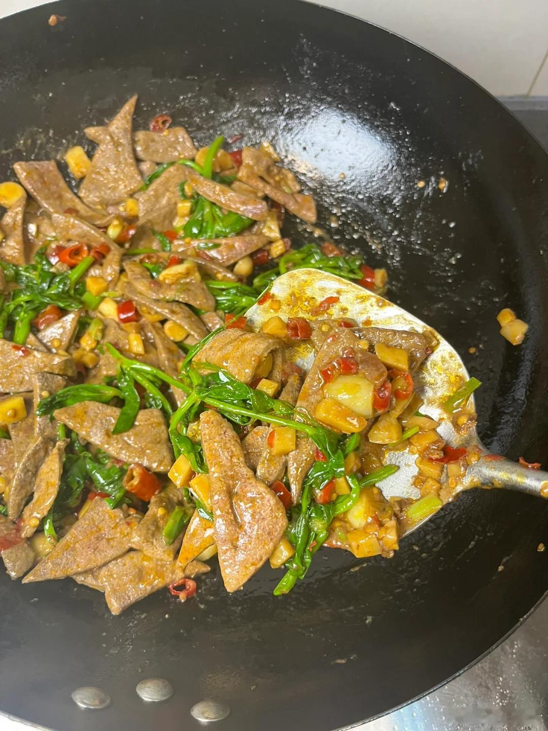 豌豆尖与猪肝的搭配真的是超级给力!滑嫩的猪肝加上嫩嫩的豌豆尖,这样搭配出来,脆嫩爽口,巨巨巨下饭食材:猪肝,豌豆尖,泡椒、泡椒、葱蒜、豆瓣酱1. 猪肝切片,加面粉多清洗几遍,面粉可以有效吸附血水,洗到猪肝全部发白,是猪肝不腥的关键2.放生抽、老抽、胡椒粉、盐、料酒、淀粉抓拌均匀3.油热爆香泡姜、泡椒、葱蒜,加一勺豆瓣酱炒香。下猪肝快速滑散炒至变色4.下豌豆尖翻炒几下即可出锅全程大火快速翻炒,满满的都是香气,真的超级下饭,趁着这个吃豌豆尖的季节,赶紧试试吧~四川美食 川川教做菜