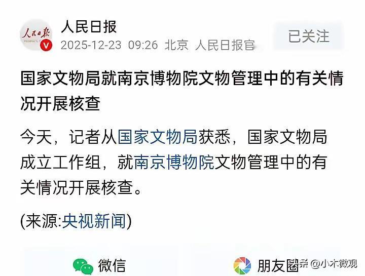 就在刚刚,央视正式确认了! 南京博物院事件,国家文物局正式介入调查,成立工作调查组,调查级别再次升级!此前是江苏文旅部门宣布成立调查组,看来级别还是不够高啊!毕竟这可是无比珍贵的文物啊。 最新消息是12月23号的,国家文物局真的成立工作组了。庞家后人庞叔令已经申请强制执行,逼着南博交出5幅画的流转材料。这事儿闹了快一年,终于有国家级部门介入了。 南博之前发过说明,说那5幅画1961年、1964年两次被专家定为“伪作”。1997年他们把画划拨给省文物总店,2001年有人花6800块买走了《江南春》。可庞家人从捐赠到现在,压根没人通知过他们这事儿。 还有个更劲爆的,南博典藏部退休职工郭礼典实名举报前院长徐湖平。他说徐湖平当年撕了故宫南迁文物的封条,把上千箱真品当“伪作”,划拨到自己管的文物总店,再让儿子的拍卖公司倒卖。关键是1997年那批画的划拨文件上,还有徐湖平的签字。 我给大家说个具体事儿,2008年就有40多个南博职工联名举报过类似问题。新华社都发过内参,可最后啥动静都没有。现在郭礼典又站出来,说愿意为举报内容负法律责任。 这事儿最让人膈应的不是画真不真。就算是伪作,庞家无偿捐给国家,南博处置前总得说一声吧?法律上也规定,处置捐赠文物得征求捐赠人同意。他们倒好,三四十年不吭声,直到画现身拍卖场才让人知道。 那幅《江南春》今年5月在北京拍卖,估价8800万。庞叔令举报后,拍卖公司撤拍了。可到底是不是当年那幅6800块卖掉的,南博还没说清楚。 我的观点很简单,博物馆是管文物的,不是偷偷卖文物的。不管画是真的假的,处置流程得公开透明。捐赠人的信任多金贵啊,这么折腾以后谁还愿意捐东西? 现在国家文物局和江苏的调查组一起查,希望能查得细一点。不光要查画的去向,还得查查当年的鉴定和划拨到底合不合规矩。那些签字的人、经手的人,都得说清楚。 庞叔令都70多岁了,为了父辈的捐赠跑了大半年。她想要的不过是个真相,这要求一点都不过分。 各位读者你们怎么看?欢迎在评论区讨论。