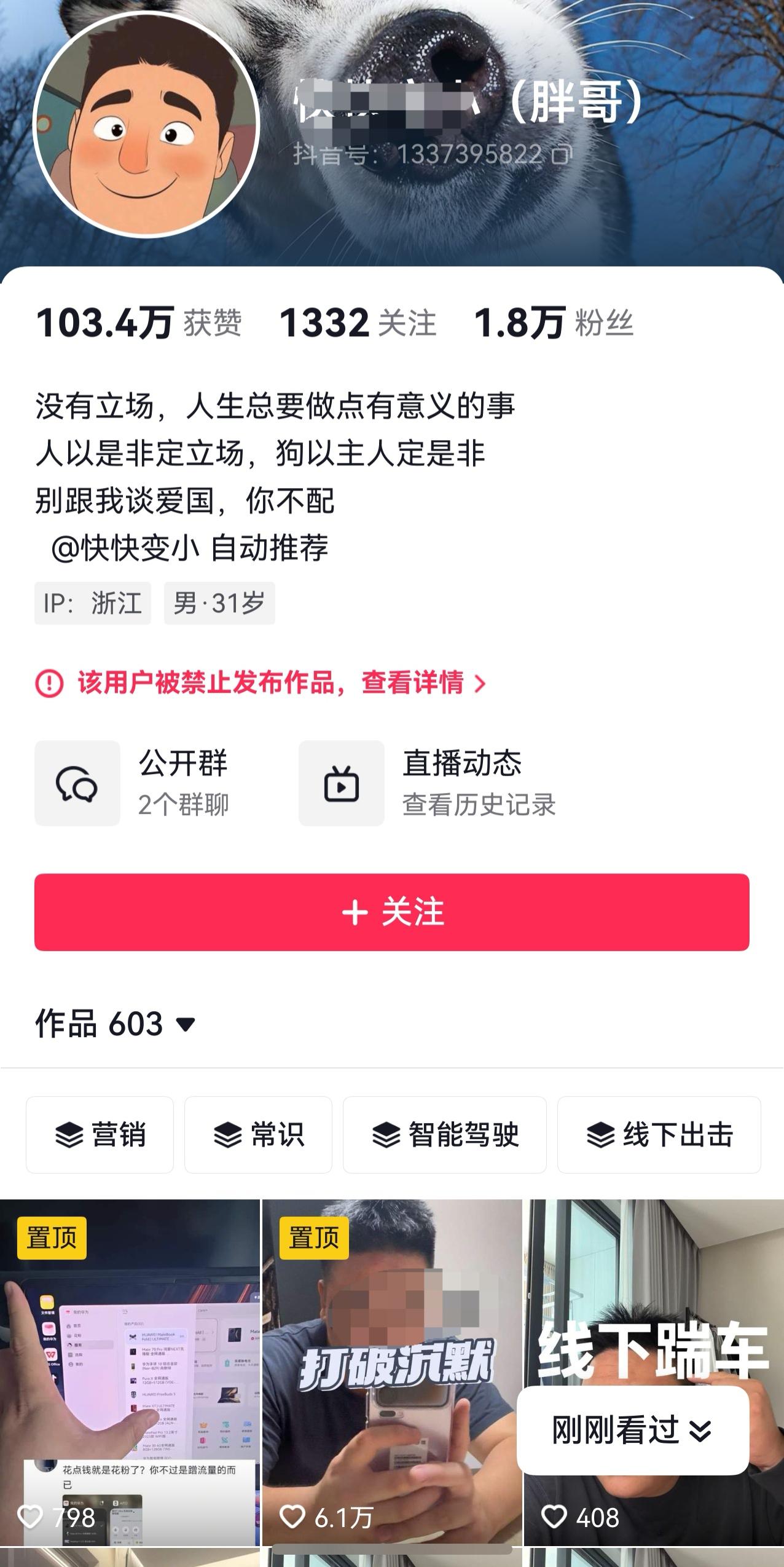 《某500强的博主被禁言了》 天天搞对立,带节奏,还说要去买尊界S800,又说尊界S800很一般,不买了,唉,这些人真的是无法无天的 你看他们的页面写的什么东西,爱国是每个中国人的本能。不需要谈,不需要写在页面里,因为我生活在这个国家这片土地上,自己的国家都不爱,你还能……在他们眼里爱国都是错的