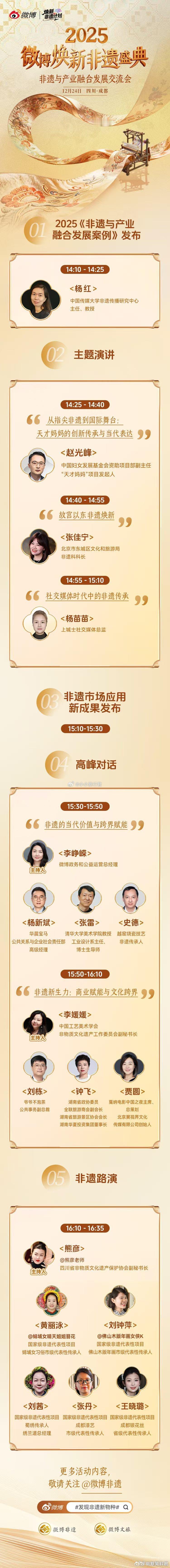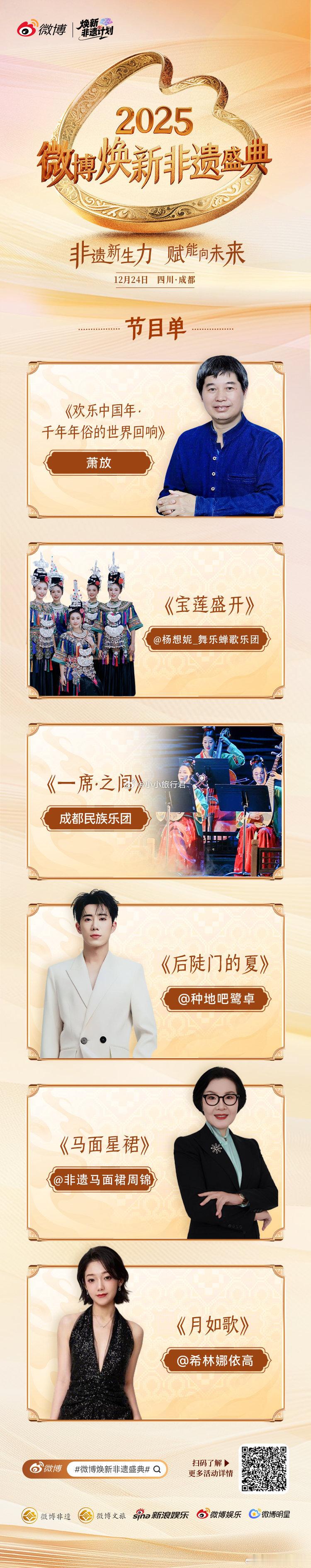 【2025微博焕新非遗盛典盛大开启】✨以匠心织就时光经纬,以巧思唤醒千年遗韵。TA们是传统技艺的守护者,更是非遗焕新的造梦人。💫古韵悠悠,再起新潮。重磅阵容集结成都,共绘非遗新图景。传统与现代碰撞,东方与世界对话,每一帧都是文化自信的视觉盛宴。🎙12月24日,让我们在成都国际非遗博览园共赴这场跨越千年的非遗之约!