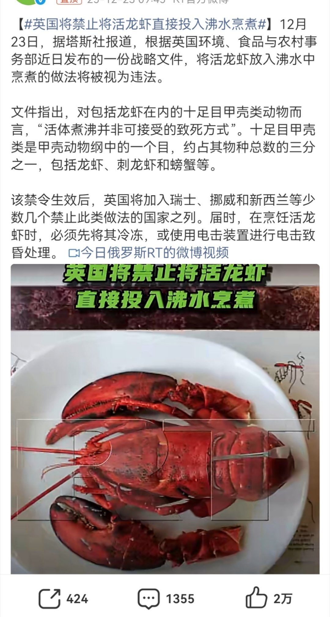 英国人真仁义!英国将禁止将活龙虾直接投入沸水烹煮