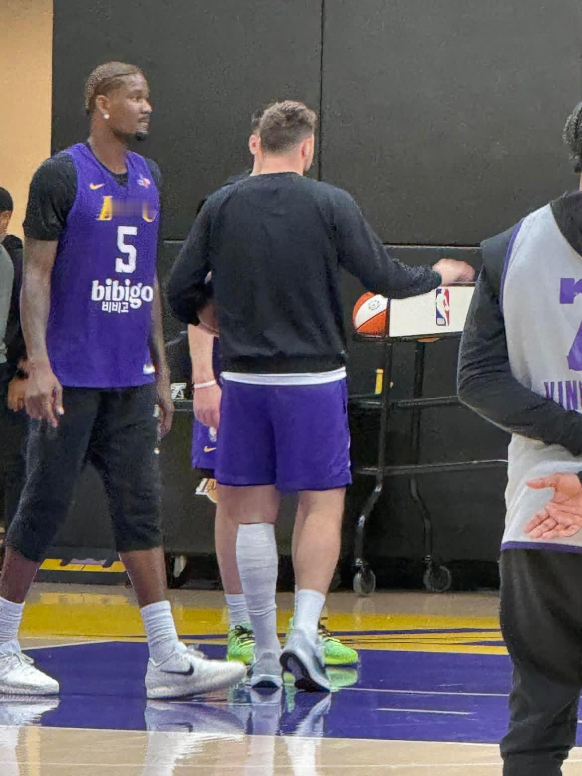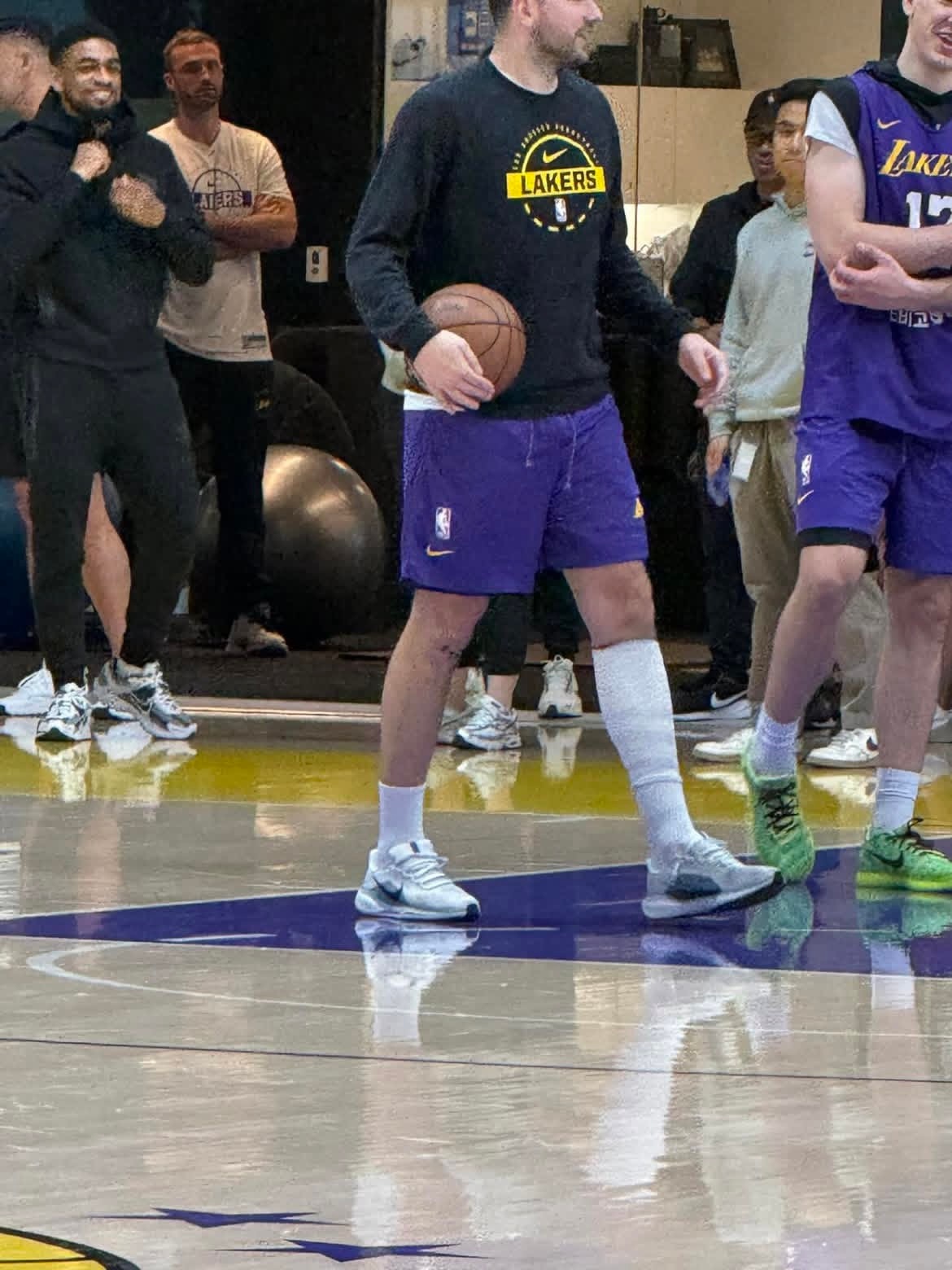 东契奇的小腿缠着厚厚的绷带出现在湖人训练馆,雷迪克说东契奇的状态仍然是每日观察阶段,去年也是伤的左小腿,所以湖人今年回很谨慎对待卢卡的伤势。洛杉矶湖人东契奇左腿缠着绷带