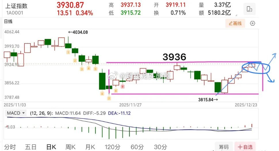 2025年12月23日周二午间简析:市场延续反弹格局,日线已收五连阳,但短线或将面临震荡分化。早盘指数虽继续上行,但个股表现分化显著,权重板块拉升指数特征明显,小盘股则出现回调,整体走势尚在正常调整范畴。情绪指标再次印证“钟摆效应”——“情绪高涨时不追涨,情绪低迷时不恐慌”,当前阶段把握节奏仍是关键,若难以判断短期方向,可多关注情绪指标变化(见图1)。从技术层面看,上证指数目前仍处于中枢区间内运行,早盘最高触及3937点,已接近中枢上轨3936点压力位,预计短线在此附近将出现震荡整理。后续重点关注能否有效突破并站稳3936点,若成功站稳,则指数有望向前高4036点方向推进;反之,若未能有效突破,则继续以中枢震荡格局看待。若指数出现回踩,可关注3900点及3888点附近支撑。从均线系统观察,只要不跌破下方关键均线,整体趋势仍属健康,回调仍可寻找布局机会。板块方面,商业航天板块需注意短线顶背离迹象,存在回调压力,结构上或转为中枢震荡,可关注28日均线及缺口位置的支撑力度。零售板块当前调整仍属良性,趋势尚未走完,可持续跟踪关注。