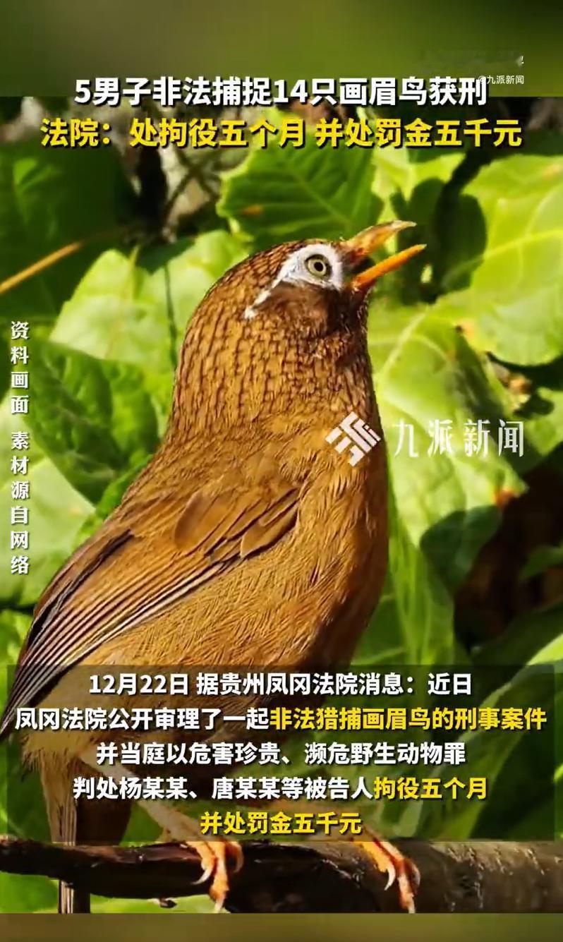 5男子非法捕捉14只画眉鸟获刑 九派新闻记者从贵州凤冈法院获悉,2025年7月24日下午,杨某某,唐某某等五名被告人一起从惠水县驾车来到凤冈县天桥镇猎捕画眉鸟。五名被告人使用诱捕器,捕鸟网等工具在天桥镇卫生院附近的山林内捕获画眉鸟14只。就在五名被告人收拾工具准备返回时,被风冈县综合执法局工作人员当场查获,被猎捕的画眉鸟在取证完毕后当场放生。 经相关机构鉴定,案涉画眉鸟系国家二级重点保护野生动物,共计价值70000元。审理过程中,五名被告人对犯罪事实供认不讳,当庭表示由于法律意识淡薄,为满足个人饲养爱好实施了犯罪行为,现已深刻认识到错误,自愿认罪认罚。法院经审理认为,五名被告人非法猎捕国家二级重点保护野生动物,其行为已构成危害珍贵、濒危野生动物罪。鉴于被告人具有认罪认罚,坦白,猎获物已放生等法定、酌定从轻处罚的量刑情节,判处杨某某、唐某某等被告人拘役五个月,并处罚金五千元。 来源:九派新闻