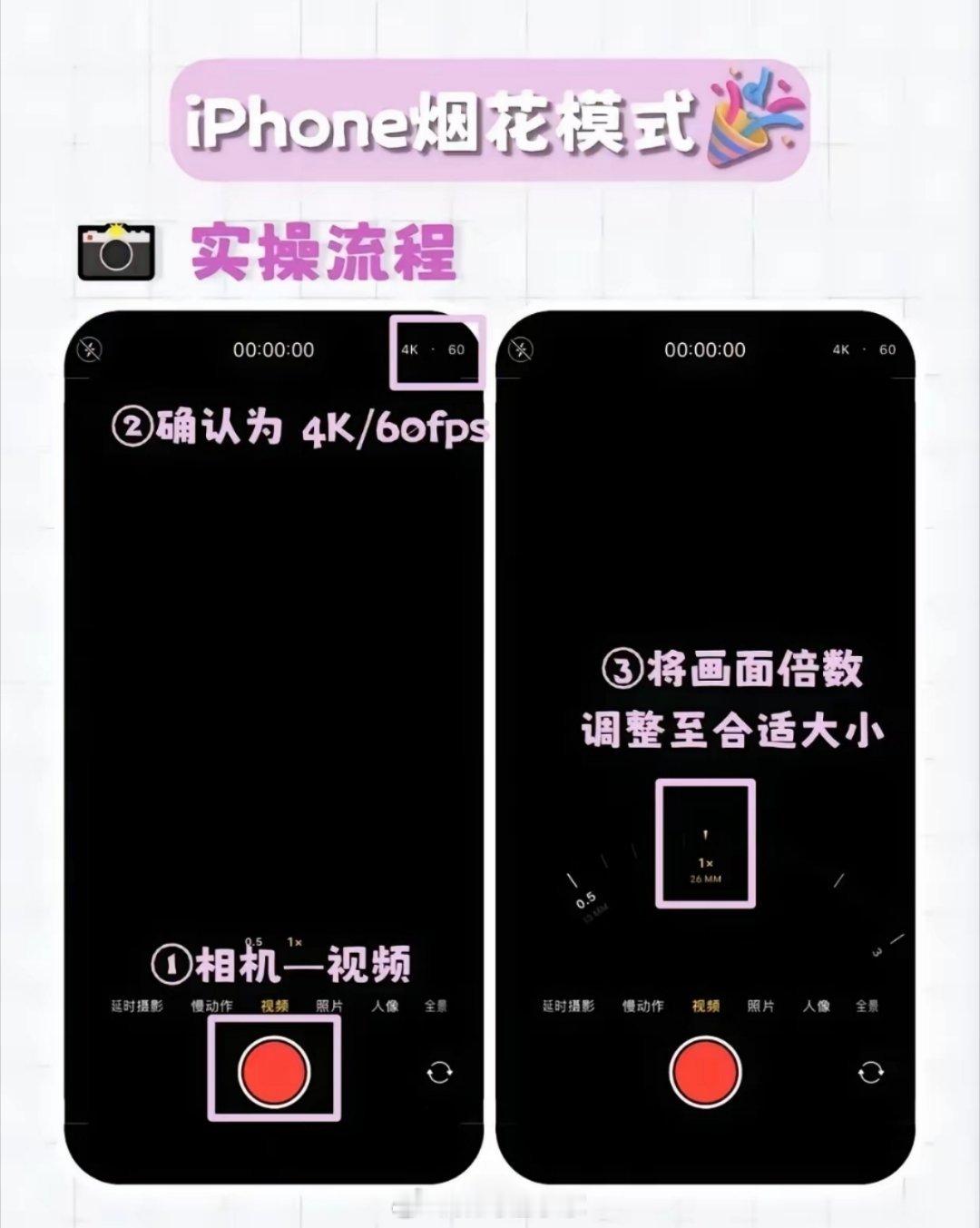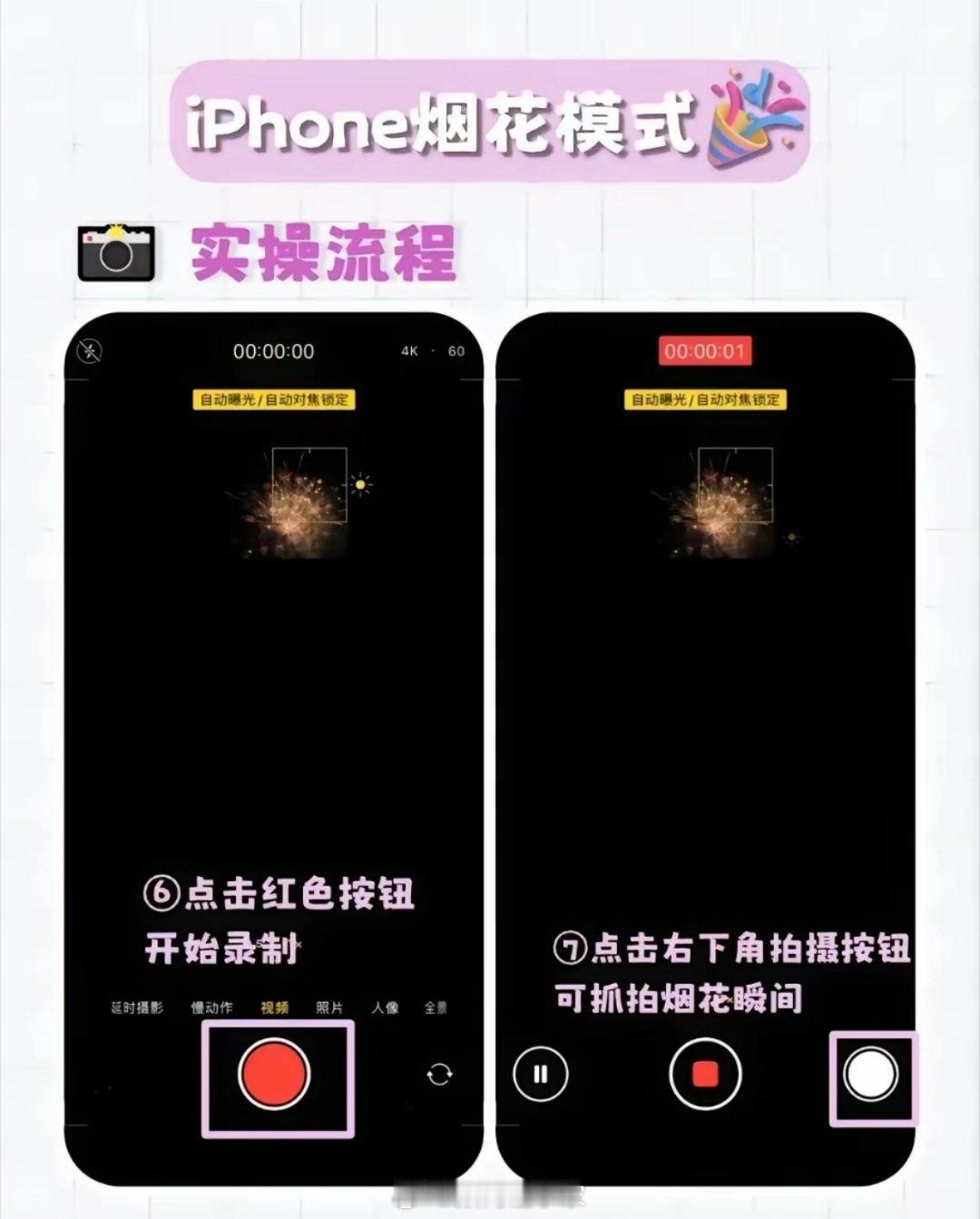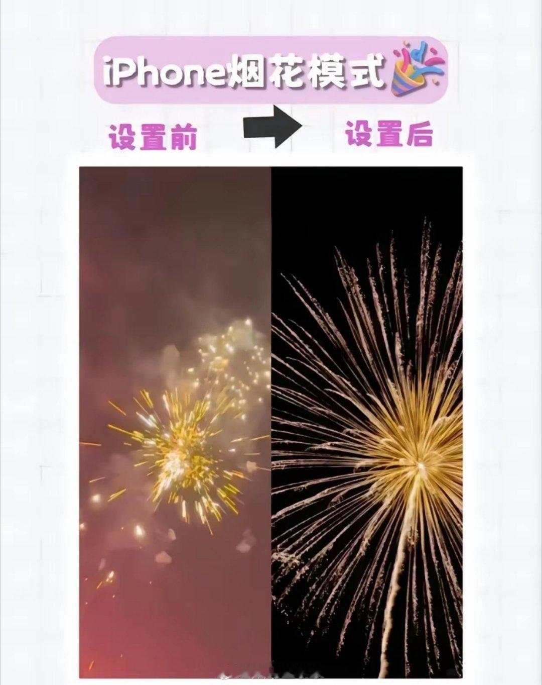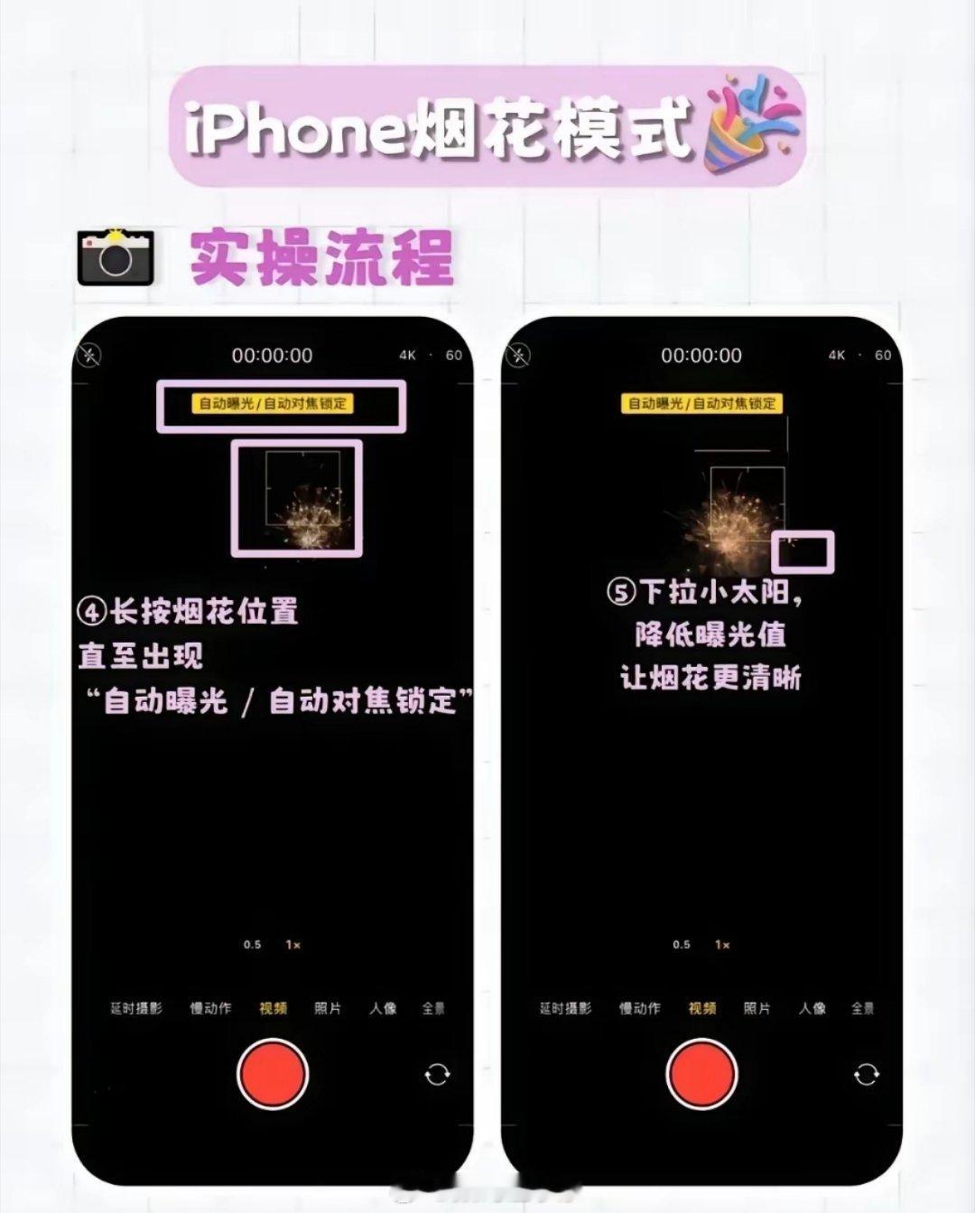 iPhone烟花模式iPhone拍跨年烟花亲测这个设置绝了!打开设置-相机,选4K/60fps,开网格和连拍。对准烟花长按锁焦,下拉小太阳降曝光,画质立马清晰不糊!视频录制+右下角抓拍,瞬间和烟花同框~跨年的仪式感全靠它!拍出来的烟花又亮又有氛围感,发圈绝对吸赞~快码住,新年和烟花一起美出圈