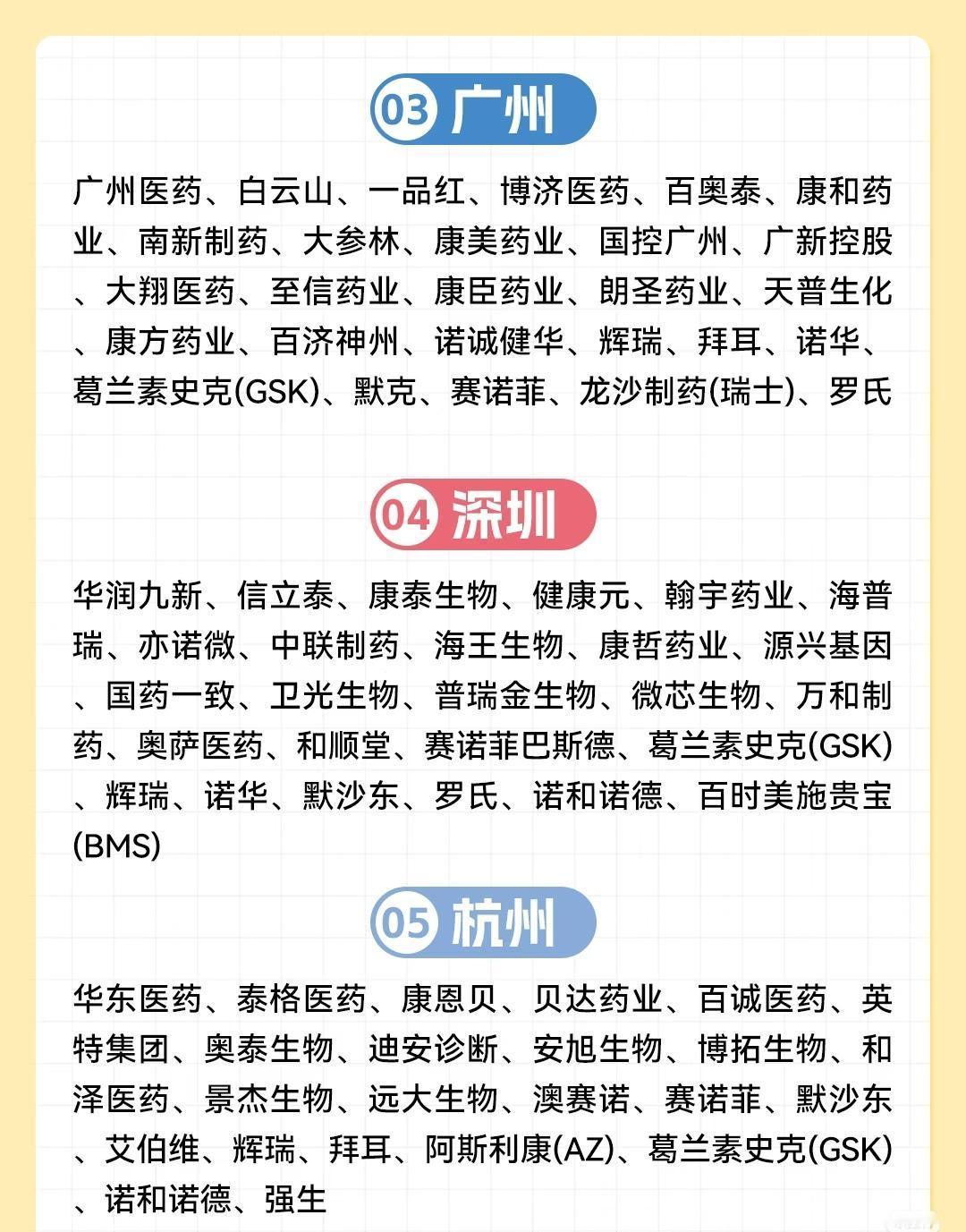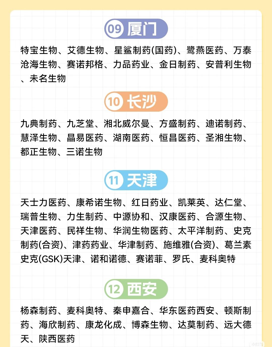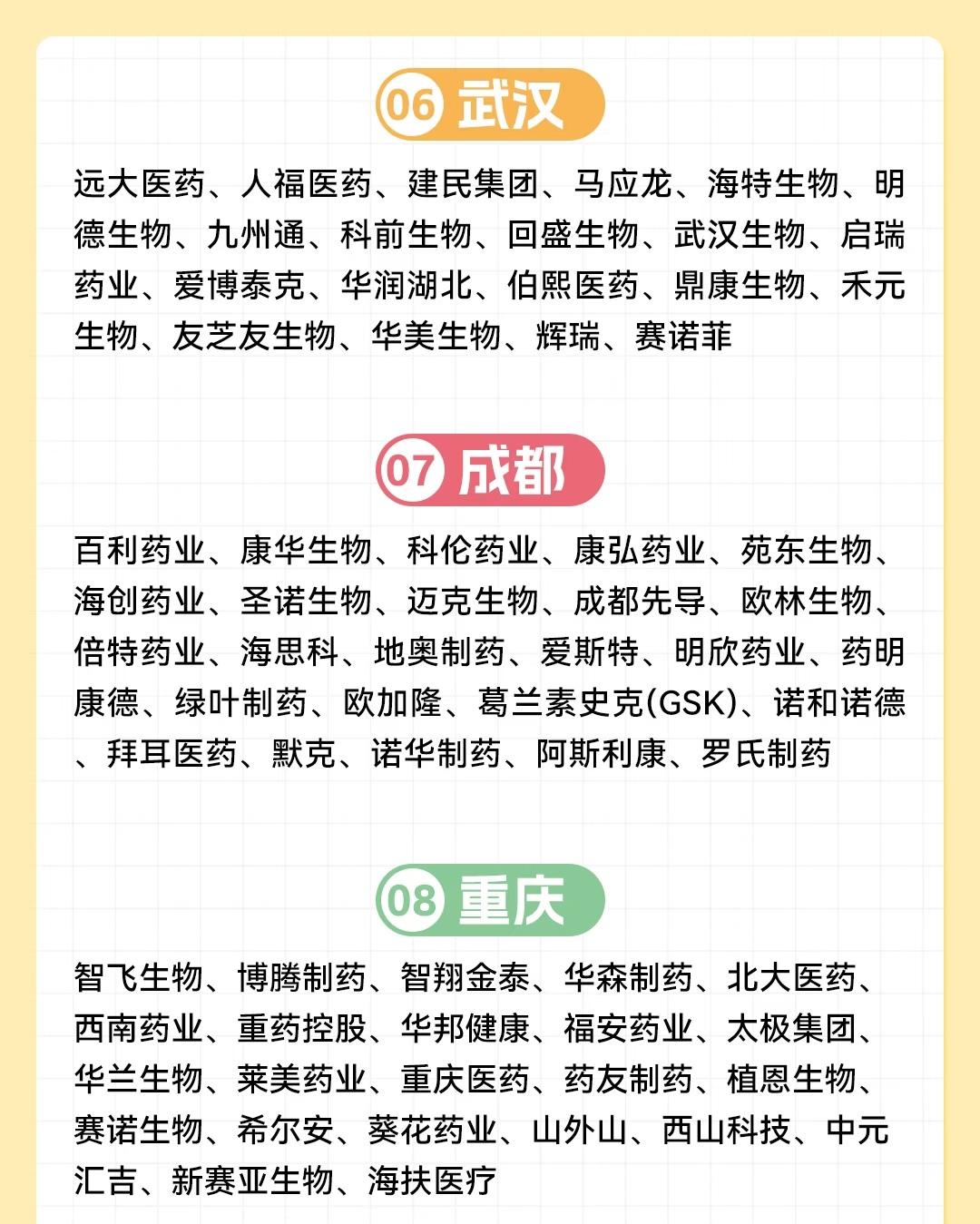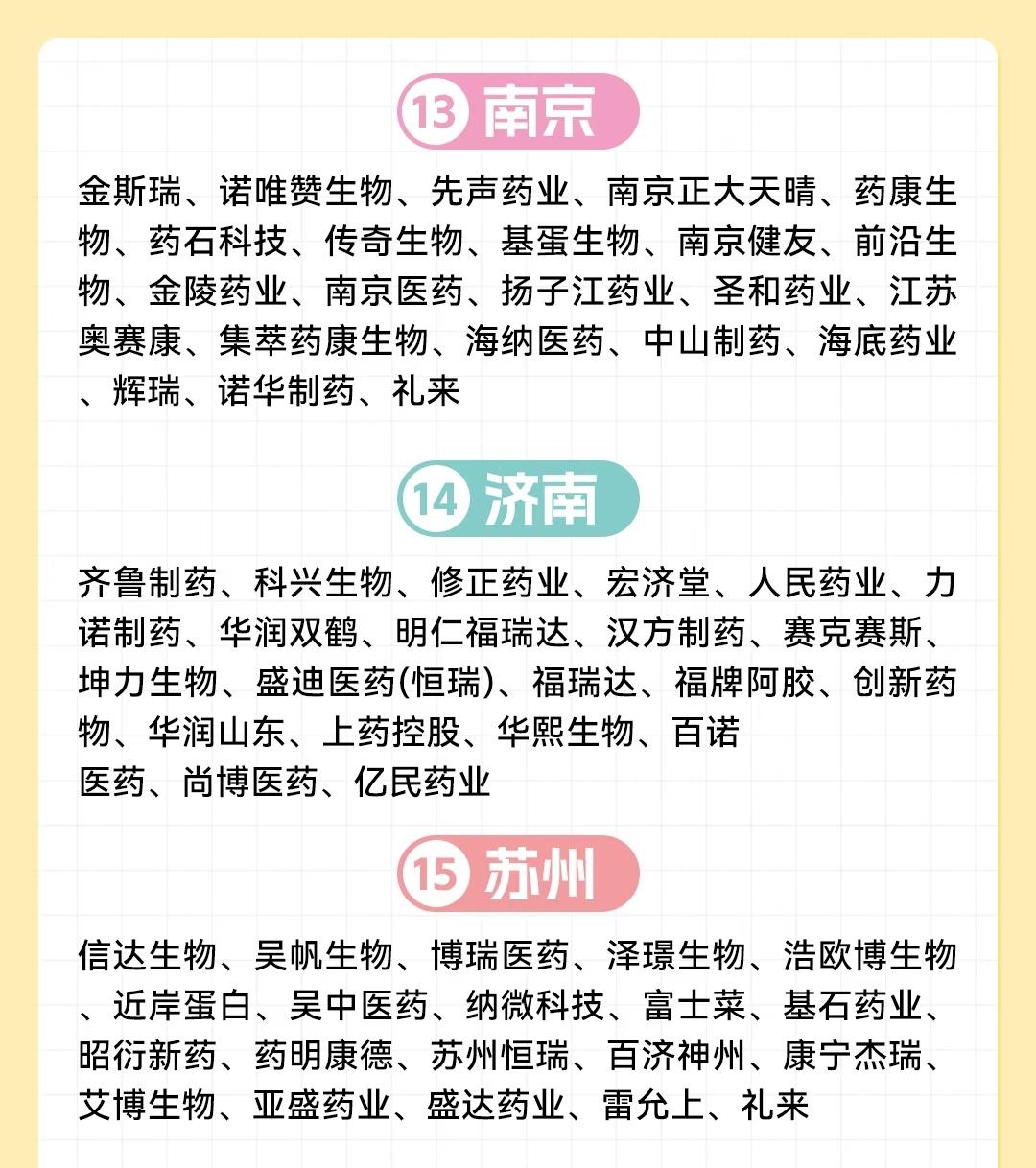 中国15个主要城市的生物医药企业分布情况,呈现各城市在医药产业领域的布局与特色。 北京作为首位城市,聚集了大量本土龙头与国际药企,涵盖国药集团、华润系、同仁堂等传统强企,以及百济神州、诺诚健华等创新型企业,还有拜耳、诺华、辉瑞等全球知名药企。上海紧随其后,拥有上海医药、复星医药、君实生物等本土代表,同时汇聚药明康德、恒瑞医药及罗氏、辉瑞、强生等国际巨头,体现产业多元化与国际化。 广州(03)与深圳(04)展现华南地区医药产业活力:广州有白云山、一品红等本土企业,及赛诺菲、GSK等国际品牌;深圳则以华润九新、信立泰、康泰生物等创新型企业为主,同时吸引赛诺菲巴斯德、默沙东等国际药企入驻。杭州(05)依托华东医药、泰格医药、贝达药业等,兼具研发与服务优势,亦有赛诺菲、默沙东等国际企业参与。 华中与西南地区,武汉(06)有人福医药、马应龙等本土龙头及九州通等流通企业,汇聚辉瑞、赛诺菲;成都(07)以科伦药业、康弘药业为代表,聚集药明康德、绿叶制药及诺和诺德、阿斯利康等国际药企;重庆(08)则拥有智飞生物、博腾制药等特色企业,覆盖生物制品、CDMO等领域。 东南与华北部分城市各具亮点:厦门(09)有特宝生物、艾德生物等细分领域企业;长沙(10)以九典制药、圣湘生物等为代表;天津(11)凭借天士力、康希诺、凯莱英等企业,融合传统中药与现代生物科技,还有史克、诺和诺德等国际布局;西安(12)有杨森制药、康龙化成等,连接东西部产业资源。 最后,南京(13)聚集金斯瑞、先声药业、传奇生物等创新企业,及扬子江药业、辉瑞等;济南(14)以齐鲁制药、科兴生物、华熙生物等为支撑,涵盖制药与生物材料领域;苏州(15)则拥有信达生物、博瑞医药、药明康德等,形成创新药与CXO协同发展的格局,还有礼来等国际企业入驻。 整体来看,15个城市既包含北京、上海等综合实力强劲的核心城市,也覆盖深圳、杭州等创新活跃的新兴高地,以及重庆、成都等区域中心,各城市依托本土龙头企业与国际药企的联动,共同构成中国生物医药产业的多元生态网络。