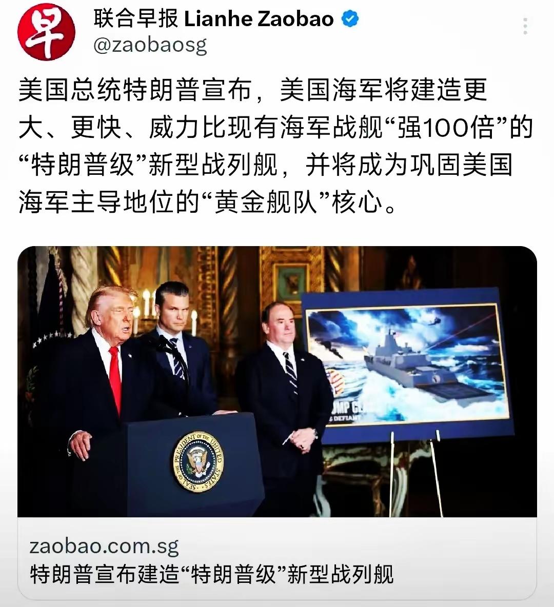 美国总统特朗普宣布,美国海军将建造更大、更快、威力比现有海军战舰“强100倍”的“特朗普级”新型战列舰,并将成为巩固美国海军主导地位的“黄金舰队”核心。 有人信吗? 这事若是放在往年,像美国的主流媒体除了肯定会大肆炒作渲染一番外,而且还会把它针对谁威胁谁直接说出来,但这次CNN对此事的报道就简简单单的一句话:“特朗普总统公布了美国海军舰队的新型战列舰,并将其命名为“特朗普级”战列舰。”CNN这种反常的“沉稳”显然是对特朗普的这项宏伟计划并不持相信态度。 从我们的角度看,特朗普说的3.5万吨的战列舰比现有海军战舰强100倍,那美国只要建造个五七八艘就可以横行天下啦。但是,若考虑到特朗普宣布的事很多但成的事很少的特点,比如24小时内结束俄乌战争;100天之内访问中国;给泽连斯基下了好几次通过割让土地换取结束俄乌战争的最后通牒等等这些事先宣布最后都没有实现的事,轮到这个“特朗普级”战列舰这个事上,能成吗?悬。 我们就当是老小孩自己哄自己玩儿吧,开心就好,开心就好。