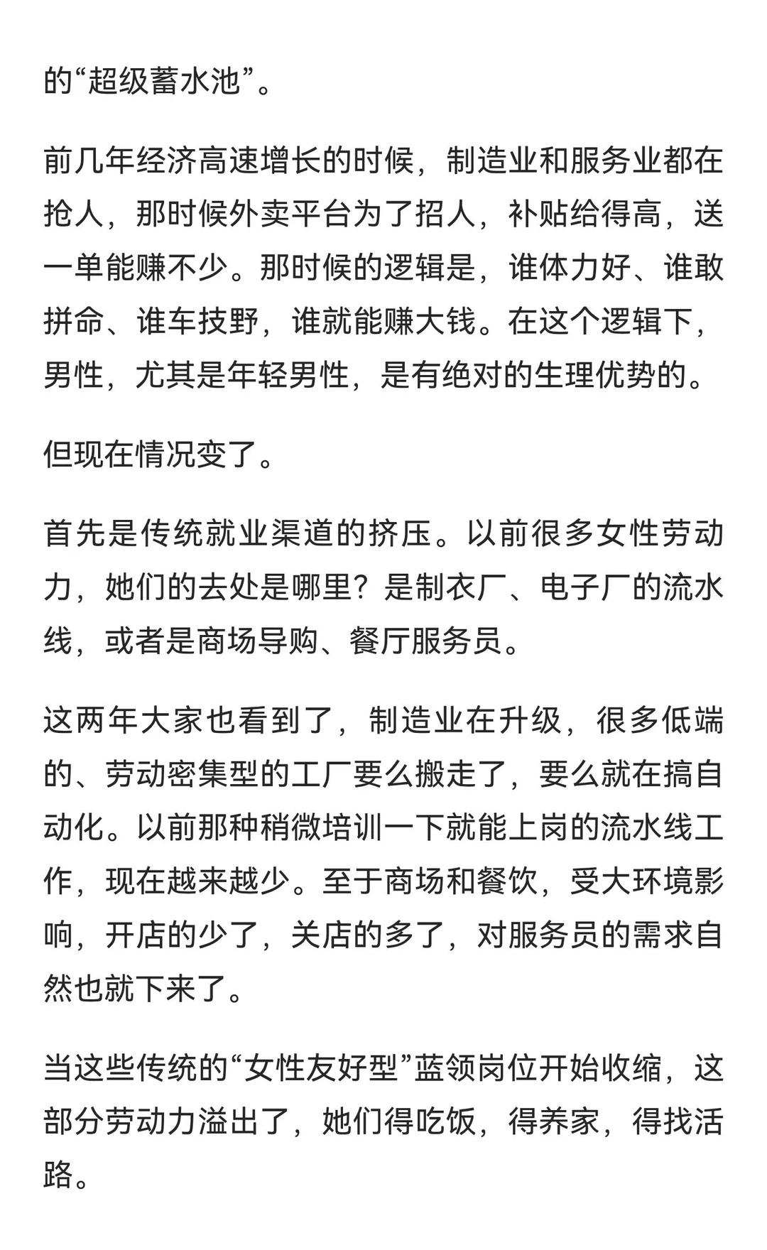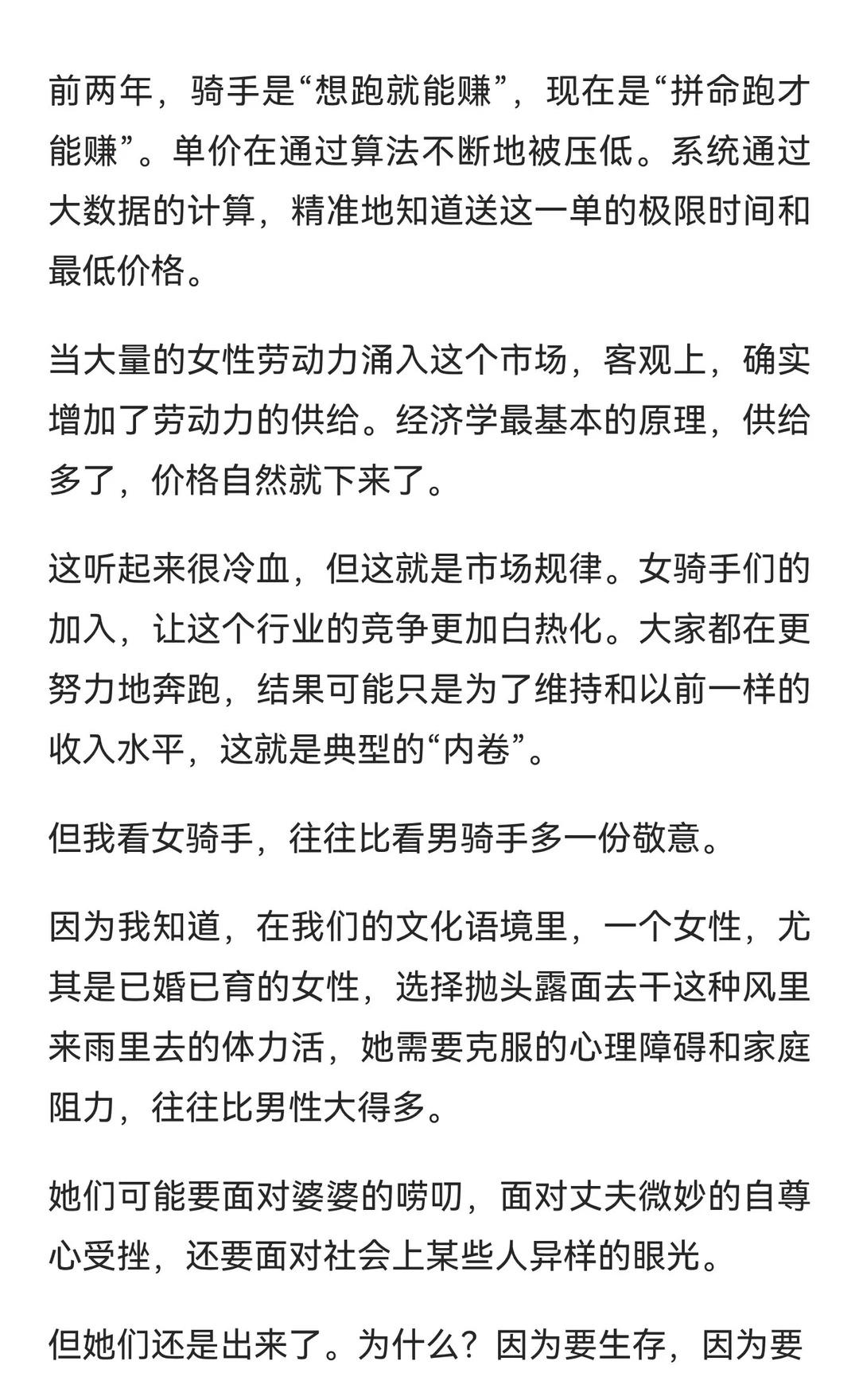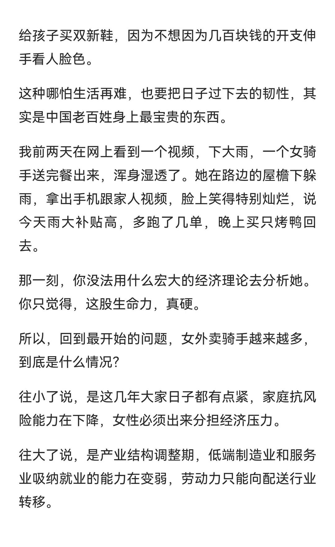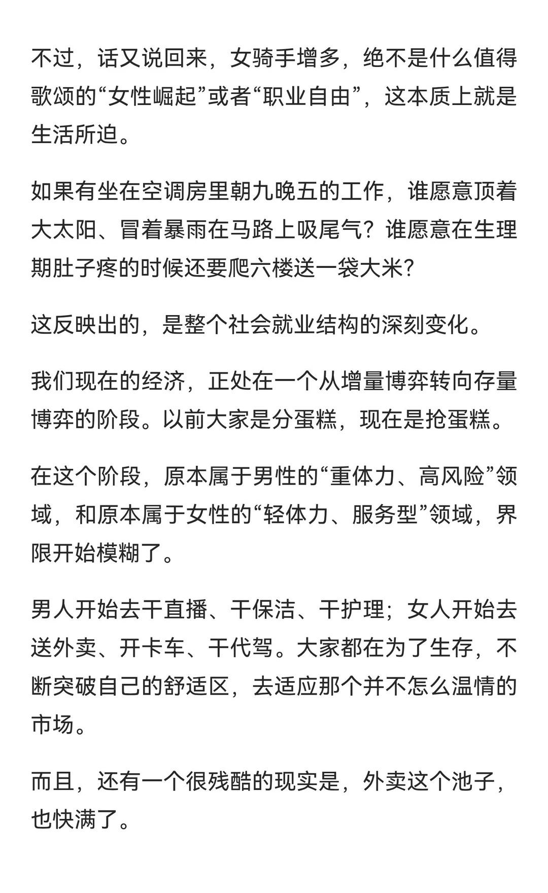 女外卖骑手越来越多,到底什么情况? 外卖骑手女性化是经济转型和社会变迁的缩影。传统就业渠道收缩,女性劳动力溢出,外卖行业门槛低且公平,成为家庭经济的重要补充。女骑手的加入加剧了行业竞争,反映了社会就业结构的深刻变化。