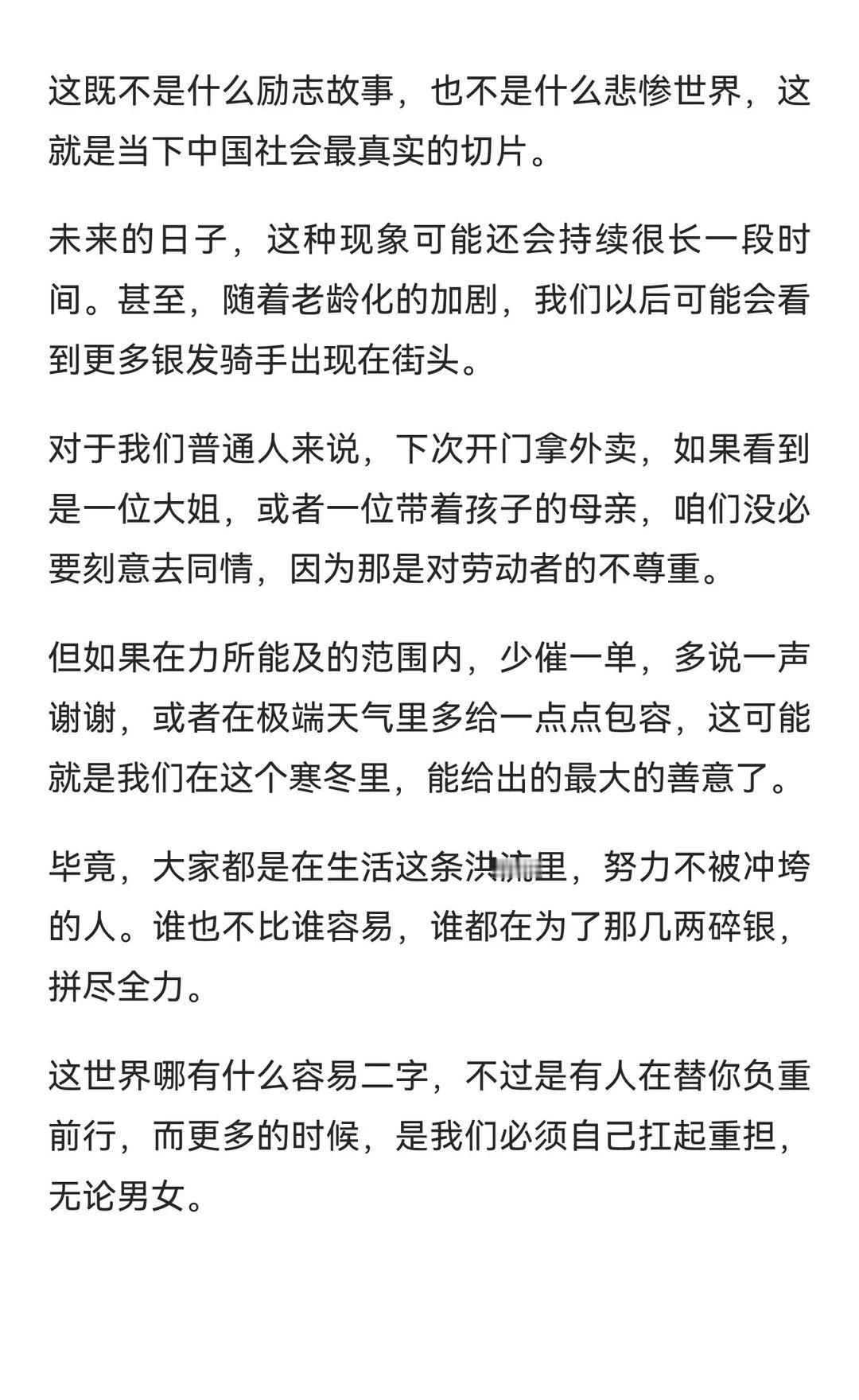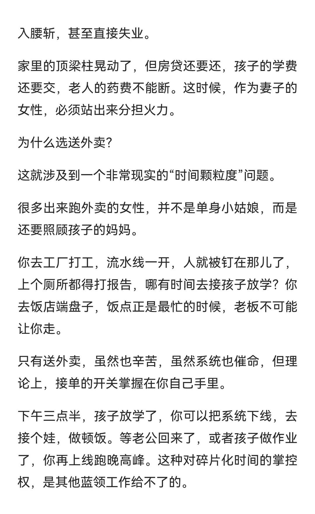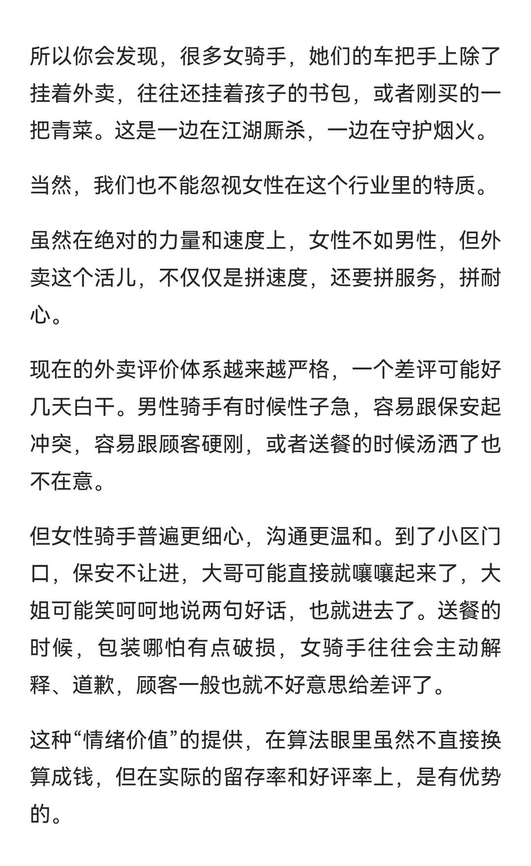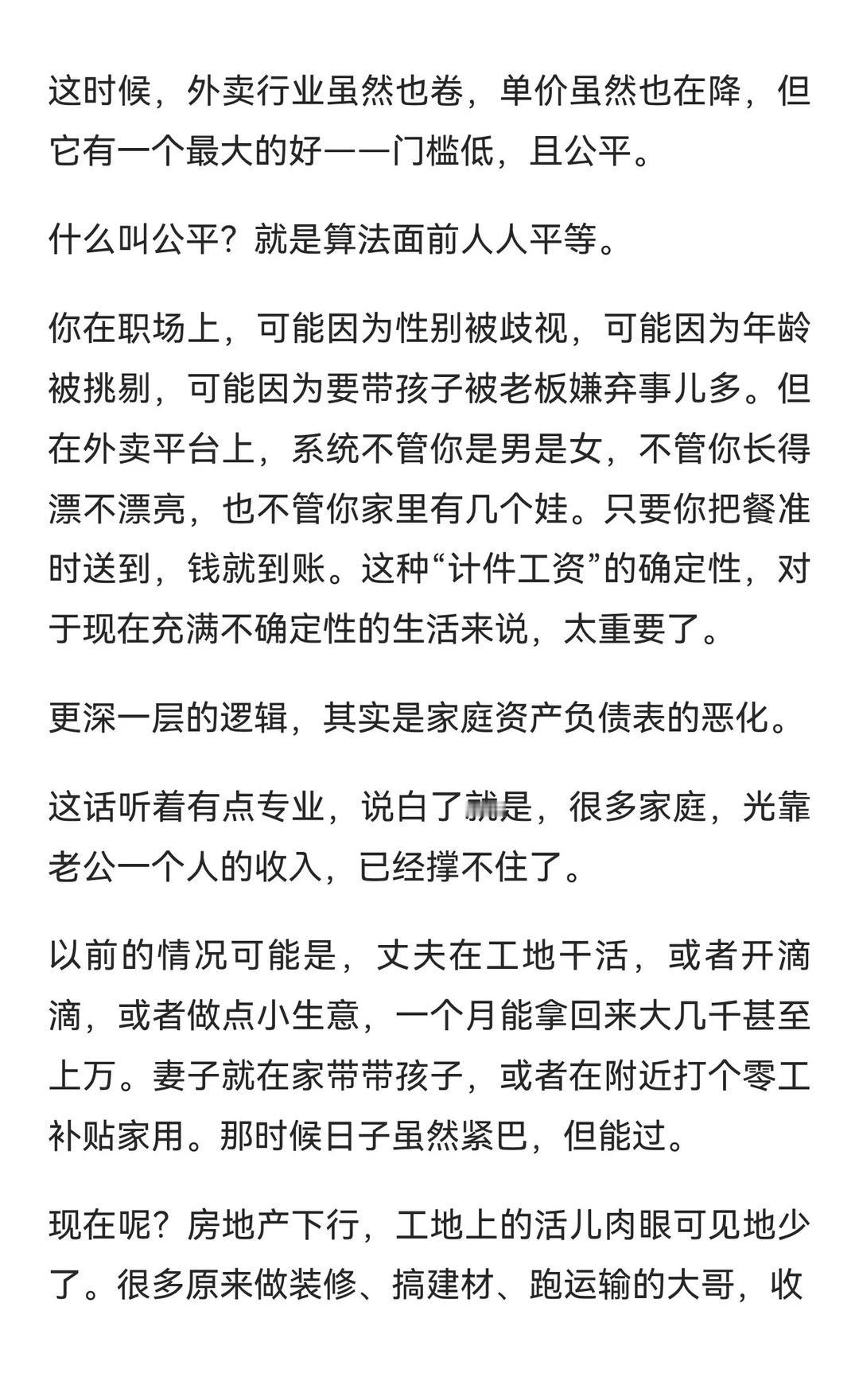 女外卖骑手越来越多,到底什么情况? 外卖骑手女性化是经济转型和社会变迁的缩影。传统就业渠道收缩,女性劳动力溢出,外卖行业门槛低且公平,成为家庭经济的重要补充。女骑手的加入加剧了行业竞争,反映了社会就业结构的深刻变化。