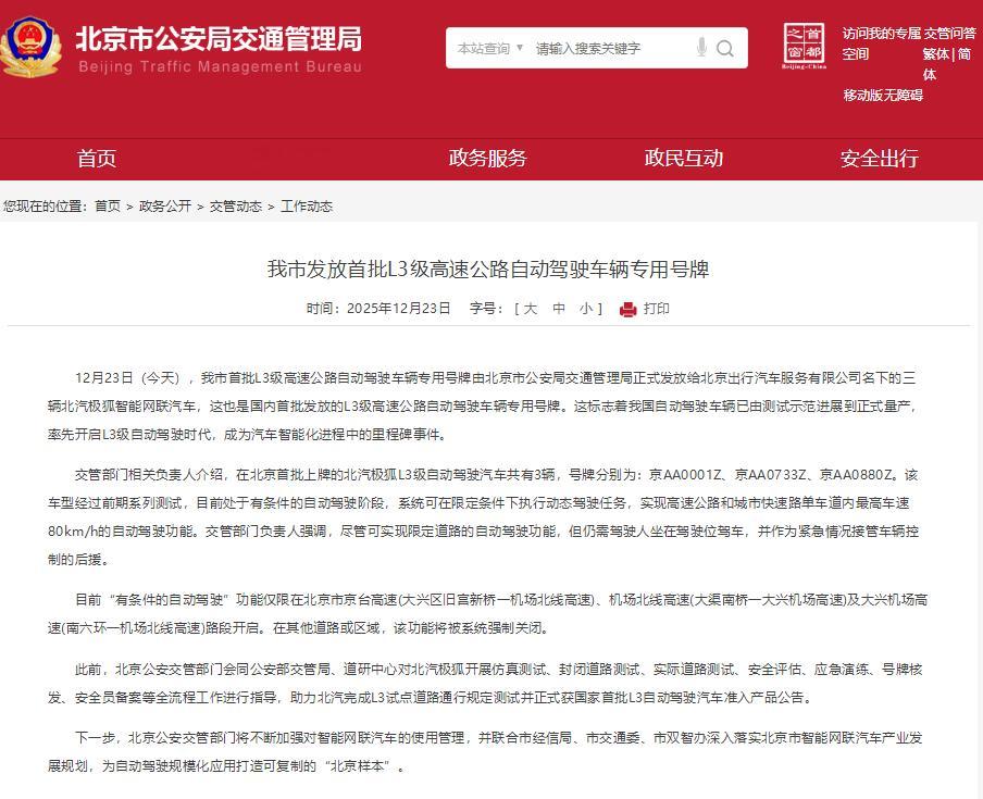 【北京发放首批L3级车辆专用号牌三个路段可开启】12月23日,北京市首批L3级