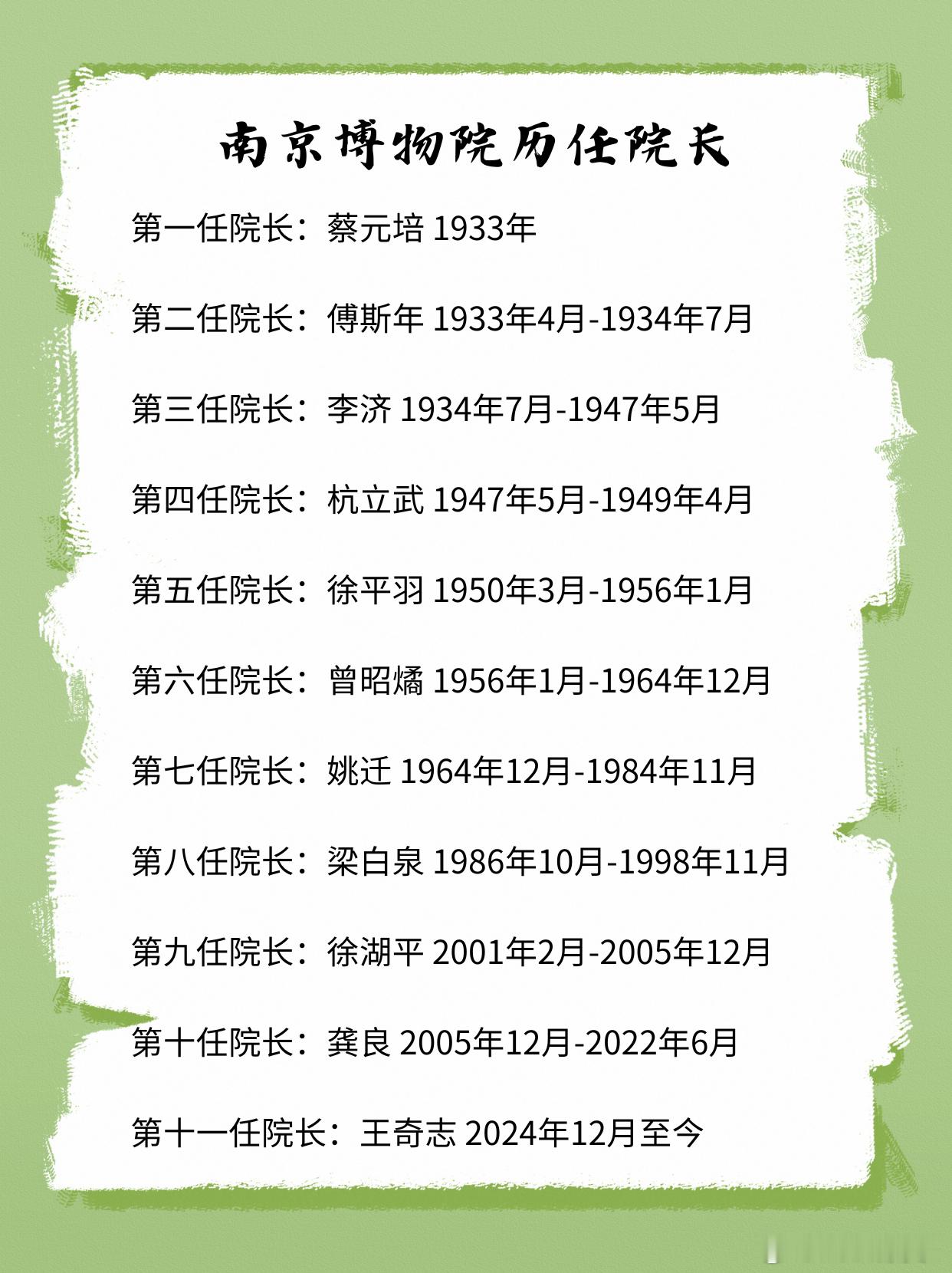 南京博物院历任院长第一任院长:蔡元培 1933年第二任院长:傅斯年 1933年4月-1934年7月第三任院长:李济 1934年7月-1947年5月第四任院长:杭立武 1947年5月-1949年4月第五任院长:徐平羽 1950年3月-1956年1月第六任院长:曾昭燏 1956年1月-1964年12月第七任院长:姚迁 1964年12月-1984年11月第八任院长:梁白泉 1986年10月-1998年11月第九任院长:徐湖平 2001年2月-2005年12月第十任院长:龚良 2005年12月-2022年6月第十一任院长:王奇志 2024年12月至今