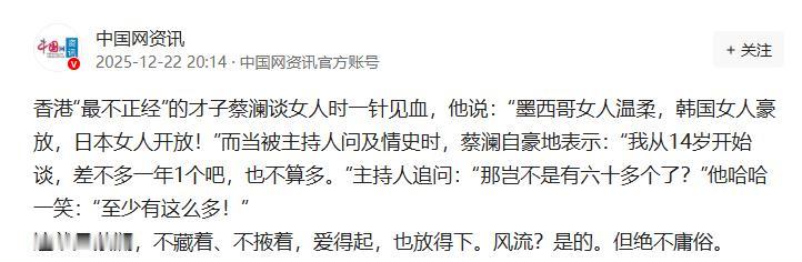 香港“最不正经”的才子蔡澜谈女人时一针见血,他说:“墨西哥女人温柔,韩国女人豪放,日本女人开放!”而当被主持人问及情史时,蔡澜自豪地表示:“我从14岁开始谈,差不多一年1个吧,也不算多。”主持人追问:“那岂不是有六十多个了?”他哈哈一笑:“至少有这么多!” 提起蔡澜,很多人都会想到“香港四大才子”的头衔,想到他谈美食时的头头是道,可这位被称作“最不正经”的才子,聊起感情话题来更是直白得让人惊讶。 在一档采访节目里,当被问到情史时,他半点不遮掩,直言“我从14岁开始谈,差不多一年1个吧,也不算多”。 主持人紧跟着追问“那岂不是有六十多个了?”,他哈哈一笑,爽快回应“至少有这么多!” 甚至蔡澜在谈女人时表示:“墨西哥女人温柔,韩国女人豪放,日本女人开放!” 可能有人觉得这是夸张的玩笑,但了解蔡澜的人都知道,他向来是率真坦荡的性子,这话也并非空穴来风。 这段对话出自他参与的一档访谈节目,后来被不少媒体报道过,算得上是他的真实心声。毕竟能说出这种不加修饰的话的人,本身就活得足够通透。 能这么潇洒谈论感情的蔡澜,可不是普通人物,他1941年出生在新加坡,祖籍广东潮州,后来定居香港,和金庸、倪匡、黄沾并称为“香港四大才子”,这头衔可不是浪得虚名。 年轻时的他留学日本学电影,后来进入邵氏、嘉禾等知名电影公司,监制过《快餐车》《龙兄虎弟》《一个好人》这些经典影片,成龙的不少代表作背后都有他的身影。 除了电影圈的成就,蔡澜还是个实打实的美食家。他自谦名字谐音“菜篮”,天生就和吃喝有缘。 从报刊美食专栏写起,他的食评真实不做作,不管是高档酒楼还是路边小摊,都能写出独特见解,后来还主持了《蔡澜叹世界》《蔡澜叹名菜》等热门美食节目,甚至担任过《舌尖上的中国》的总顾问,成了无数人心中的“美食向导”。 此外,他还写了200多部书,内容涵盖吃喝玩乐、人生百态,粉丝遍布各地。 这么说吧,蔡澜的一生就像一本精彩纷呈的书,感情经历只是其中一页。 金庸曾经评价他“是一个真正潇洒的人”,这份潇洒确实体现在他生活的方方面面。 他不把世俗的条条框框当回事,谈论感情时不扭捏、不回避,这种坦荡在当年的语境里,被很多人当成了风趣洒脱的表现。 不过放到现在来看,这样的言论难免引发不同的声音,有人觉得这是不加掩饰的真实,是活出自我的表现;也有人觉得,把感情经历当成谈资,用数量来衡量感情,显得有些轻率。 其实这也能理解,不同时代的价值观不一样,看待同一件事的角度自然不同。 蔡澜的这些话,更像是他对自己人生的真实复盘,没有刻意美化,也没有刻意隐瞒。 说到底,蔡澜这一生过得足够尽兴,不管是电影、美食还是感情,他都认真体验过、投入过。 他的这些言论之所以能被记住,或许不是因为内容多惊世骇俗,而是因为在很多人被世俗规则束缚的时候,他活成了自己想要的样子。 以上都是个人观点,对此您有什么不同的看法,可以在评论区留言讨论!!!