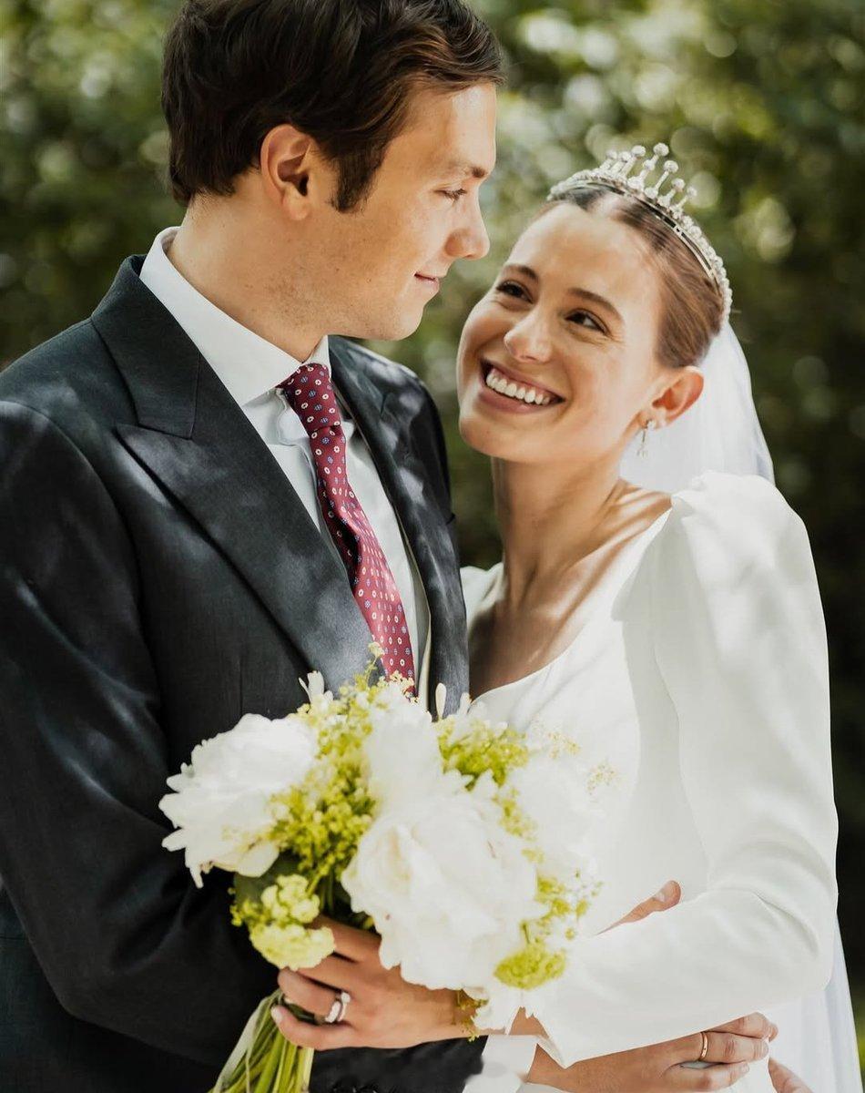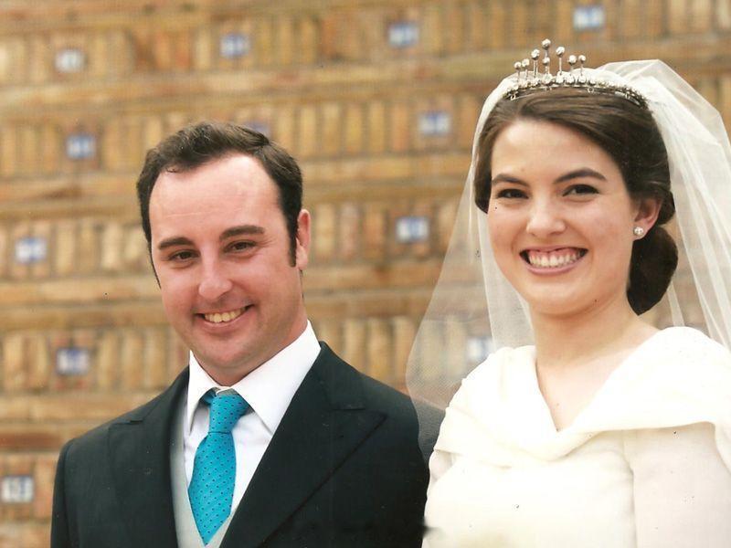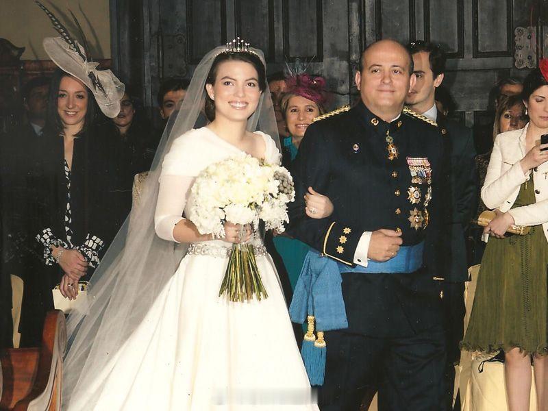 珠宝 属于西班牙阿布兰特斯公爵(&其他6个头衔)何塞·曼努埃尔·苏莱塔的钻石王冠,通稿资料说这王冠最早的主人是何塞亲妈,在他们家族基本为婚礼专用。何塞亲妈、老婆以及仨闺女结婚都用这一顶。长得略显奇怪和突兀,像糖块看着单薄,细看吧钻也不算小,设计真看不懂,拉远看全身氛围感搭救吧= =