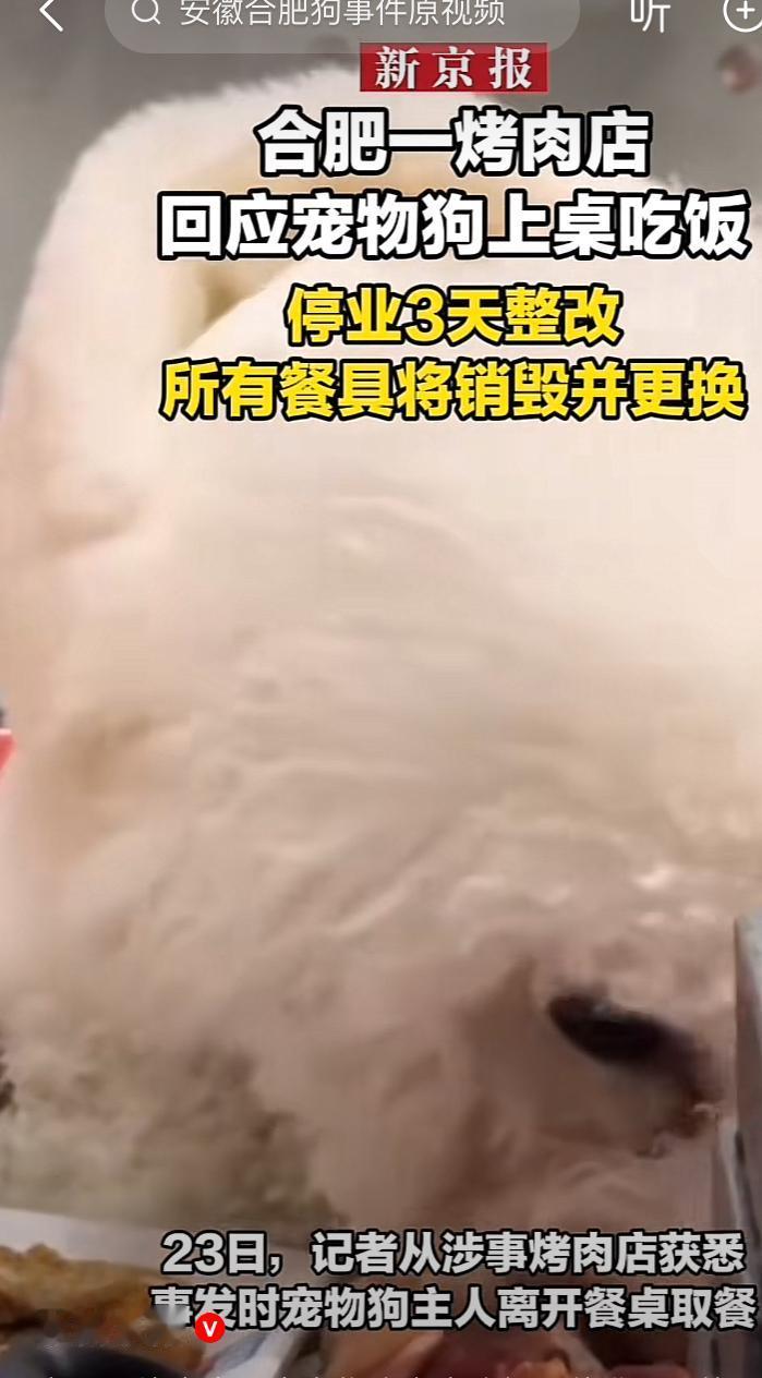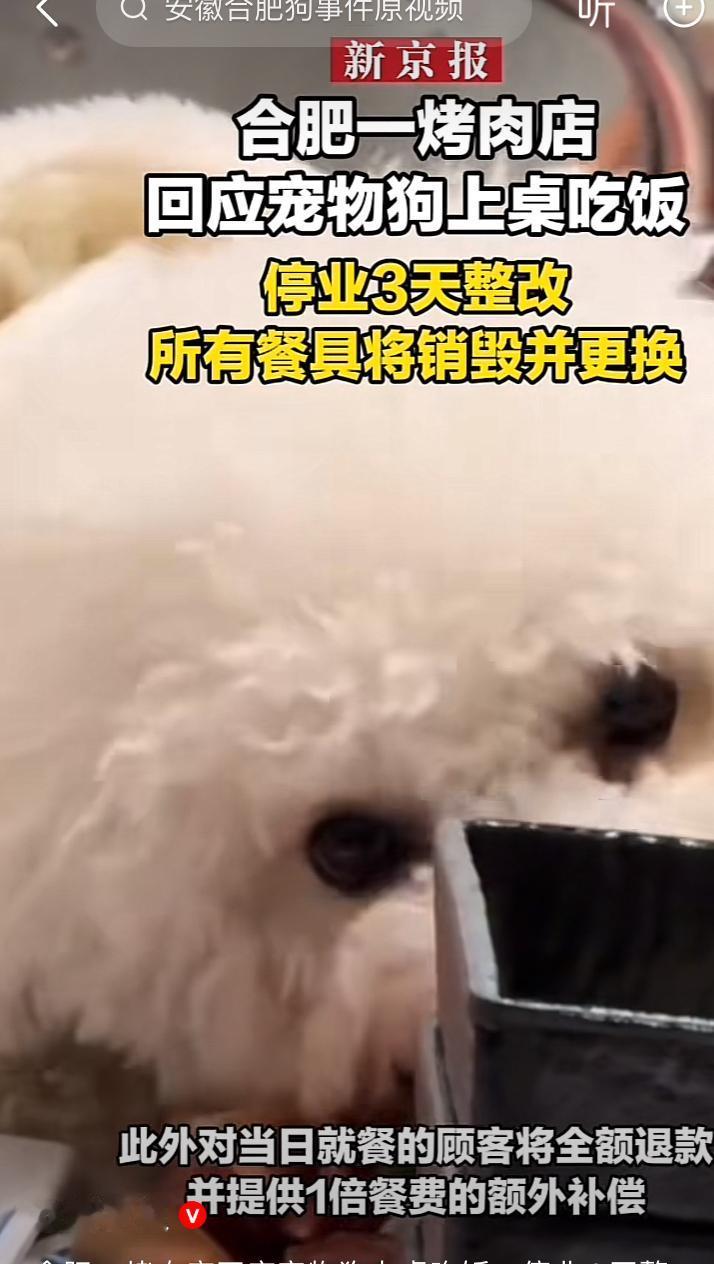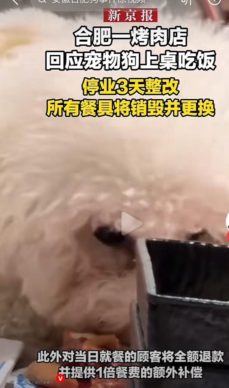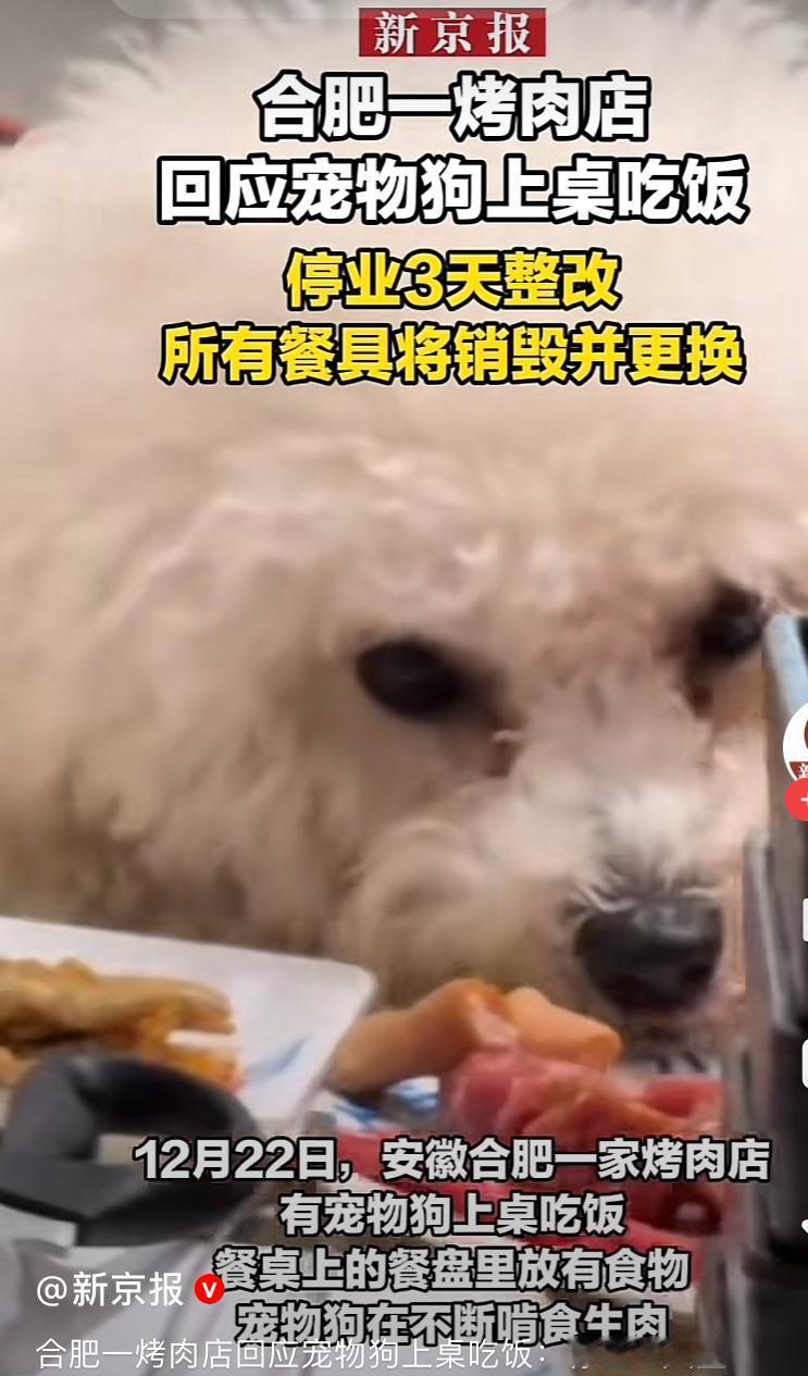 上次北京!这次合肥又出名了,🐶上桌吃饭治不了了吗? 北京狗上桌吃饭没过多久,合肥又有狗上桌吃饭了,直接在公盘里吃生肉,涉事门店承诺停业3跳进行整改并更换餐具,此期间吃饭顾客退餐费,并补偿1倍的餐费。 烤肉店说狗上桌吃肉时,主人离开去取餐,养过狗了都知道这狗毛病是惯的,打几次让它吃它都不敢吃,这狗肯定不止上桌一次了,可能在家经常上桌。 狗就不许带进餐馆里,必须立法进行约束, 不然狗患越来越严重了。