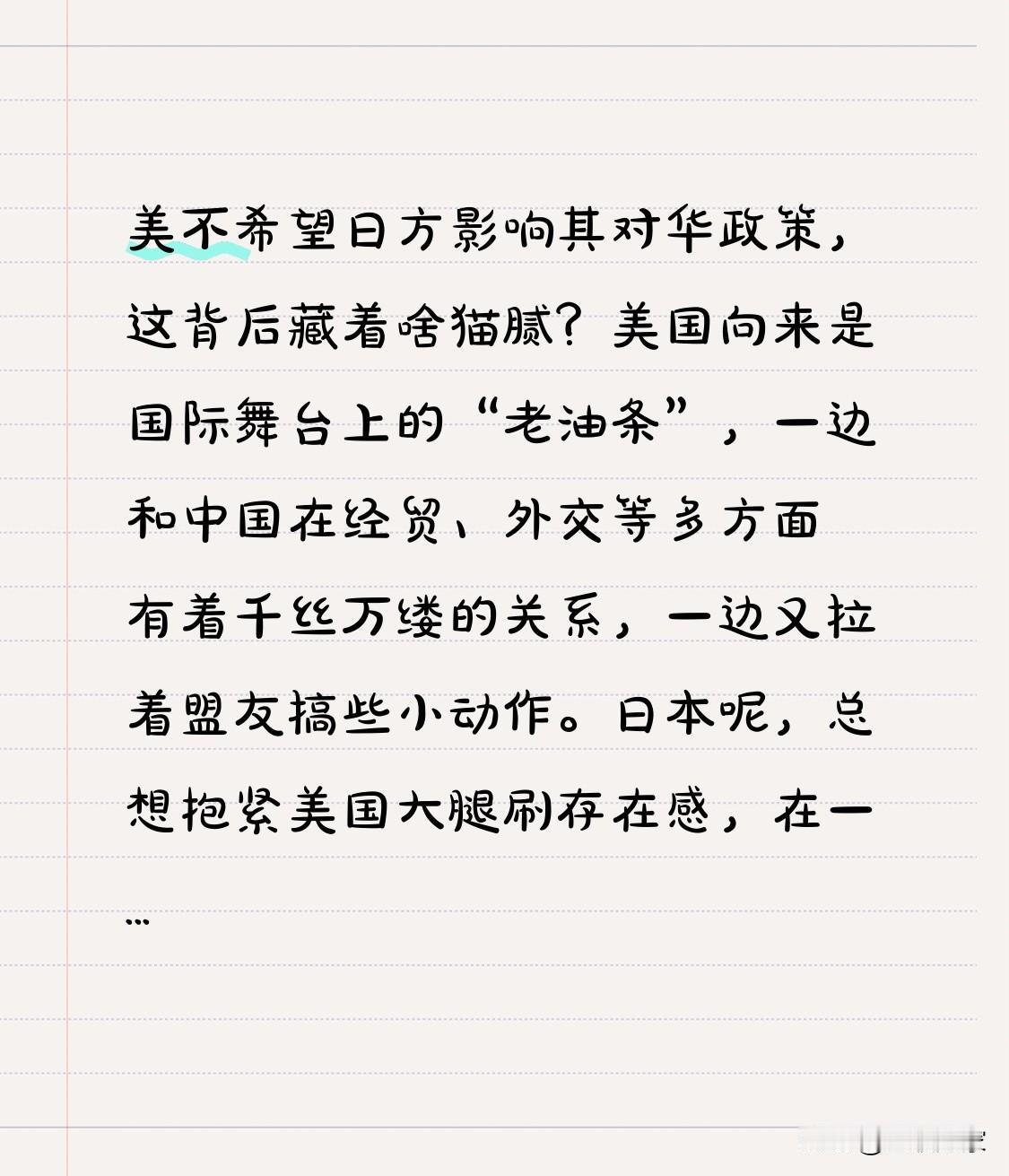 美不希望日方影响其对华政策,这背后藏着啥猫腻?美国向来是国际舞台上的“老油条”,一边和中国在经贸、外交等多方面有着千丝万缕的关系,一边又拉着盟友搞些小动作。日本呢,总想抱紧美国大腿刷存在感,在一些涉华问题上上蹿下跳。可美国心里清楚,要是日本太过分,把和中国的关系搞僵,最终也会影响到自己的利益。毕竟,中国市场这么大,美国企业可舍不得放弃。 这事儿就像一场复杂的三角戏码,美国既想利用日本当枪使,又怕这枪走火伤到自己。日本是会乖乖听话,还是继续我行我素呢?美国对华政策又会走向何方?中美日之间接下来还会有啥新剧情? 中方对日本态度 日本对美态度 日本对华外交 日本对外政策 日本对华贸易 美国对华关系 日本对华态度 日本对美态度 日本对华外交 日本对外政策 日本对华贸易 美国对华关系 美对华贸易政策