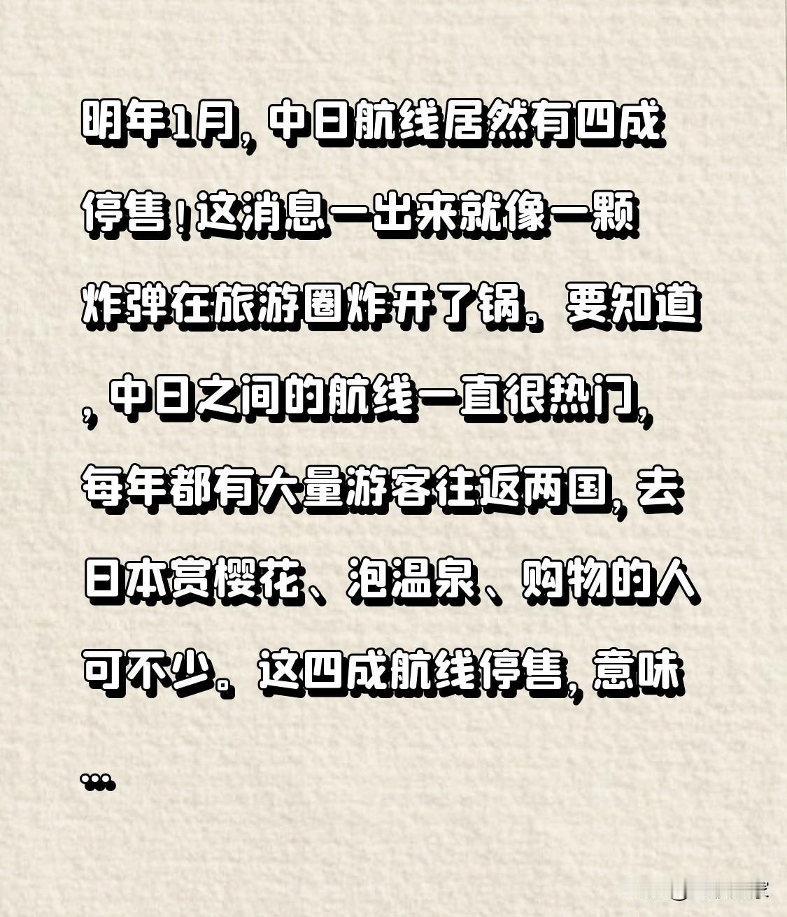 明年1月,中日航线居然有四成停售!这消息一出来就像一颗炸弹在旅游圈炸开了锅。要知道,中日之间的航线一直很热门,每年都有大量游客往返两国,去日本赏樱花、泡温泉、购物的人可不少。这四成航线停售,意味着很多人原本的出行计划可能要泡汤了。是因为市场需求减少,还是有其他隐情? 大家都在猜测后续会怎样,会不会影响机票价格,那些已经订好行程的人又该怎么办。这一系列问题都让人揪心。 大家觉得这次航线停售会带来哪些影响?你原本有去日本的计划吗?后续航线情况又会如何发展呢? 日本机票 日本国内航班 暂缓赴日旅游 直飞日本 中日航班停航 日本国内机票