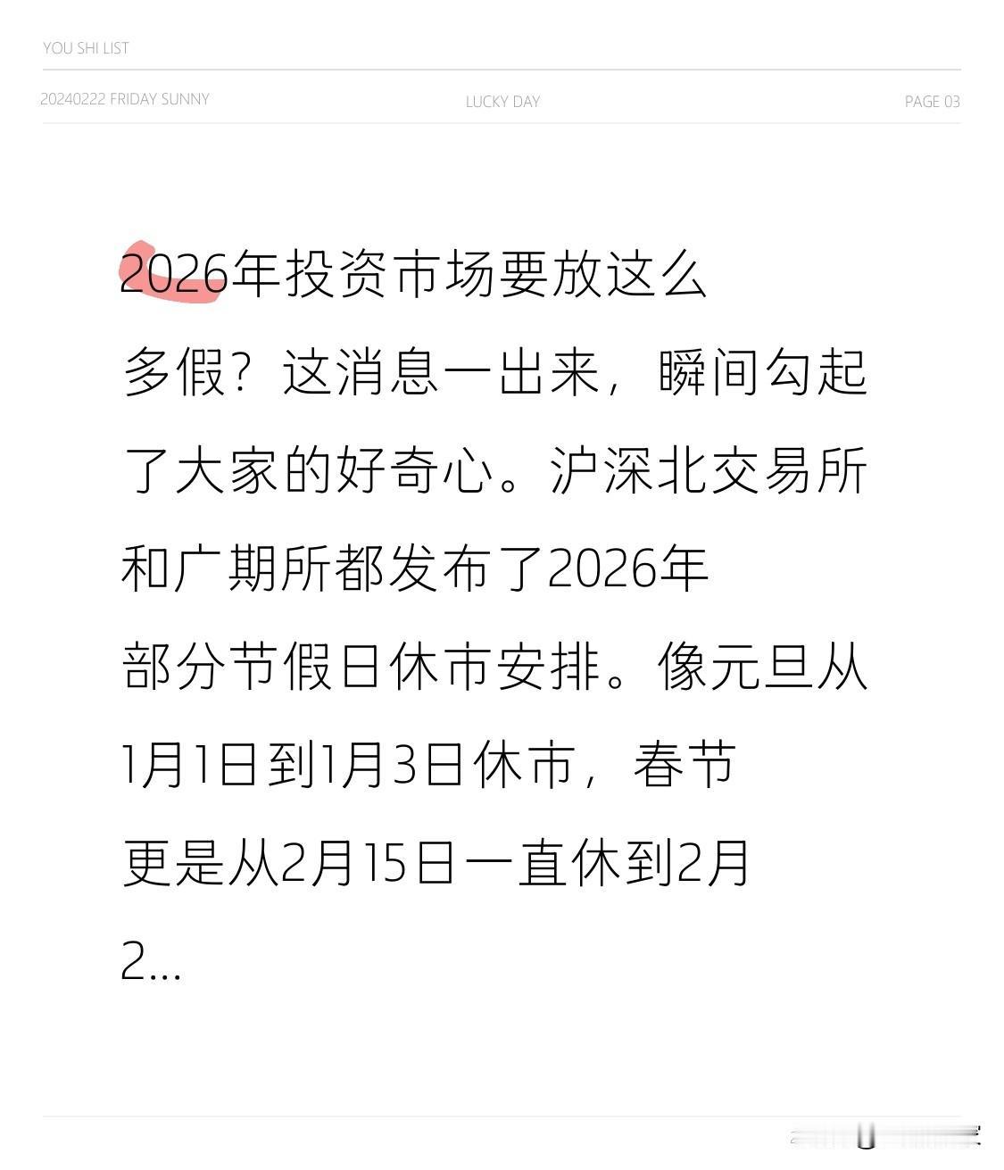 2026年投资市场要放这么多假?这消息一出来,瞬间勾起了大家的好奇心。沪深北交易