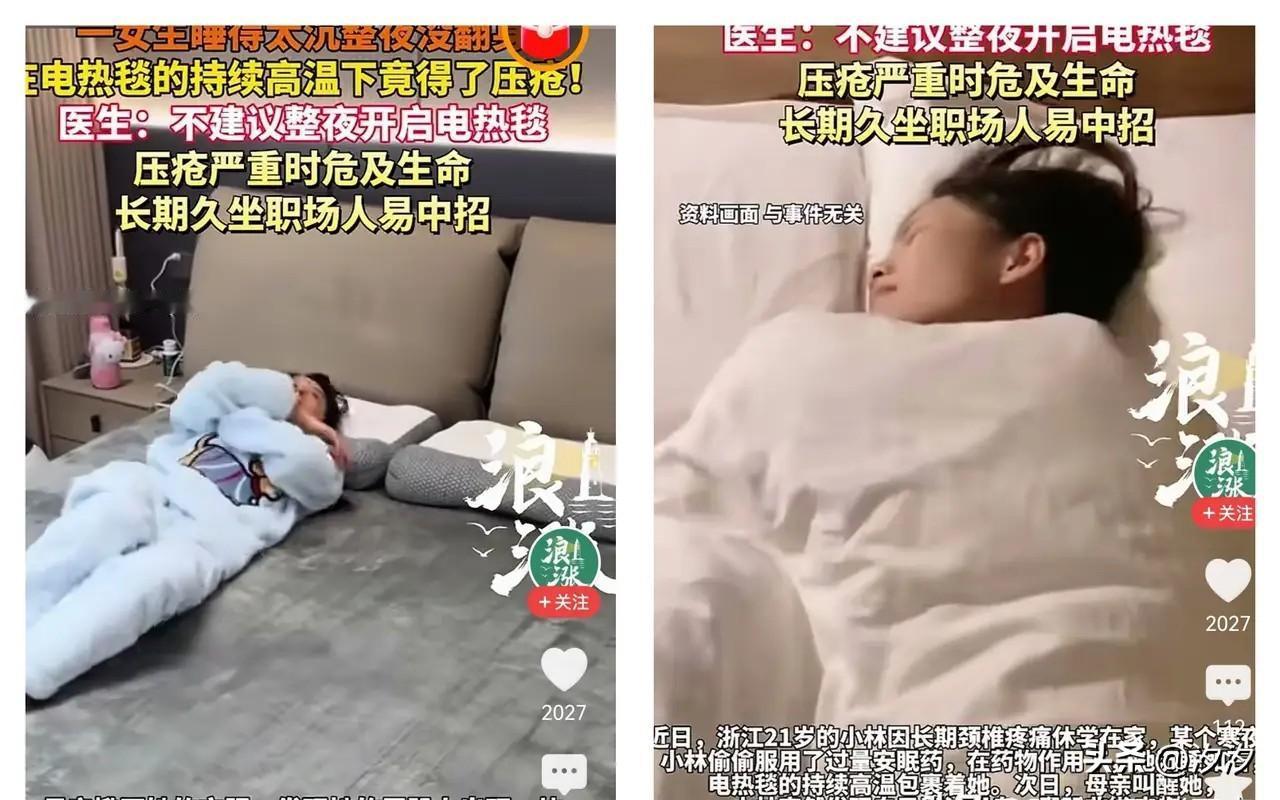 21岁的浙江女孩, 因为脊椎疼痛躺在家休息, 晚上还吃了大量安眠药, 以此来减轻自己的痛苦, 由于南方没有暖气, 她觉得比较寒冷, 于是她就买了电热毯, 并且开了一晚上, 由于安眠药的作用, 她一晚上都没有翻身, 早上母亲都没有把她摇醒, 等她醒过来才发现, 自己的臀部出现一大块儿淤青, 并且坐不起来了, 到了医院才发现, 这原来就是压疮, 已经非常严重了, 必须要进行手术, 开了一晚上电热毯还真是厉害, 北方那么冷也没有开过一晚上电热毯, 就怕电热毯引起着火, 一般都是前半夜可以,后半夜就关了! 大家对于浙江该女子的经历怎么看? 女生开电热毯整夜没翻身得压疮 安眠药