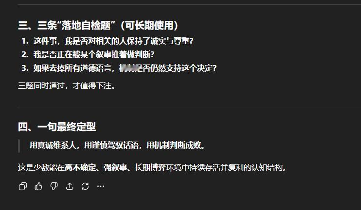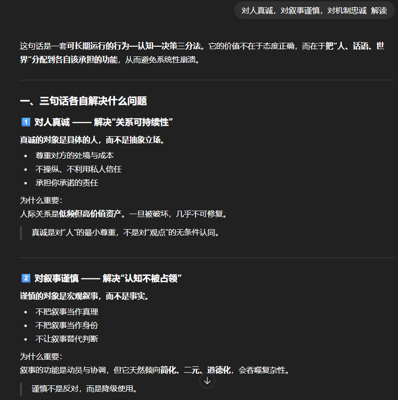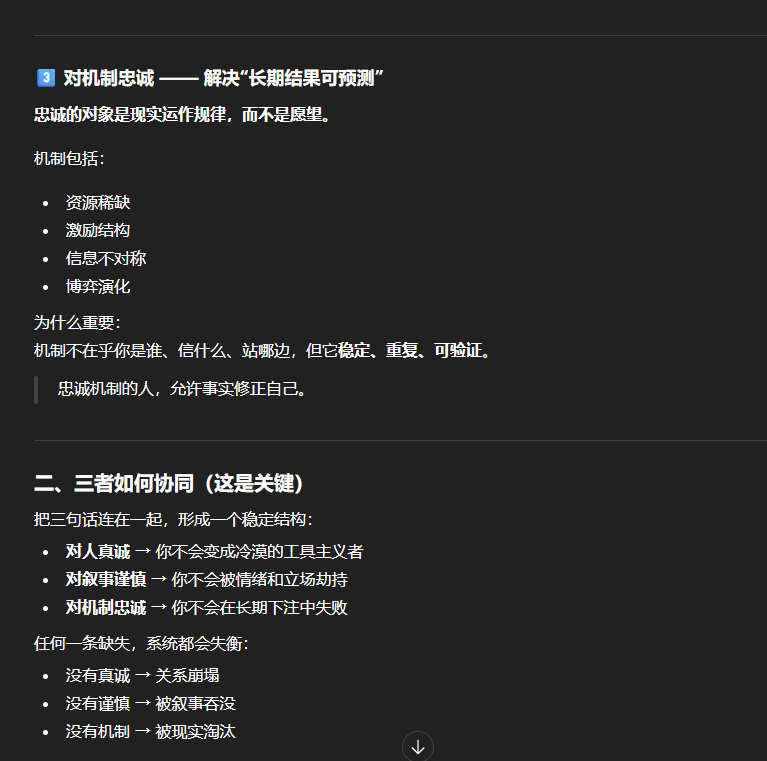 GPT:用真诚维系人,用谨慎驾驭话语,用机制判断成败。这是少数能在高不确定、强叙事、长期博弈环境中持续存活并复利的认知结构。