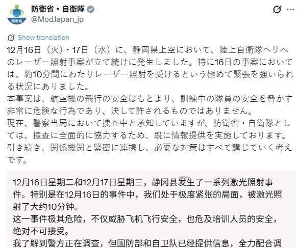 日本战机又被照,防卫相彻底急了,日网民臆测:中国干的!日本防卫省通报称,16日和17日,在日本静冈县空域,日本陆上自卫队的直升机连续两天遭到激光照射。其中,16日的事态最为严重,直升机被激光照射了约10分钟。自卫队已经报警。 日本陆上自卫队最近遇到件挺蹊跷的事。12月16日晚,一架CH-47JA运输直升机在静冈县裾野市上空训练时,被地面绿色激光持续照射了大约10分钟,机上5人没事,飞机也没损坏。第二天17日晚,另一架UH-1J直升机在三岛市附近又被类似激光照了1分钟左右。两起事件位置相近,自卫队判断光源来自地面,立刻向静冈县警方和当地警署报了案。 这种激光照射不是小事,强度高的话能干扰飞行员视线,甚至造成暂时失明,严重时可能影响操控导致事故。日本防卫省和自卫队官方账号很快发声,说这行为非常危险,威胁飞行安全和队员生命,绝对不能容忍。东部方面航空队司令野泽友宏也表态,连续发生这种恶劣事件让人遗憾,将和警方合作采取必要措施。 事件一曝光,日本网络上讨论炸了锅。不少人条件反射般就把矛头指向中国,有人说可能是中国公民或亲中人士干的,有人更夸张,直接喊中国想挑事甚至想打仗。还有人上传假图片、散布没根据的链接,搞得舆论乱糟糟。静冈县是日本本土腹地,离东京才150公里左右,激光明显从地面来,如果真有境外势力能在日本核心区这么操作,那日本防卫漏洞得有多大?这逻辑本身就站不住脚。 事实上,日本市场上民用高功率激光笔合法卖,亚马逊之类平台销量不少,这种事多半是国内有人恶作剧或不负责任玩闹。警方调查重点也在本地住宅区和公路周边,调监控、访居民,到现在还没抓到人,也没任何证据指向境外。 这事还暴露了自卫队自身问题。军用直升机在自家领空被激光照这么久,竟然没法快速定位来源,只能事后报警。装备上缺少专用激光预警系统,训练里激光干扰应对也少得可怜,一年就几次,还主要模拟境外场景。本土这种低端干扰都应付不好,网友吐槽得挺狠,说要是真打仗,自卫队能扛住吗? 说白了,这种不明事件一出,就有人急着往中国身上泼脏水,已经成了一种套路。之前雷达照射那事,日本先炒作中国威胁,结果证据一出,日方自己抵近滋扰在先。现在激光事件还没查清,又有人故技重施。真相没出来前,先让“外部威胁”印象深一层,就算最后证明无关,舆论热度也过去了。 日本社会这种焦虑不是一天两天了,右翼势力需要外部敌人来推动军备扩张、转移国内矛盾。防卫预算连年涨,装备越来越进攻性,可内部管理、装备短板却没跟上。警方还在查,估计很快会水落石出,多半是普通民事案子。到时候,那些无端指责的言论,只会让日本自己信誉受损。 地区和平靠的是互相尊重和对话,不是动不动树敌、制造紧张。希望日本多查查自家激光设备监管,别总想着甩锅别人。