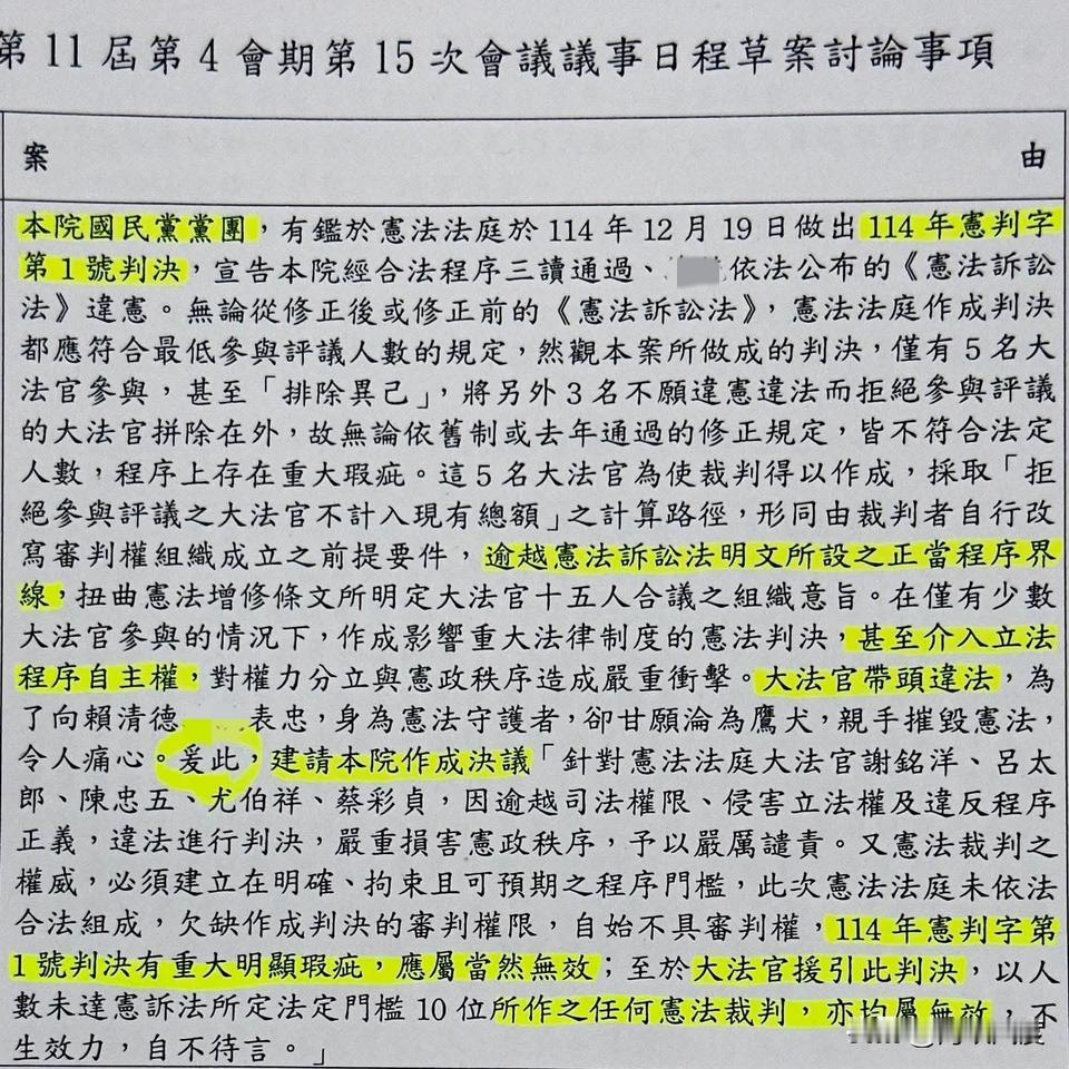 国民党团与海峡风度在以立法层面宣告“宪法法庭”对“宪诉法”所作的违宪判决无效不谋而合!但有两点论述建议修改。 决议草案同时宣布,今后未达法定门槛组成的合议庭所作的任何裁判具不均效力。决议草案与海峡风度之前的呼吁,在头条发表的意见主旨基本相同。 但我对决议草案两点表述不予认可,建议修改。 一是草案说,即使依旧制作成判也需6人同意,而非5人。对此本人认为,根本无须提到旧制,因为旧制已彻底失效,国民党团的退一步说实际是落入了民进党的陷阱。一来相当于承认旧制是有效的,二来如果旧制有效就给民进诡辩提供了空间,即缺席的三位是自行回避,如根据旧制,回避法官不计入应出席总额,所以根据5席的三分之多数决,4位法官即可作成判决。所以如提旧制,民进党就这样诡辩。 所以国民党要锁定立场,旧制彻底失效,无适用之空间,只能适用新制,10人出席,9人同意方可通过违效案。不给两可论述之空间。 因此在非正式官方场合旧制适用问题可以拿来辩论,但如作成正式立法层面具有法律效力的正式文件,就不要用二分法,退一步说等论述。 其次我不同意决议草案中提到的程序“重大瑕疵”的论述,这不叫重大瑕疵,这叫重大违法违“宪”,用瑕疵,其程度太轻,即使前面加上“重大”二字,他还是瑕疵,而瑕疵是可以补正的,不必然导致结果无效。只有程序重大违法,才会导致裁判无效认定之理由。因此建议将草案中的“重大瑕疵”改为“重大违法”! 所以还特请头条好友 @罗智强台灣 @唐湘龙在台湾 @台湾钮则勋教授 @杨永明台湾 @赖岳谦TV @陈凤馨台湾 @谢寒冰台湾 @郭正亮台湾 @侯汉廷台湾 @游梓翔 @蔡正元博士 将@海峡风度 之建议转告国民党立院党团,以供诸位斟酌!