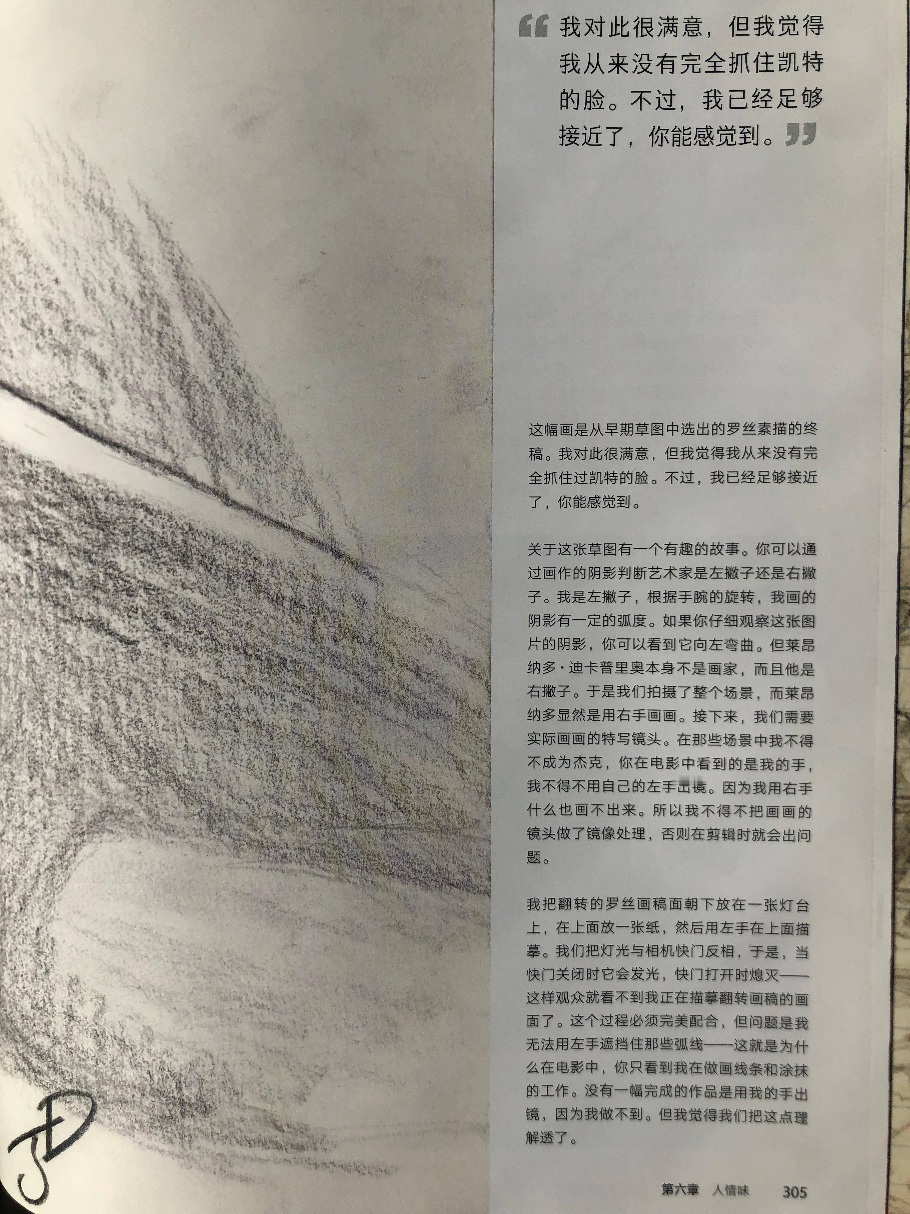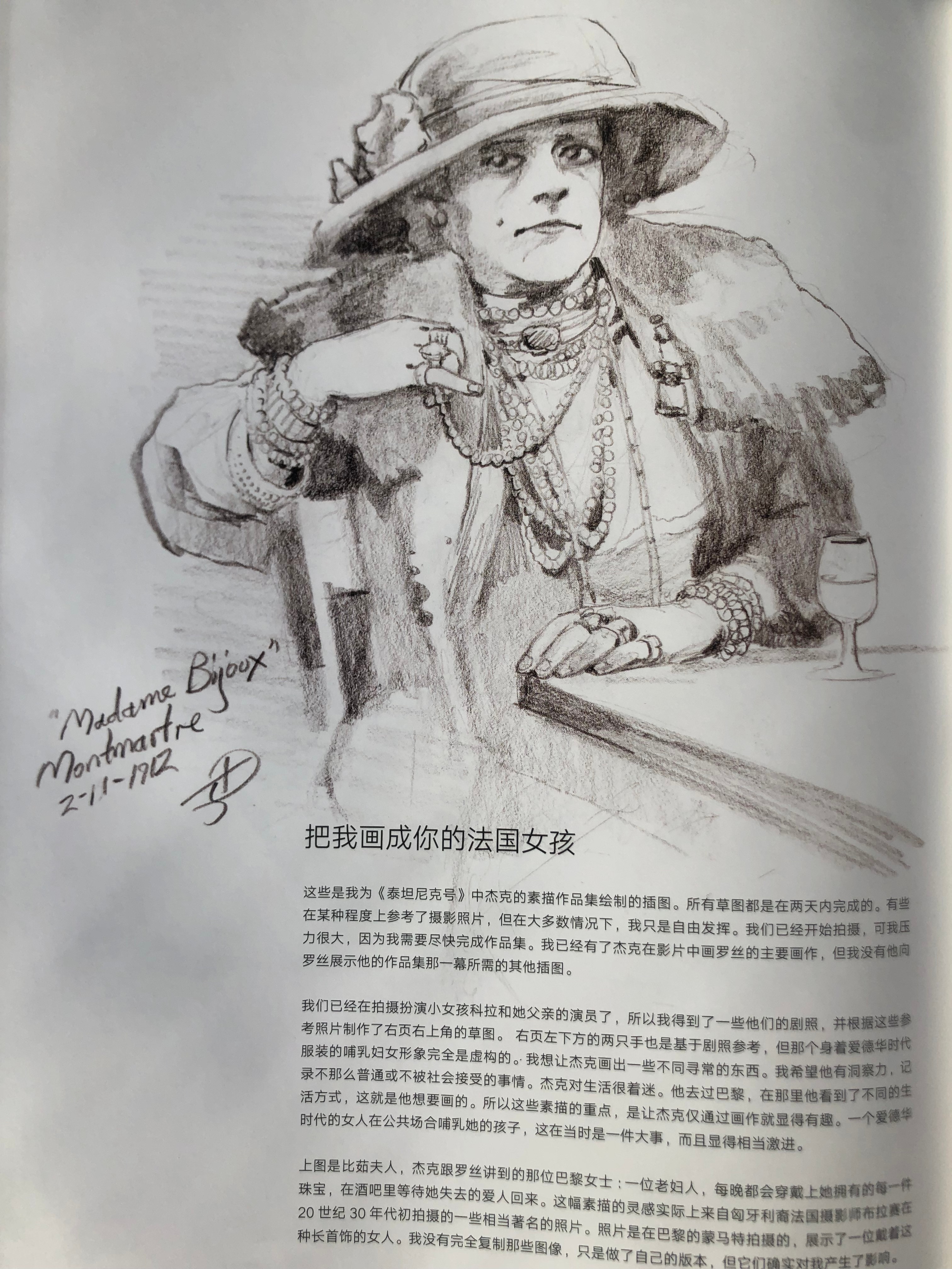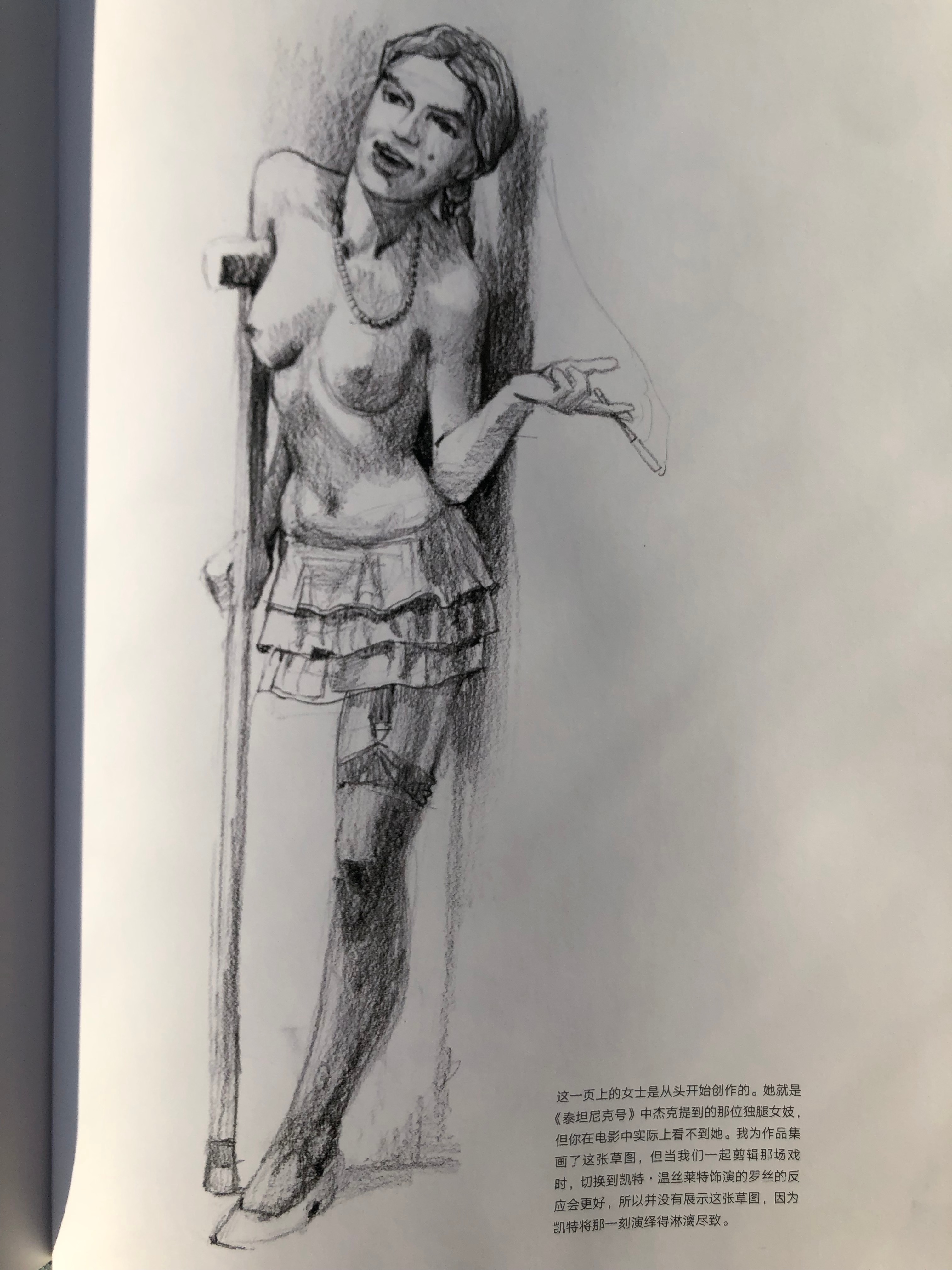 TNABO 杰克给露丝看的素描集,虽在片中没有展示出来,但不光真实存在,还是从小喜欢画画的卡车司机在两天时间内赶出来的作品。卡梅隆绘图时参考了电影的一些剧照(拍乘客的),或是历史上的一些照片。不过那张独腿女妓的画像,是卡梅隆自己想出来的。他没在片中展示这张画,是因为他觉得光看凯特·温斯莱特的表演就足够了。杰克画露丝的素描,也是出自卡梅隆之笔。他说最难画的不是胸部,而是手部,因为那是体现个体特征的关键。摘自《詹姆斯·卡梅隆 : 我是如何拍电影的》,电子骑士翻译