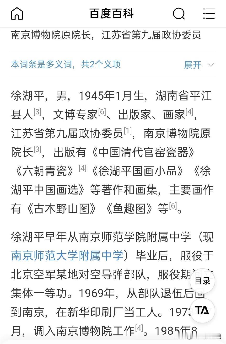 从百度百科来看,南京博物院前院长徐湖平算是一个旷世奇才 想一下,徐湖平院长是从普通战士立功之后转业为一般工人之后,才调入南京博物院的 但是徐湖平院长自进入南京博物院之后,勤学精炼,一路走来,不仅专业知识有成,不仅成为文博专家,而且还是著名画家 这么多年,他在南京博物院任职的路上,从普通员工到院长,出版多部专著,而且还有个人画选出版,可谓是才学多面手 从外行到专家,以至成为如今举世瞩目的重要人物 80多岁的高龄,荣退多年的徐湖平,做梦也没有想到一夜之间,自己成了一桩热门绕不过去的知名人物 但是,从公布的履历来看,徐湖平确实算是一个不可多得的人才,堪称一代旷世奇才