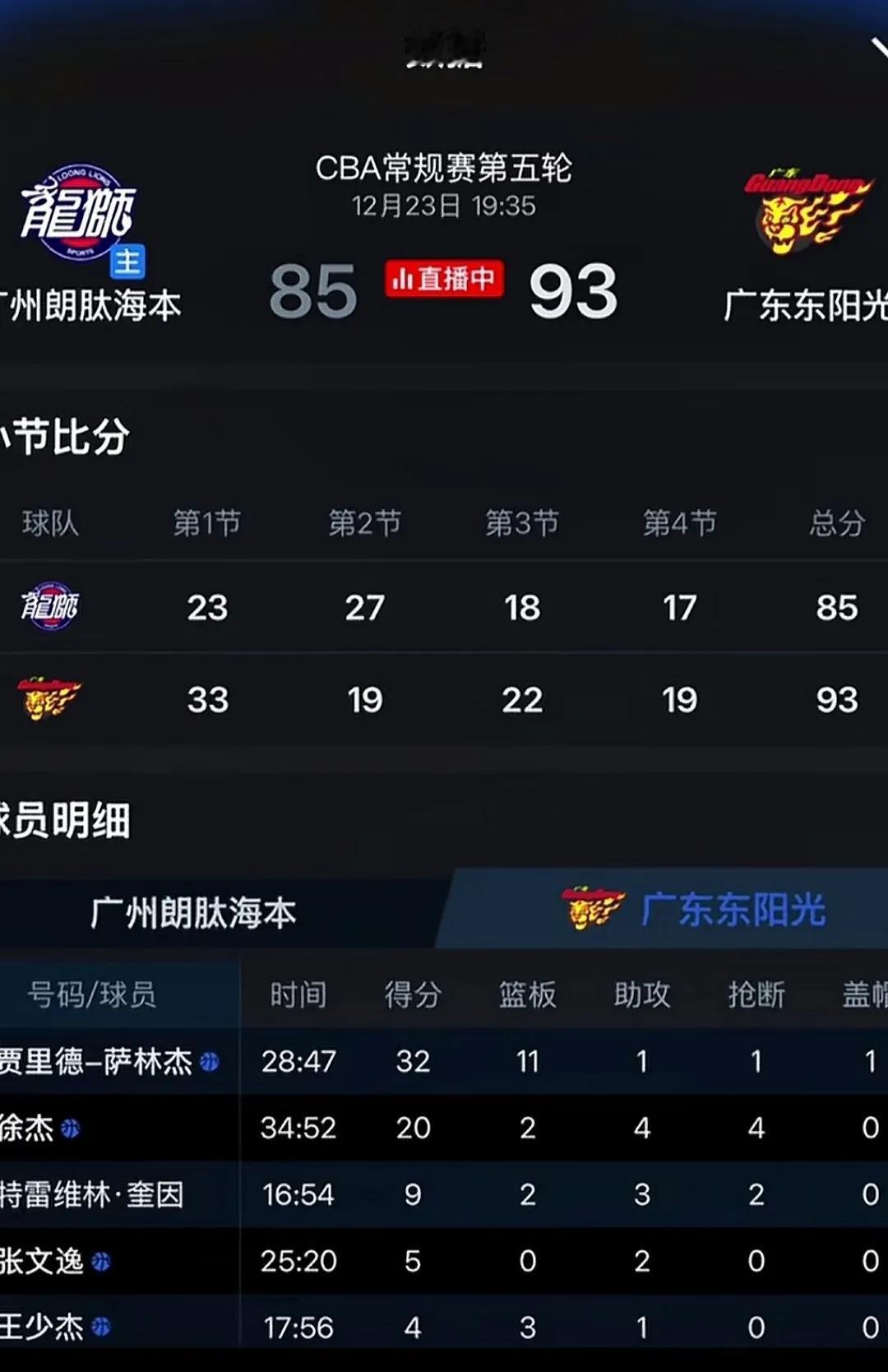 广东客场93-85战胜广州。 四节可以用四句话来概决。 第一节33-23,顺风顺
