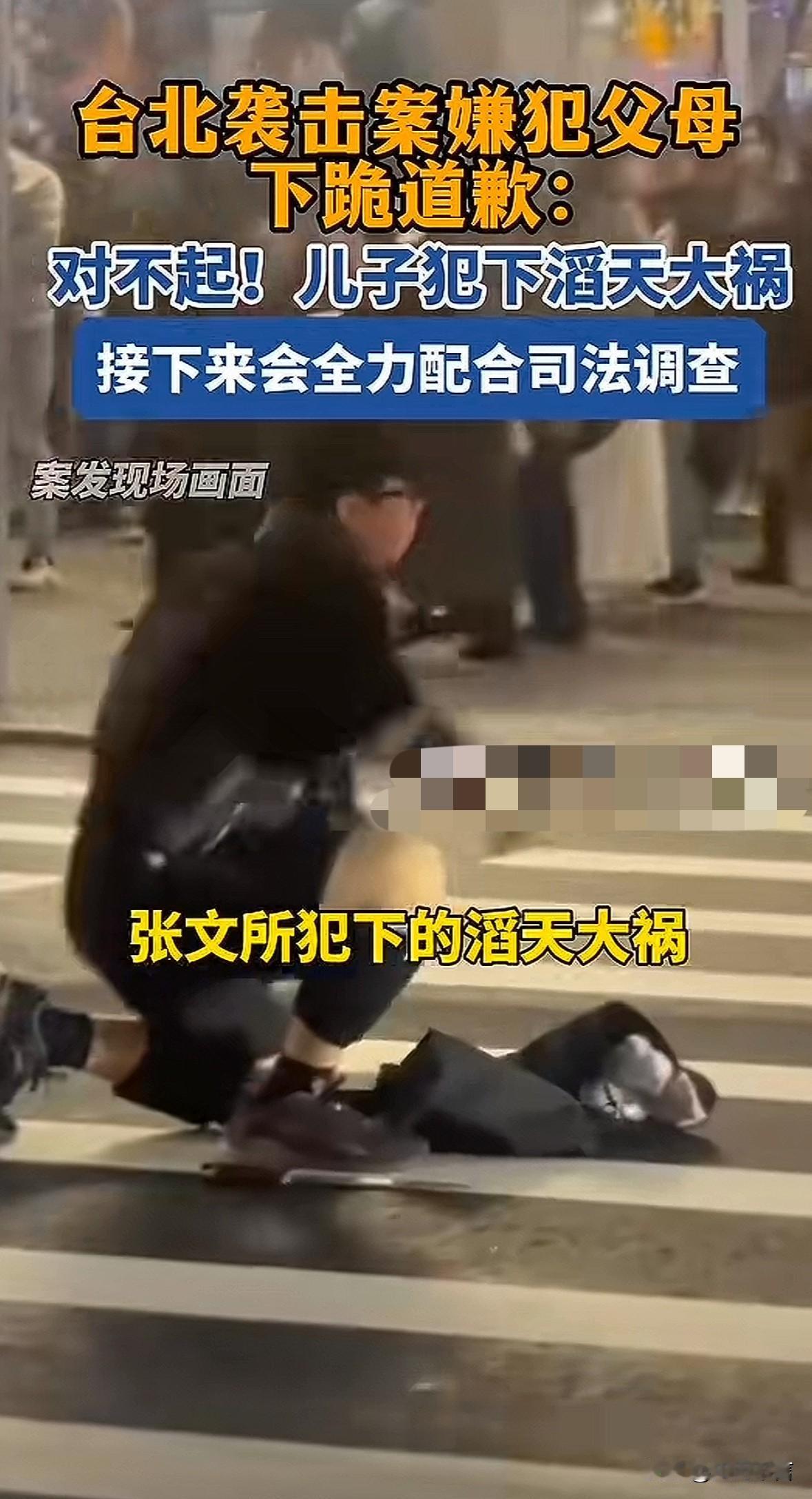 台北“张文”父母下跪道歉,说儿子犯下了滔天大祸,他们对受害者说“对不起” 但张文已经是成年男子了,而且已经多年不跟家人来往,其实他的所作所为并不需要父母去受过,但他的父母还是站出来了 都说儿女是父母前世的债,即便再不孝的儿女,在父母眼中都是自己没教好,所以他们的过错也有自己的一部分责任 为人父母太不容易了,希望天下的儿女们都能体谅下父母,不要做让他们伤心的事!张文 台北 台湾